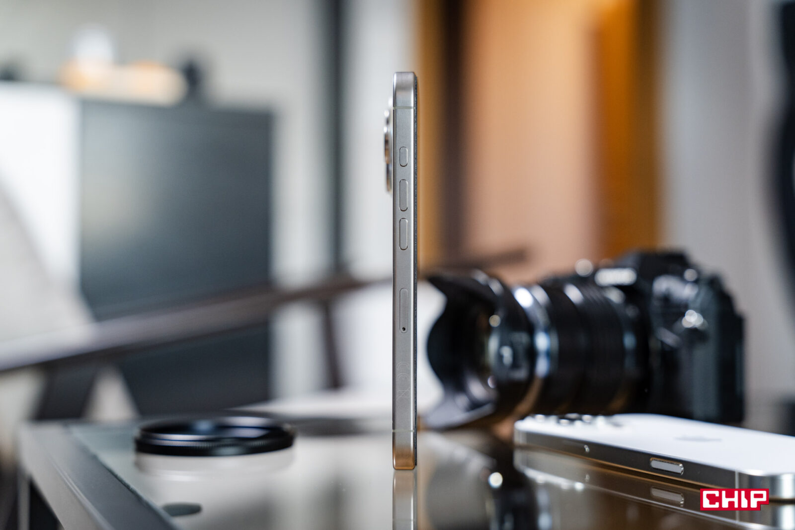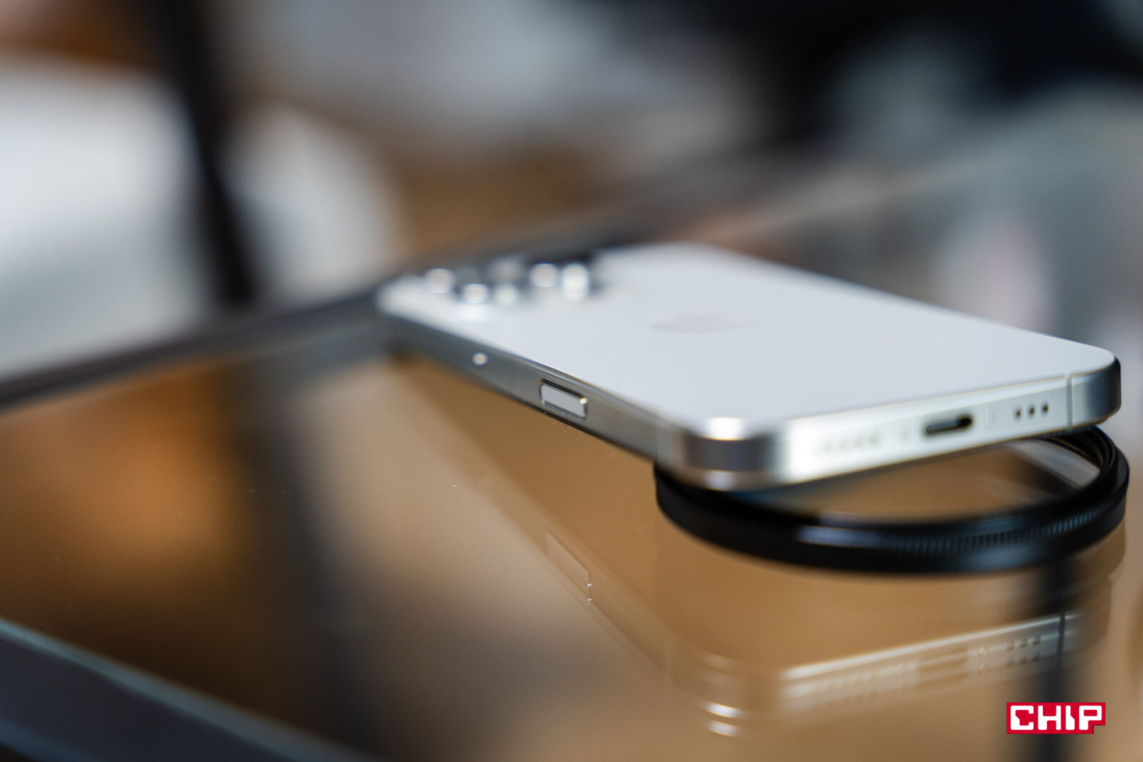 Jakiego podejścia byśmy do Camera Control nie mieli, to trzeba mu oddać, że jest to niezwykle intrygujący przycisk. Nie wystaje on w ogóle z bocznej ramki i jest wykonany nie z tytanu, a z szafirowego kryształu, dzięki czemu jego zarysowanie jest naprawdę trudną misją. Ciekawe jest również jego działanie — reaguje on bowiem zarówno na lekkie naciśnięcie, jak i faktyczne przyciśnięcie go, a także posiada czujnik umożliwiający interakcję za pomocą gestów. Pozwala on na szybkie uruchomienie aparatu, zrobienie zdjęcia czy nagranie filmu, ale możemy nim również dostosowywać takie parametry jak zoom, ekspozycja czy głębia ostrości.