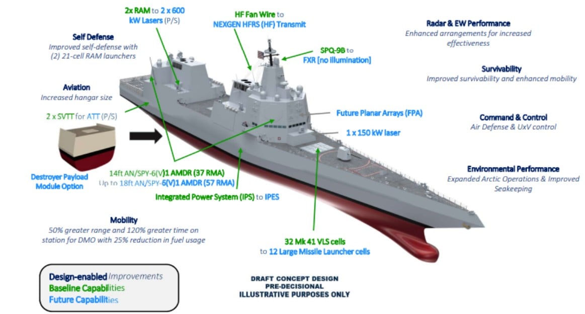 Obecnie projekt DDG(X) znajduje się w fazie koncepcyjnej, która musi rozwiązać największy problem – wskazać to, jak niszczyciel nowej generacji wyniesie potęgę na zupełnie nowy poziom… i to ponad wszystko, do czego jest zdolny typ Arleigh Burke. Co nieco na ten temat miał do powiedzenia wiceadmirał Bill Daly, pełniący funkcję dyrektora ds. działań nawodnych w marynarce wojennej, który określił DDG(X) jako okręt, który musi zostać zaprojektowany całkowicie od podstaw i skupić się na trzech obszarach, bo: