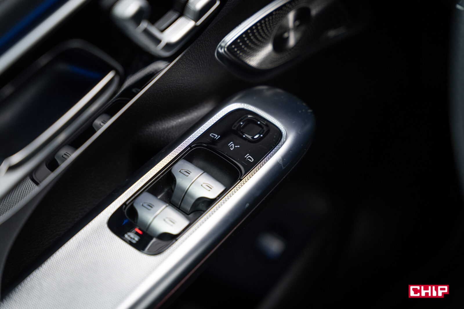 Wszystko uzupełnia typowe dla Mercedesa, według niektórych przesadzone, oświetlenie ambientowe. Jak zawsze – kwestia gustu. Można je dowolnie dostosować, wygasić strefy, które nam przeszkadzają czy dowolnie ustawić kolory. Podświetlenie pełni też funkcję praktyczną i np. sygnalizuje nam nadjeżdżający pojazd w momencie otwierania drzwi.