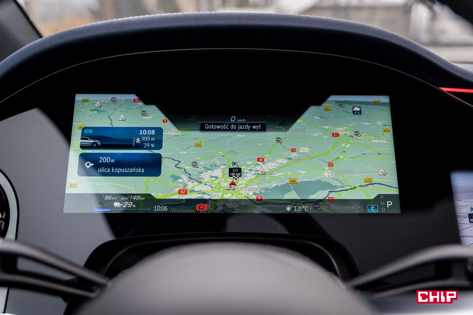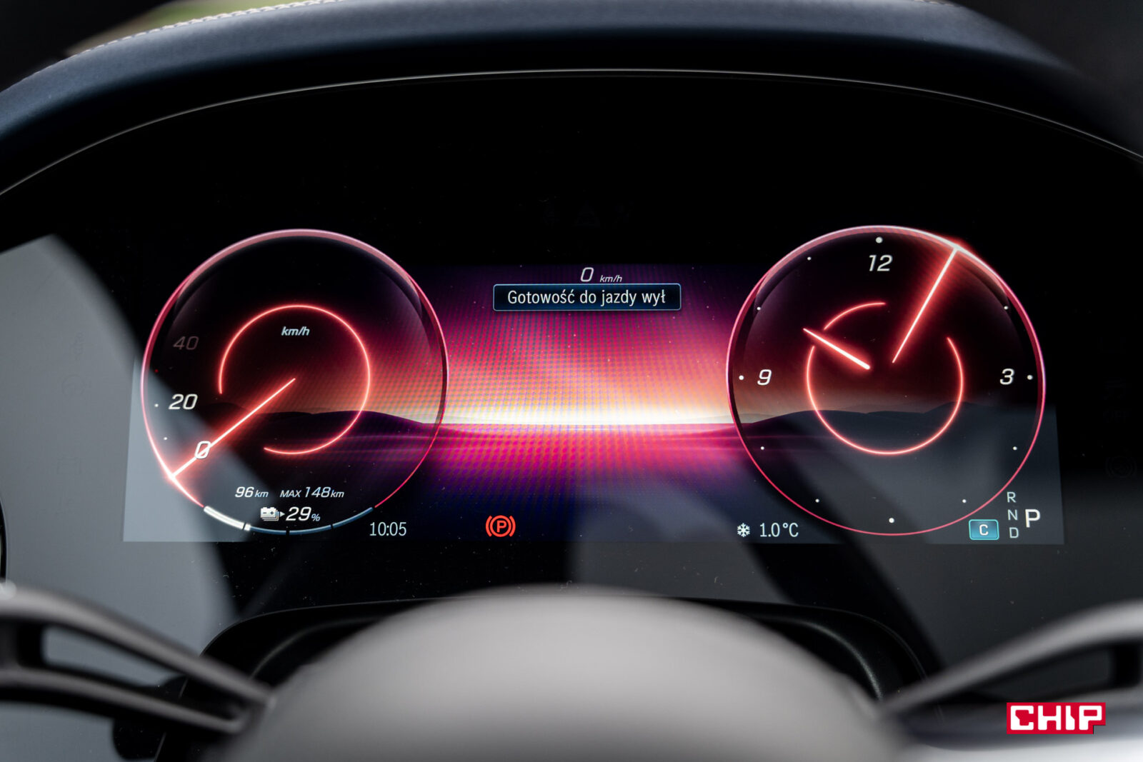 Ekran kierowcy oferuje kilka różnych widoków. Od minimalistycznych, po przeładowane informacjami. Sterujemy nim touchpadem po lewej stronie kierownicy. Za jego pomocą możemy też zarządzać head-upem.