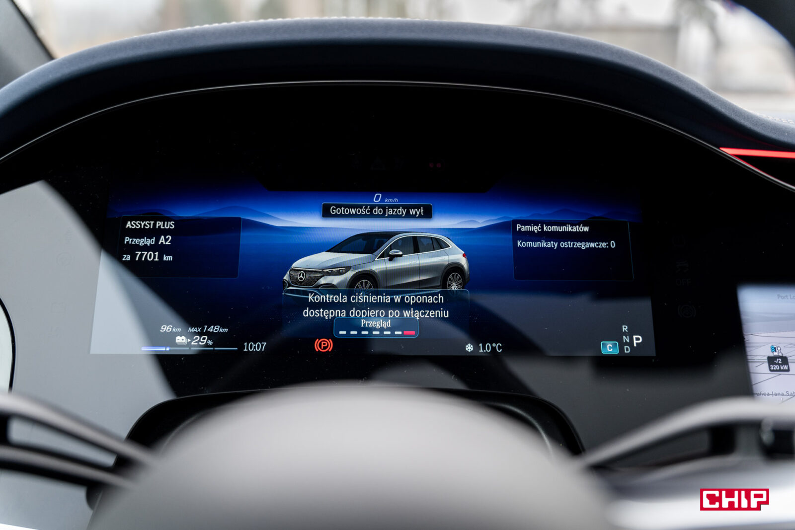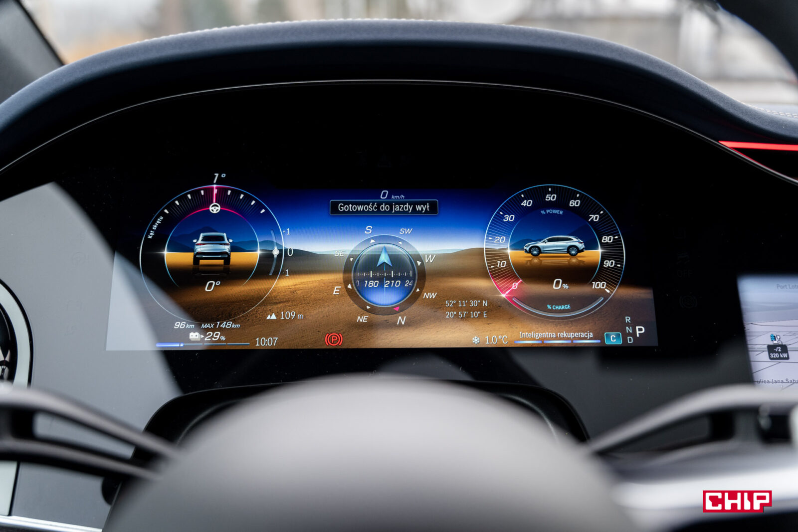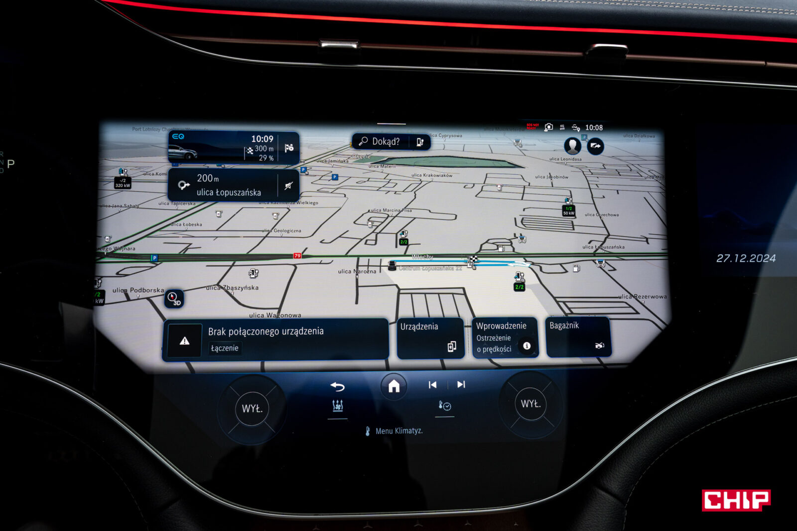 Czytając o elektrykach zapewne często spotykacie się z radami dotyczącymi planowania trasy. Brzmi wyczerpująco, ale nie musi wymagać od Was wiele wysiłku. W Mercedesie trasę możecie zaplanować w aplikacji (pisaliśmy o tym TUTAJ), możecie też zrobić to z poziomu auta. System sprawdzi, jaka trasa będzie najbardziej optymalna. Jeżeli zauważy, ze dacie radę dojechać do celu bez ładowania po drodze, nie będzie Wam go wpychać na siłę, ale jeśli zaznaczycie, że chcecie trochę podładować baterię, zaproponuje ładowarki, które nie wymagają zbaczania z trasy. Dlaczego ważne jest, aby uruchomić prowadzenie do celu z ewentualnym ładowaniem po drodze właśnie w systemie Mercedesa? Dlatego, że wtedy auto wie, że po pierwsze będziecie je ładować, a po drugie – gdzie będziecie to robić. Wtedy odpowiednio wcześniej przygotuje baterię do ładowania, aby przebiegało ono tak sprawnie jak to możliwe, w efekcie oszczędzając Wam czasu spędzonego przy ładowarce bo nie, nie każdy dostosowuje posiłki do ładowania swojego elektryka. Niektórzy ludzie mają inne rzeczy do roboty i chcieliby po prostu wpaść, naładować auto i ewakuować się z punktu ładowania najszybciej, jak to możliwe i uwierzcie mi, że odpowiednie przygotowanie baterii robi ogromną różnicę. Sprawdzaliśmy to przy niejednym elektryku Mercedesa i za każdym razem, gdy auto wiedziało, że bateria będzie ładowana, proces przebiegał sprawniej. Nie ma co się czarować, choćbyśmy nie wiem jak się starali, trasa z ładowaniem zajmuje więcej czasu, ale przy takiej pojemności baterii nie będziecie na to skazywani często.