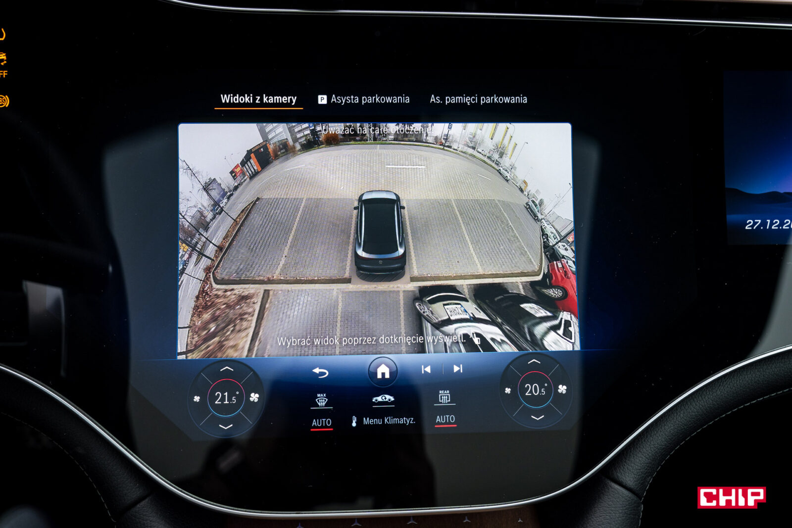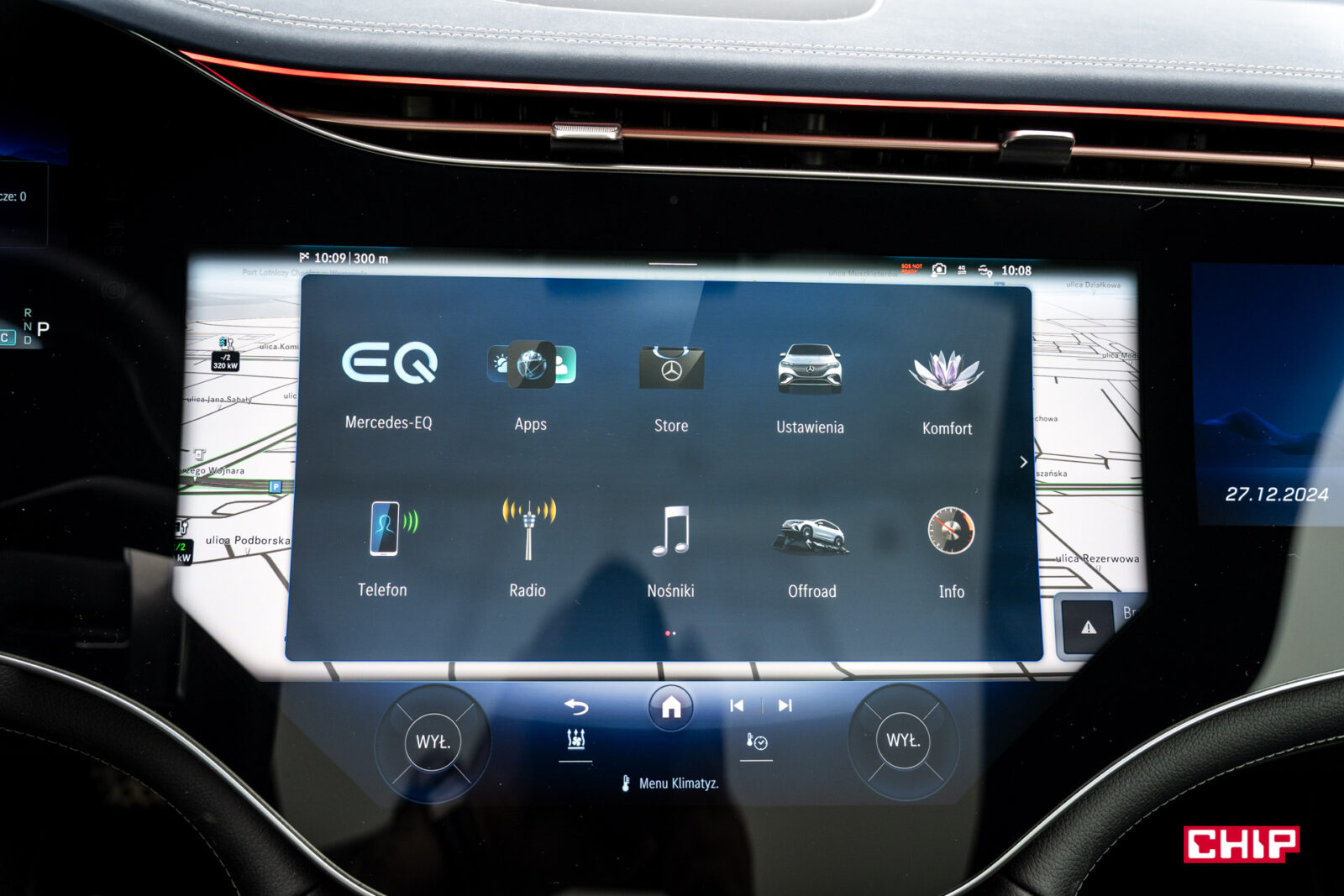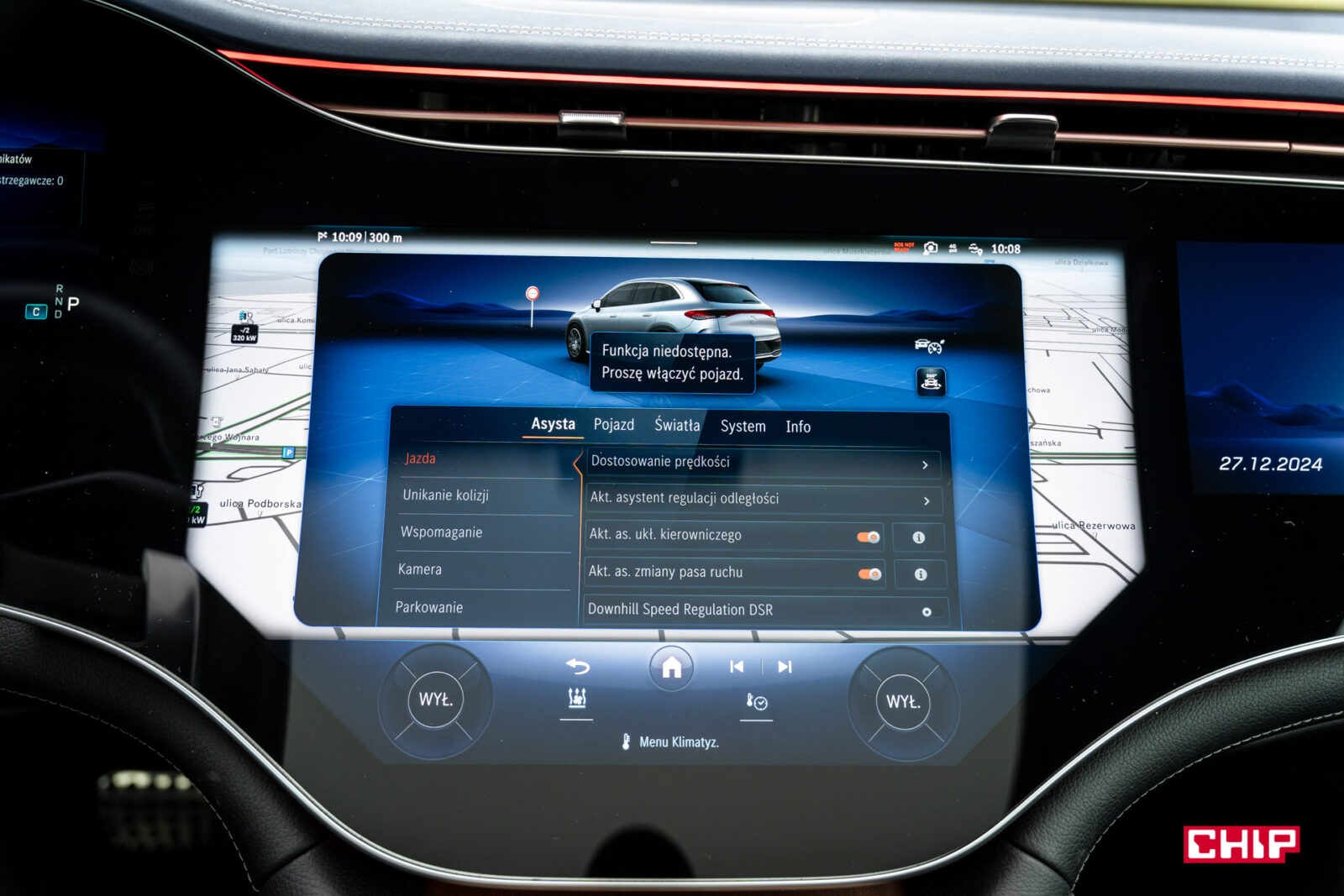 Czytając o elektrykach zapewne często spotykacie się z radami dotyczącymi planowania trasy. Brzmi wyczerpująco, ale nie musi wymagać od Was wiele wysiłku. W Mercedesie trasę możecie zaplanować w aplikacji (pisaliśmy o tym TUTAJ), możecie też zrobić to z poziomu auta. System sprawdzi, jaka trasa będzie najbardziej optymalna. Jeżeli zauważy, ze dacie radę dojechać do celu bez ładowania po drodze, nie będzie Wam go wpychać na siłę, ale jeśli zaznaczycie, że chcecie trochę podładować baterię, zaproponuje ładowarki, które nie wymagają zbaczania z trasy. Dlaczego ważne jest, aby uruchomić prowadzenie do celu z ewentualnym ładowaniem po drodze właśnie w systemie Mercedesa? Dlatego, że wtedy auto wie, że po pierwsze będziecie je ładować, a po drugie – gdzie będziecie to robić. Wtedy odpowiednio wcześniej przygotuje baterię do ładowania, aby przebiegało ono tak sprawnie jak to możliwe, w efekcie oszczędzając Wam czasu spędzonego przy ładowarce bo nie, nie każdy dostosowuje posiłki do ładowania swojego elektryka. Niektórzy ludzie mają inne rzeczy do roboty i chcieliby po prostu wpaść, naładować auto i ewakuować się z punktu ładowania najszybciej, jak to możliwe i uwierzcie mi, że odpowiednie przygotowanie baterii robi ogromną różnicę. Sprawdzaliśmy to przy niejednym elektryku Mercedesa i za każdym razem, gdy auto wiedziało, że bateria będzie ładowana, proces przebiegał sprawniej. Nie ma co się czarować, choćbyśmy nie wiem jak się starali, trasa z ładowaniem zajmuje więcej czasu, ale przy takiej pojemności baterii nie będziecie na to skazywani często.