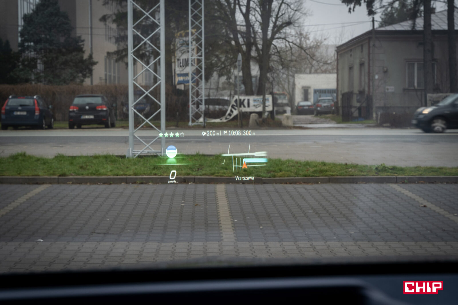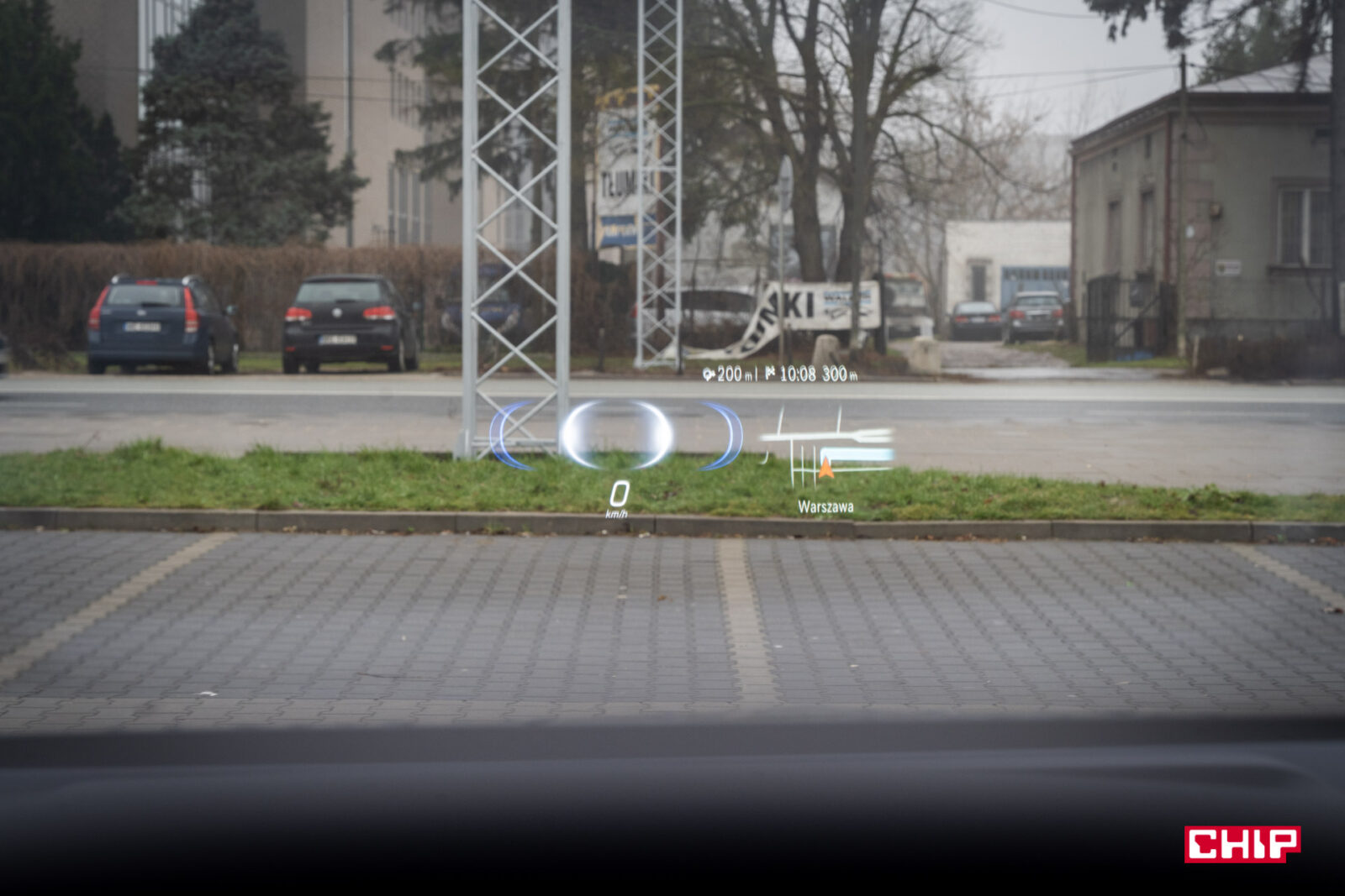 Head-up Mercedesa to jedno z najbardziej zaawansowanych rozwiązań dostępnych w europejskich autach. Jest duży i może wyświetlać bardzo dużo informacji. Do tego stopnia, że w trakcie jazdy w zasadzie nie ma potrzeby zerkać na ekran za kierownicą, bo na szybie widzimy m.in. dokładne wskazówki nawigacji.