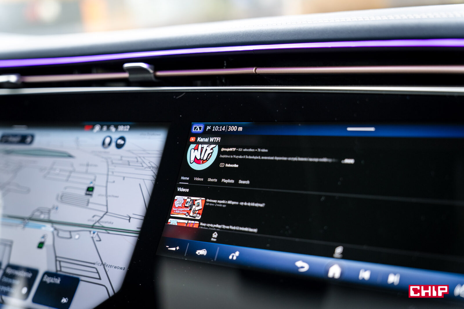 Na końcu mamy ekran pasażera i tu nie pierwszy raz mam zastrzeżenia. Dobrze, że działa on tylko wtedy, kiedy faktycznie ktoś przed nim siedzi. Bez pasażera kierowca nie może na nim zrobić nic poza oglądaniem tapety. Mamy tu dostęp do multimediów, ustawień i personalizacji wnętrza oraz nawigacji. Jest też rozrywka, choćby w postaci YouTube’a z opcją podłączenia bezprzewodowych słuchawek, ale… nie działa on w trakcie jazdy.