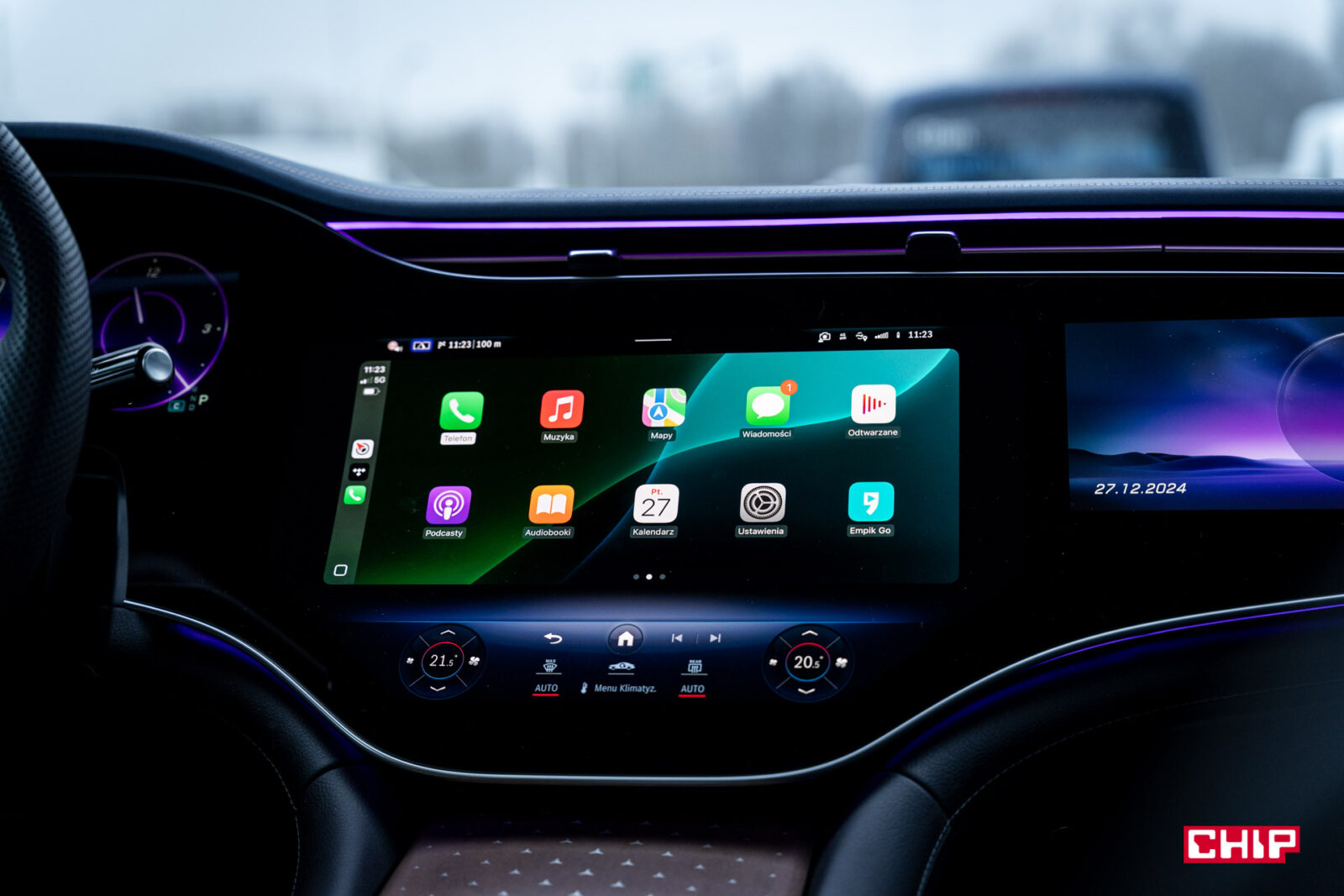 Ekran główny to centrum sterowania całym autem. Możemy go obsługiwać dotykowo lub touchpadem z prawej strony kierownicy. Interfejs Mercedesa niezmiennie chwalę, bo pomimo natłoku opcji jest zaskakująco intuicyjny, działa szybko i bez opóźnień oraz daje namiastkę wielozadaniowości. Niektóre z uruchomionych opcji pojawiają się w formie widżetów u dołu ekranu, praktycznie z każdego poziomu Menu możemy jednym dotknięciem przenieść się do widoku Android Auto lub Apple CarPlay (oba bezprzewodowe), możemy też przypisać skróty do najczęściej używanych opcji i przyczepić je do rozwijanej belki z góry ekranu.