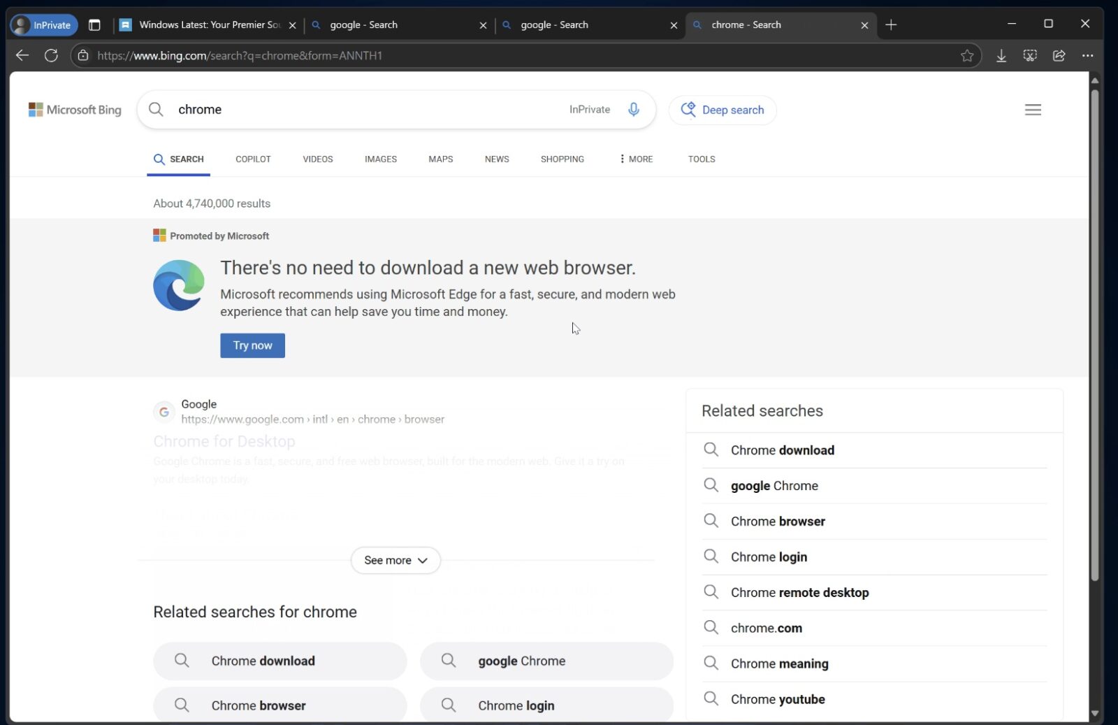Jak zauważył po raz pierwszy właśnie serwis Windows Latest, po wylogowaniu się z konta Microsoft w przeglądarce Edge i wyszukaniu przeglądarki Chrome w witrynie Bing.com, widoczny jest baner promujący… Edge i hasło: „Nie ma potrzeby pobierania nowej przeglądarki internetowej” z linkiem do przetestowania Edge. Zwraca uwagę efekt rozmycia, który sprawia, że link do przeglądarki Chrome jest trudniejszy do zauważenia, a wzrok skupia się najpierw na reklamie w przeglądarce Microsoft Edge.