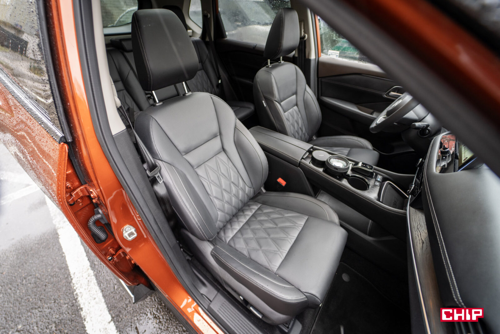 Przednie fotele są szerokie, bardzo wygodne w długich trasach i ma się wrażenie, że kierowca siedzi w dosyć sporej odległości od pasażera. Co potęguje szeroki, amerykański wręcz podłokietnik. Tunel środkowy nie jest zabudowany, znajdziemy pod nim dodatkową półkę niczym w aucie elektrycznym.
