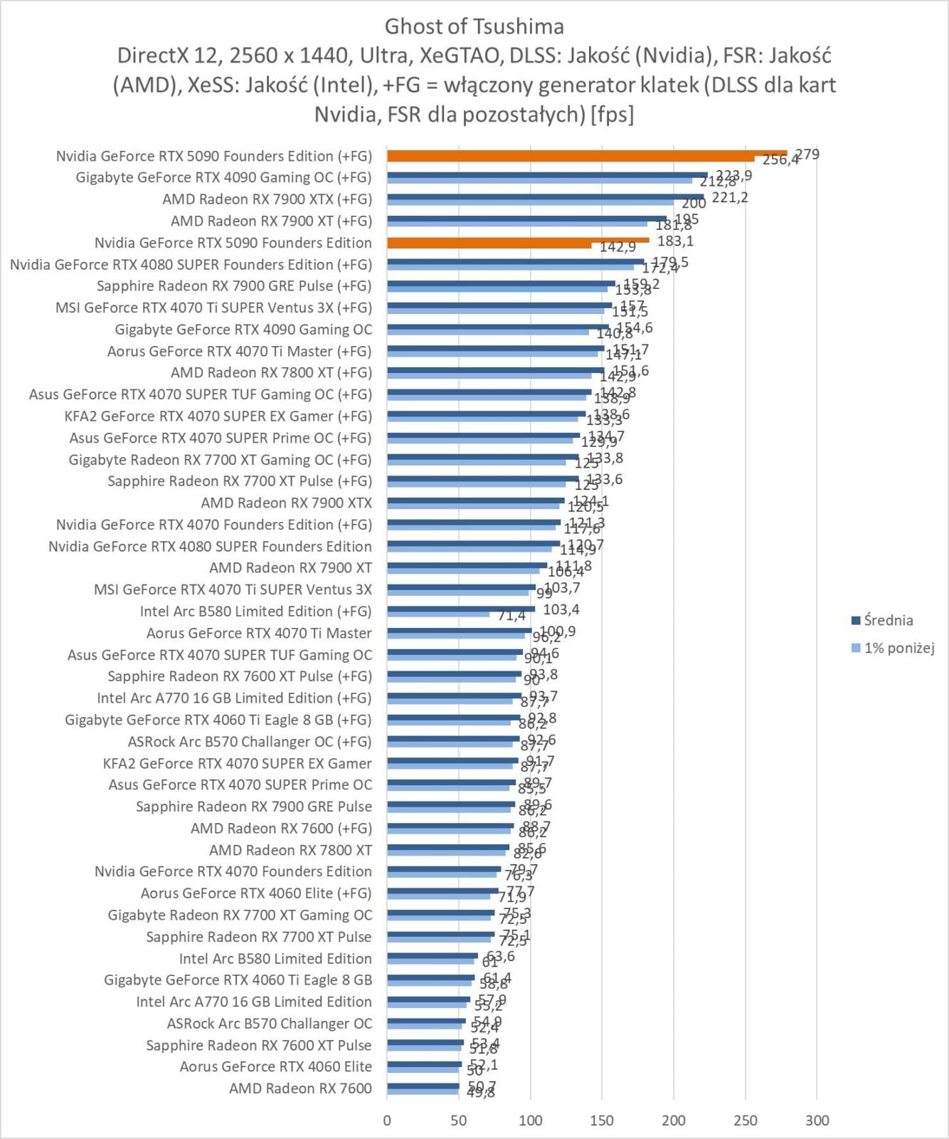 W pierwszej rozdzielczości widać, że mamy do czynienia z bottleneckiem. Wyniki 5090 i 4090 w 6 grach obu kart są bardzo bliskie sobie. Natomiast nie ma żadnego zaskoczenia i takie wyniki były w 1920 x 1080 spodziewane.