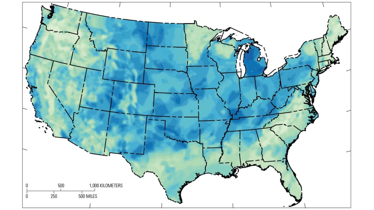 Widoczna powyżej mapa wykorzystuje gradient kolorów od białego do ciemnoniebieskiego, aby wskazać prawdopodobieństwo znalezienia rezerw wodoru. Ciemnoniebieski oznacza obszary o wysokim potencjale, podczas gdy biały oznacza niski potencjał. Duże obszary Środkowego Zachodu, w tym stany takie jak Michigan, Kentucky i Dakota Północna, są zaznaczone na ciemnoniebiesko, co sugeruje znaczące rezerwy wodoru. Ponadto regiony przybrzeżne w Kalifornii i wzdłuż wschodniego wybrzeża są obiecujące.