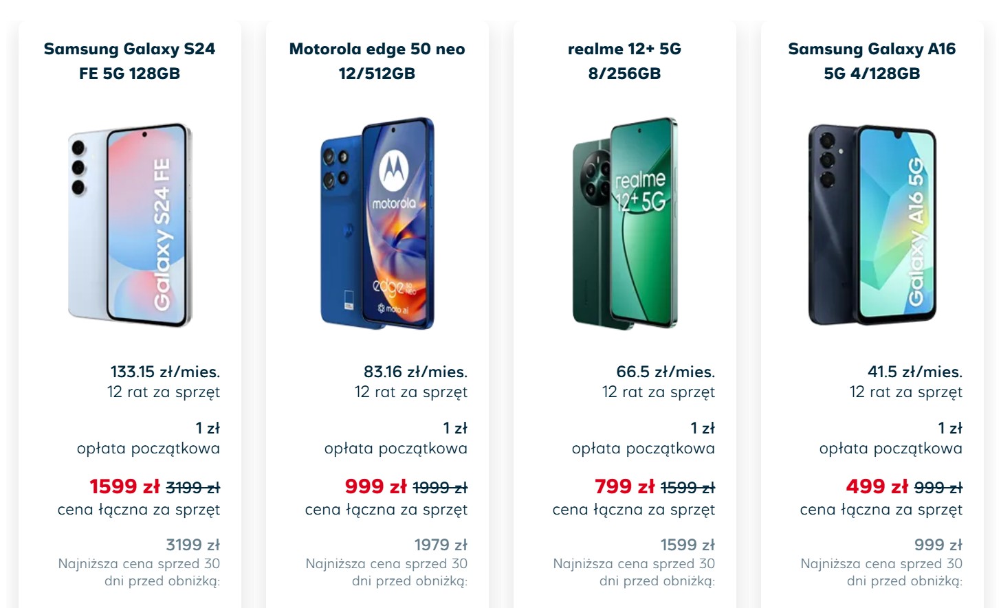 - Samsung Galaxy A16 5G 4/128 GB – 499 zł – 1 zł na start oraz 12 rat po 41,50 zł/miesięcznie, cena bez rabatu – 999 zł (najniższa cena z ostatnich 30 dni: 999 zł).