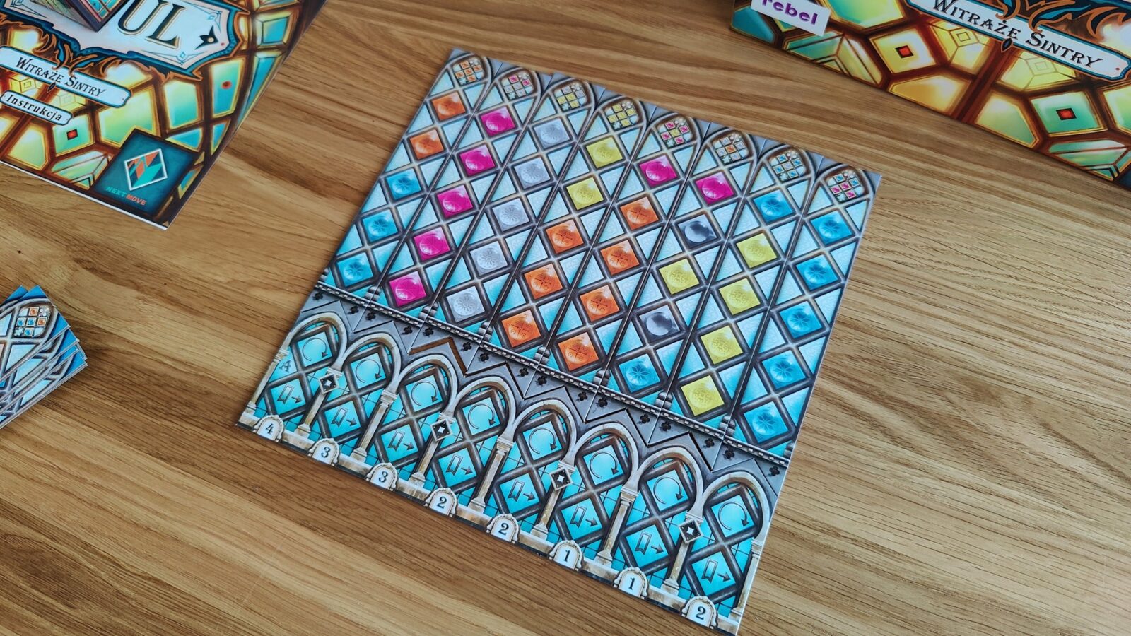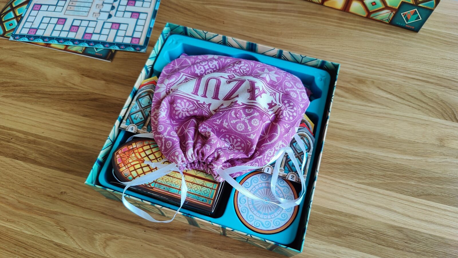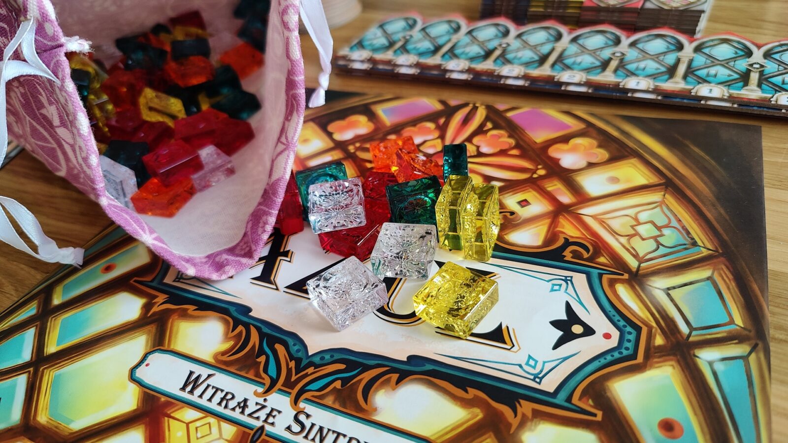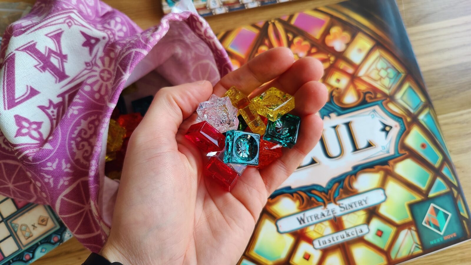 Chociaż same grafiki nie są zbyt powalające, a tekturowe plansze mogłyby zostać zrobione lepiej, to materiałowy worek i 100 plastikowych żetonów szkła robią w tej grze robotę. Wyglądają wprawdzie jak cukierki, więc musicie przypilnować co młodsze dzieciaki, ale swoją przezroczystością przykuwają wzrok i tak naprawdę budują cały klimat tej produkcji. Ba! Gdyby wykonano je z kartonu, a nie przezroczystego tworzywa sztucznego, to Azul: Witraże Sintry byłaby jedną z absurdalnie wycenionych i wręcz nieprzyjemnych w odbiorze gier, a tak to możemy rzeczywiście poczuć namiastkę bycia wspomnianym witrażystą.