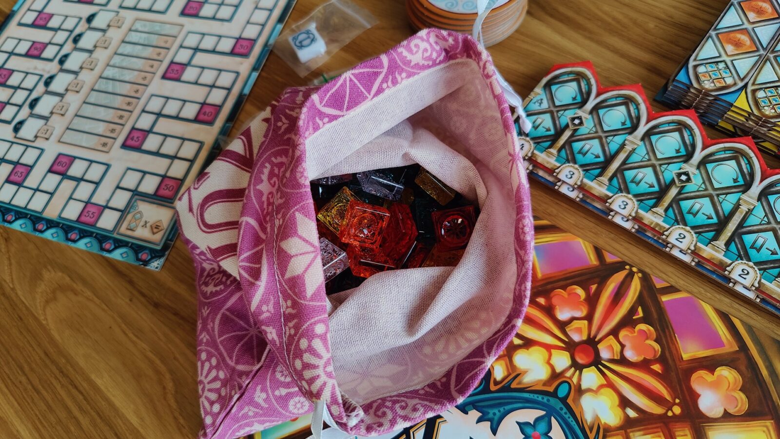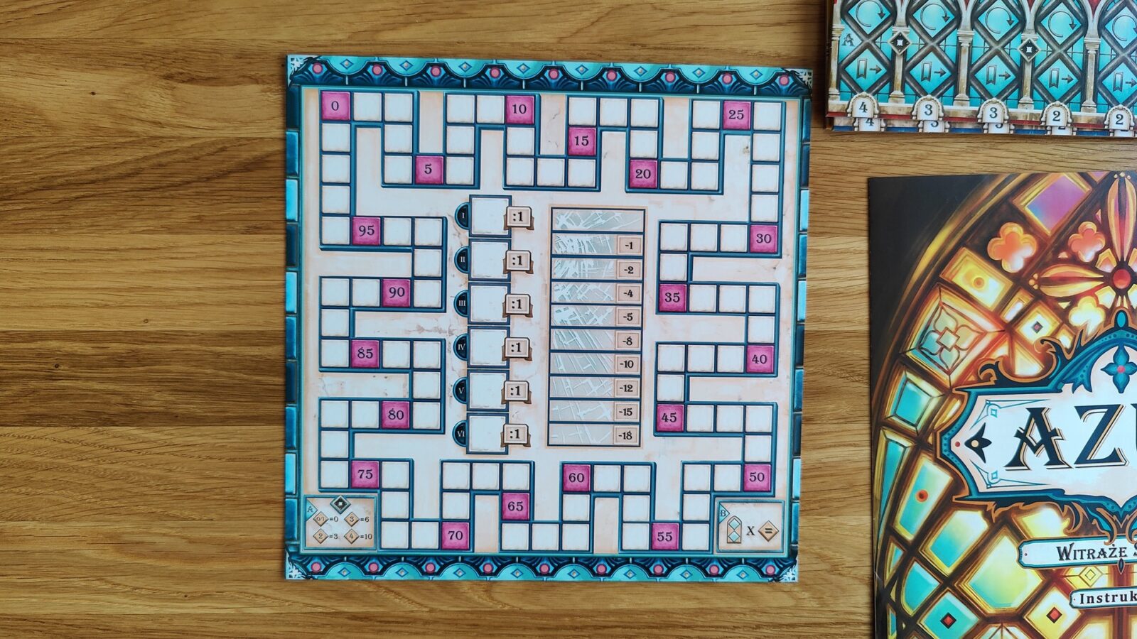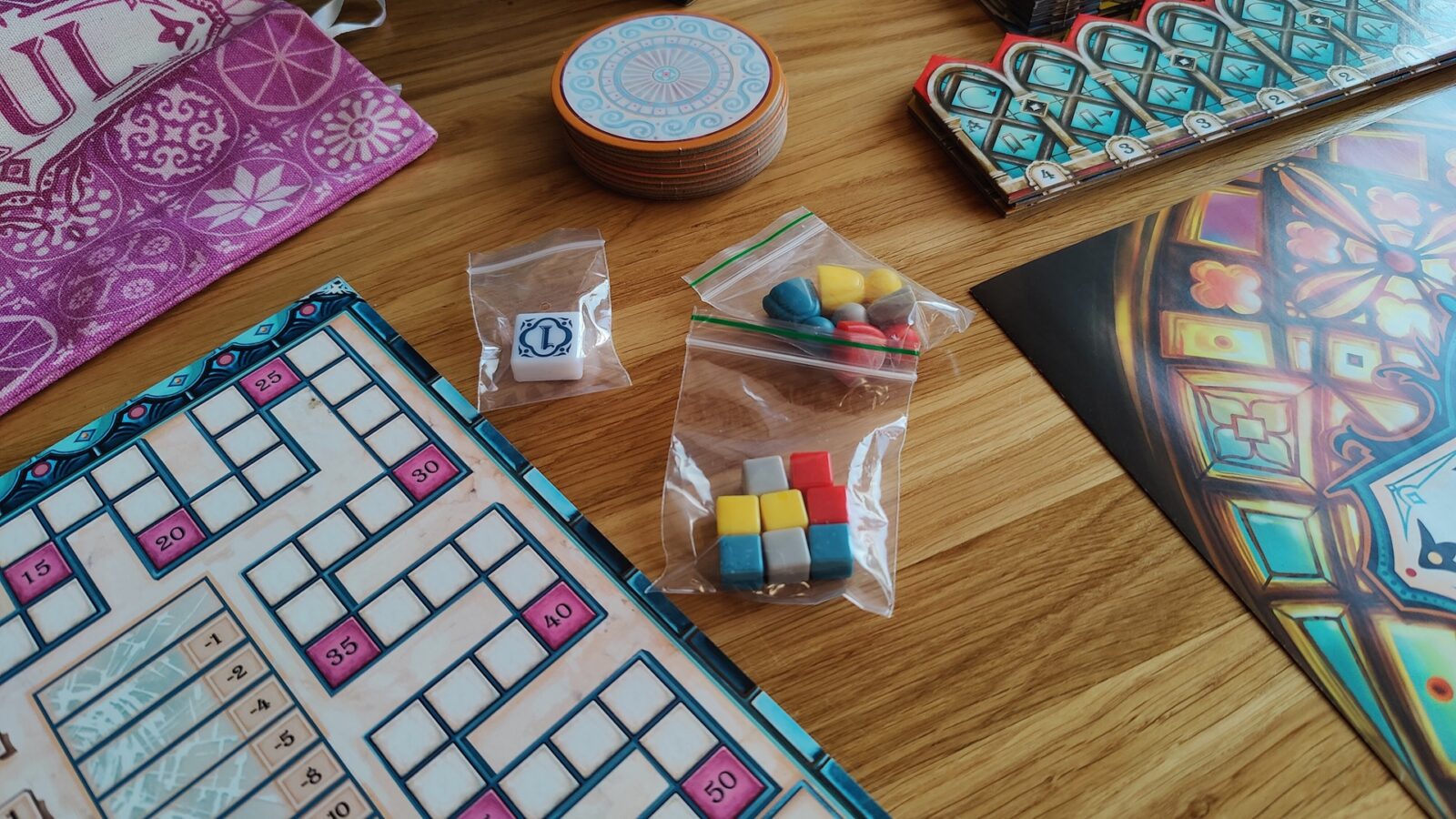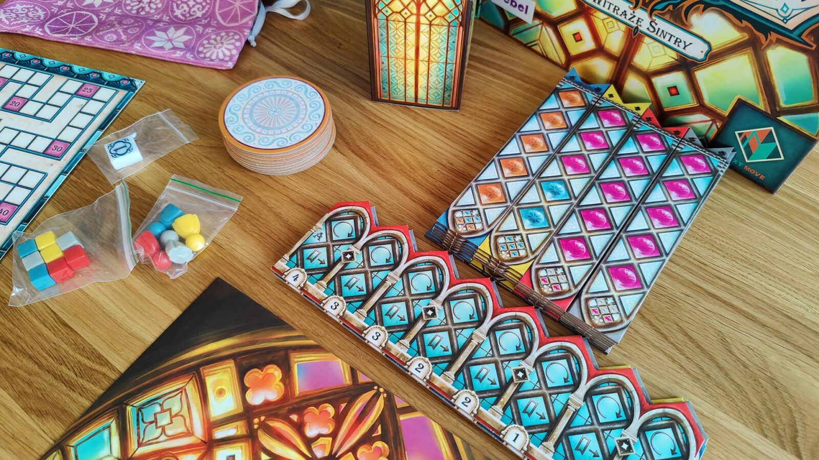 Chociaż same grafiki nie są zbyt powalające, a tekturowe plansze mogłyby zostać zrobione lepiej, to materiałowy worek i 100 plastikowych żetonów szkła robią w tej grze robotę. Wyglądają wprawdzie jak cukierki, więc musicie przypilnować co młodsze dzieciaki, ale swoją przezroczystością przykuwają wzrok i tak naprawdę budują cały klimat tej produkcji. Ba! Gdyby wykonano je z kartonu, a nie przezroczystego tworzywa sztucznego, to Azul: Witraże Sintry byłaby jedną z absurdalnie wycenionych i wręcz nieprzyjemnych w odbiorze gier, a tak to możemy rzeczywiście poczuć namiastkę bycia wspomnianym witrażystą.