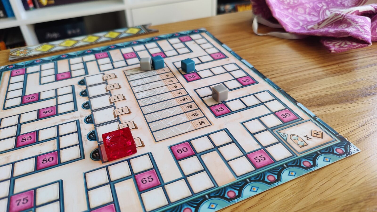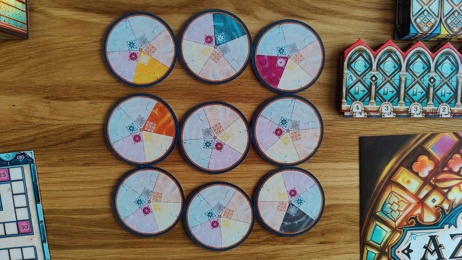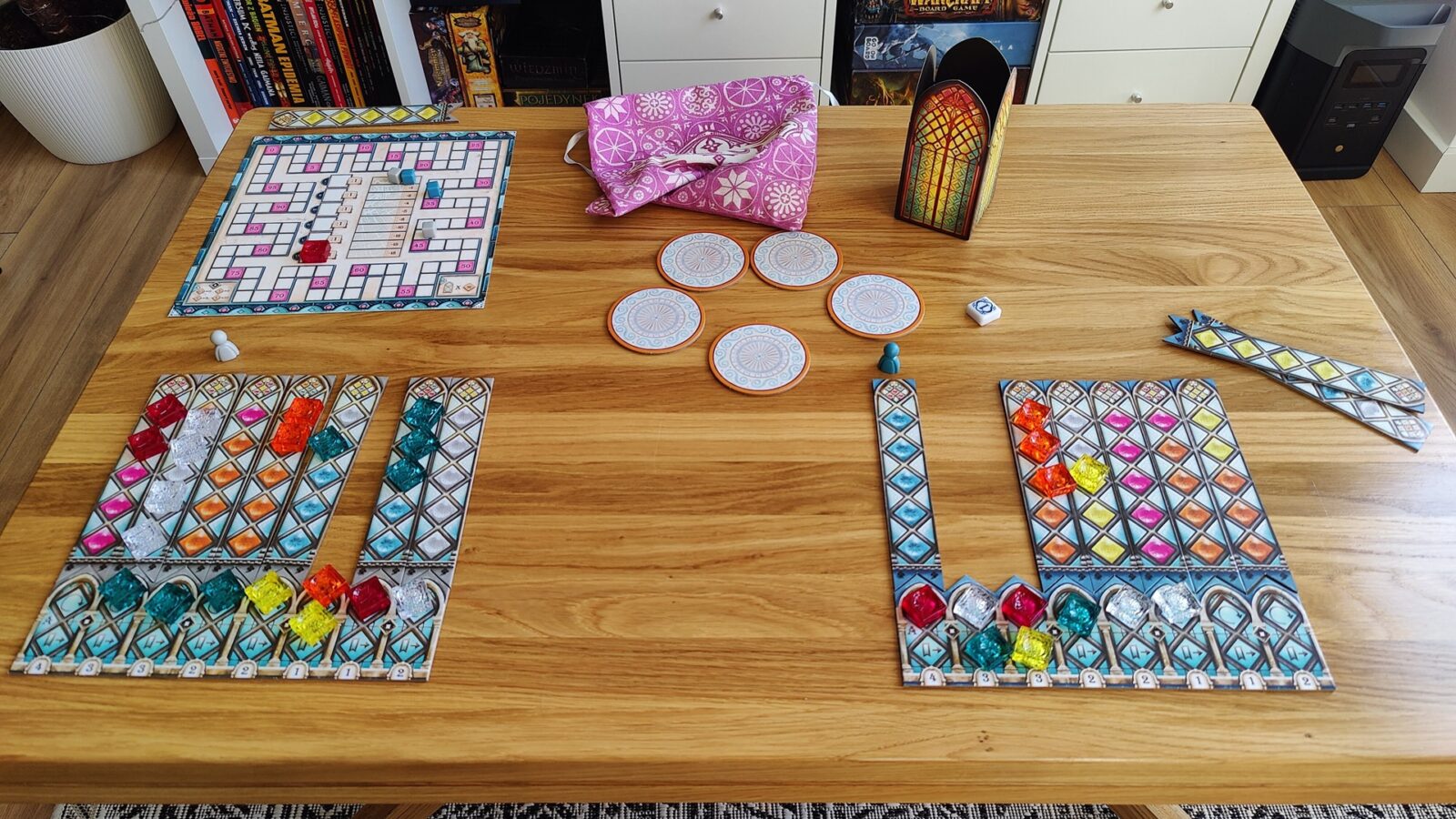 Z pozoru jest to więc prosta gra i 5-stronnicowa instrukcja obsługi od razu to sugeruje, ale przez współdzielenie puli kryształów z innymi graczami, nie możemy ot tak po prostu siedzieć z nosem w swoim pałacu, planować kolejne ruchy i udawać, że jesteśmy w tej rozgrywce sami. Spróbujcie zresztą tak zrobić, to przeciwnicy od razu zrobią z tego użytek, podbierając wam konkretne szkiełka nawet kosztem własnego postępu. Rozgrywka to bowiem wyścig z czasem, którego wyznacza sześć rund do rozegrania i na tor punktacji możemy wpływać nie tylko poprzez umiejętne tworzenie witraży, ale też przemyślane podrzucanie świń innym graczom np. tak, aby byli zmuszeni dobrać wszystkie aktualnie niepasujące im szkiełka z puli, a tym samym stracą na tym punkty.