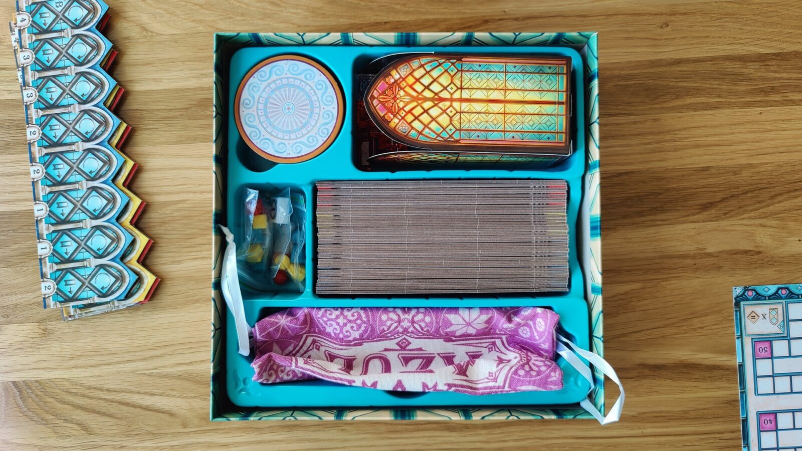 Nie każda gra planszowa w sobie na tyle dużo charakteru, że zapada w pamięć samym wstępem i podaniem. Azul: Witraże Sintry wyróżnia się w tej kwestii, ale umówmy się – w jak wielu grach planszowych jest nam dane komponować kolorowe szkiełka? Twórca (Michael Kiesling) miał więc nieco ułatwione zadanie w kwestii tego, jak zapaść w pamięć graczom, ale nie była to ot zagrywka w formie pójścia na łatwiznę. Projekt opakowania i jego zawartość bezpośrednio bowiem łączą się z całym klimatem, rzeczywiście ułatwiając nam wczucie się w witrażystów, bo to właśnie w nich wcielamy się, jako gracze.