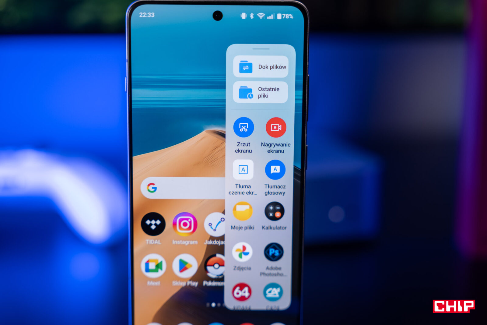 Na zdjęciach widzicie też nowy wygląd panelu kontrolnego, który od nowości oddzielono od panelu powiadomień. Jednocześnie możemy wrócić do starego porządku. W ustawieniach znajdziemy cały szereg narzędzi, które mogą uprzyjemnić nam korzystanie z telefonów, jak pasek boczny z aplikacjami i skrótami do kilku podstawowych akcji czy opcja uruchomienia jednej z kilku aplikacji przesunięciem palca na czytniku linii papilarnych tuż po odblokowaniu. Nie zawstydzono się też na myśl o kopiowaniu Apple i postawiono na kilka animacji z “kapsułką” okalającą wyspę aparatu. Z jednej strony nie musimy zaglądać do panelu powiadomień, by zobaczyć chociażby upływ czasu, a z drugiej kopia ta jest wybrakowana i nie współpracuje z zewnętrznymi aplikacjami.