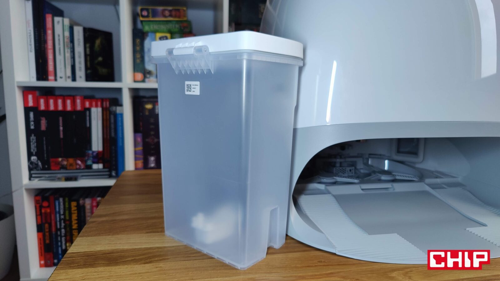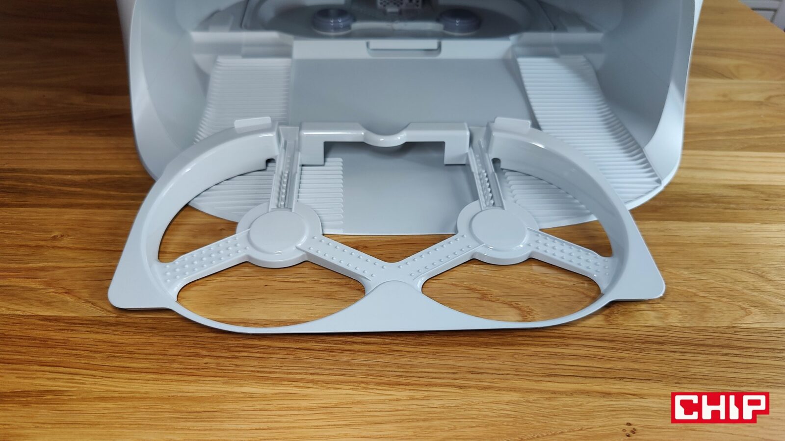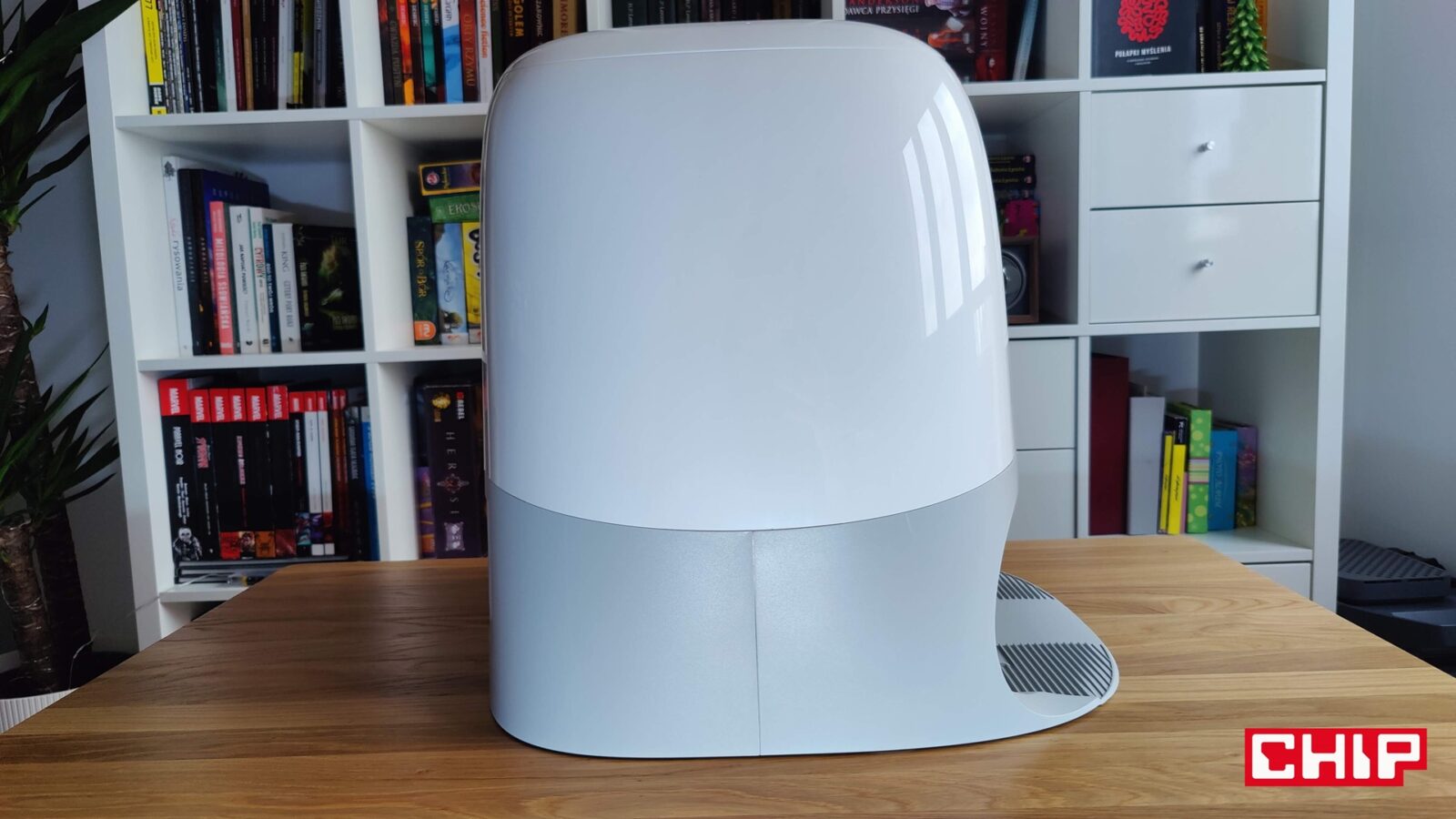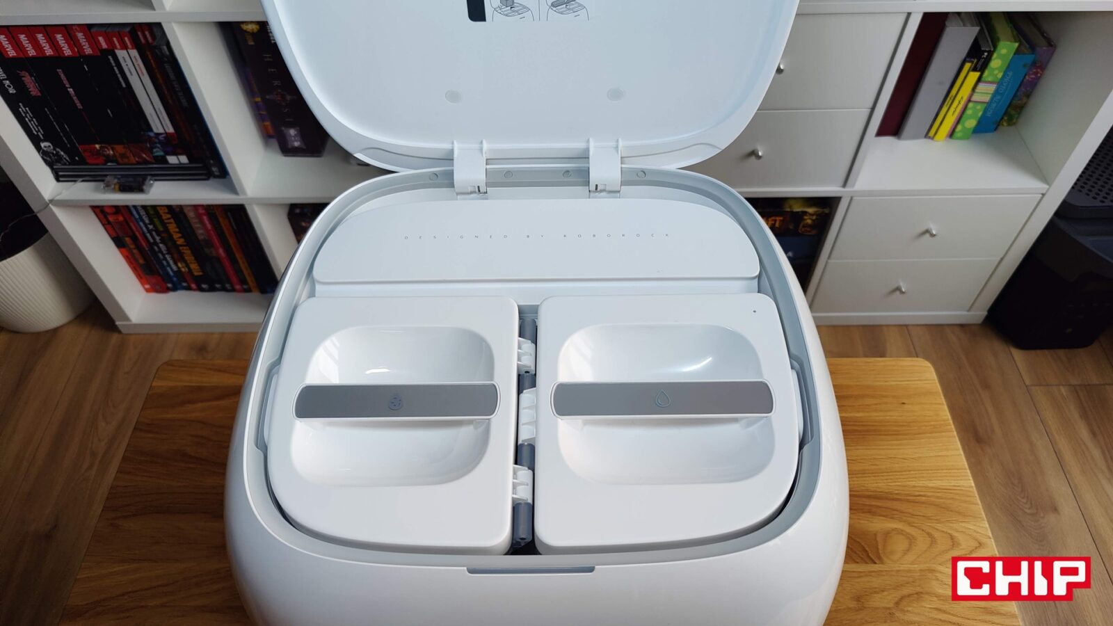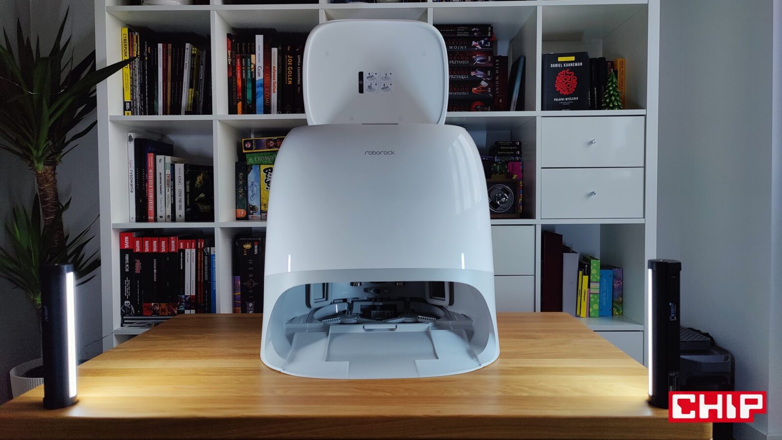 Nie tylko ciężki, ale też wielki. Qrevo Curv zalicza się do tych modeli robotów sprzątających, dla których musicie wygospodarować więcej miejsca. Zapomnijcie o upychaniu robotów pod wysokie meble, bo jego stacja mierzy aż 450 × 450 × 450 mm, więc musi być “na wierzchu” i tym samym przyciągać wzrok. Nie jest to na szczęście ot kawał surowego prostopadłościanu, a bardzo ładnie zaoblona bryła z błyszczącego tworzywa sztucznego w sekcji białej i matowego w sekcji szarej. Jeśli jednak myślicie, że wsadzicie ją pod biurko czy stół, to i tutaj muszę was rozczarować – otwierana pokrywa znajduje się bowiem na samej górze i musicie mieć do niej bardzo dobry dostęp. Inaczej żonglerka pojemnikami na wodę stanie się utrapieniem. Spokojnie jednak – stacja ta jest po prostu przyjemna dla oka, a jeśli macie wyobraźnię, nieco talentu i odpowiednie flamastry, to zrobicie z niej takiego starwarsowego R2D2 po roku w Polsce.