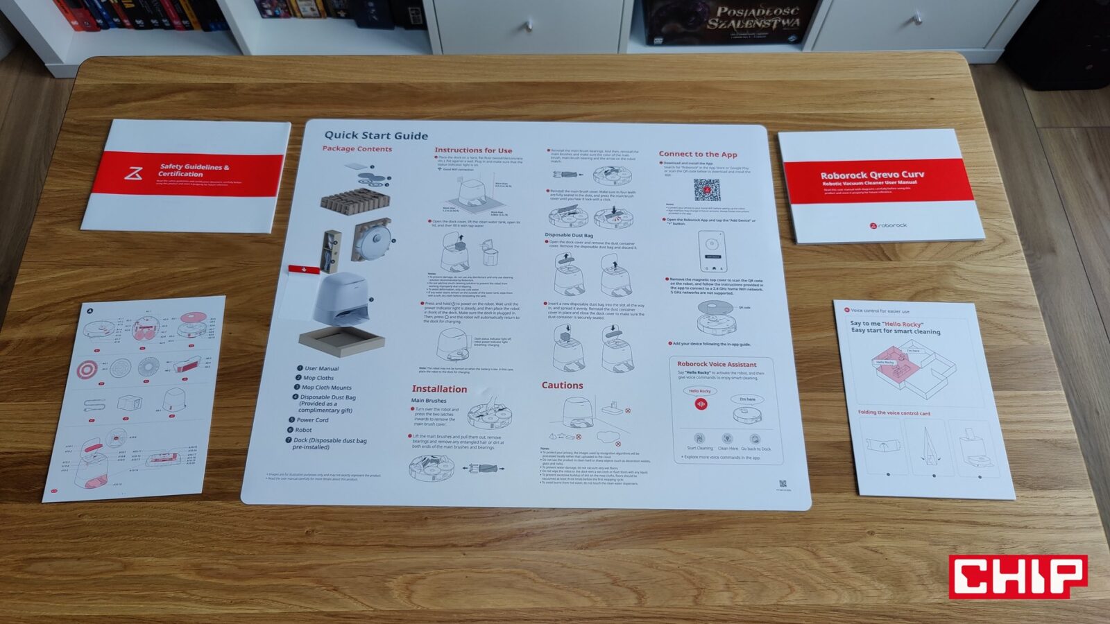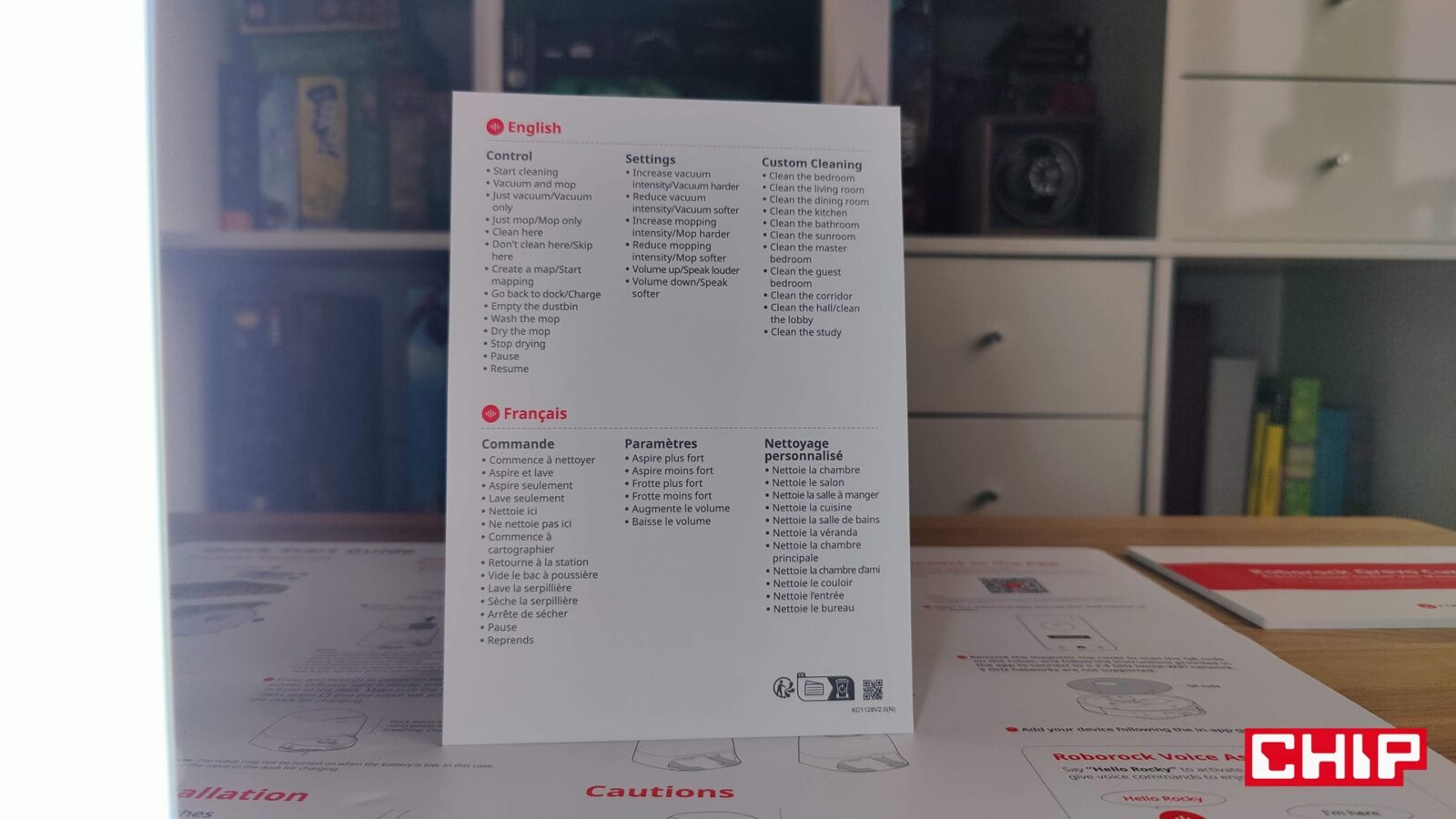 Wielkie kartonowe pudło, a w nim dobrze zabezpieczony robot, wielofunkcyjna stacja, jeden worek na nieczystości, dwa plastikowe mocowania na materiałowe mopy z rzepami, przewód zasilający i kilka papierków, które wyjaśniają funkcje Qrevo Curv i prowadzą nas, jak za rączkę, podczas konfiguracji i przygotowywania sprzętu do działania. Czego chcieć więcej? Ano zestawu komend, które robot rozpoznaje. Producent rozwiązał to ciekawie, bo zapewnił nam stojąca broszurkę z komendami po francusku i angielsku. Niestety polski język jest dla Qrevo Curv za trudny, a szkoda, bo jeśli zależy wam na tym, aby informował o swoim stanie w języku polskim, to funkcjonalność komend głosowych zostanie zdezaktywowania.