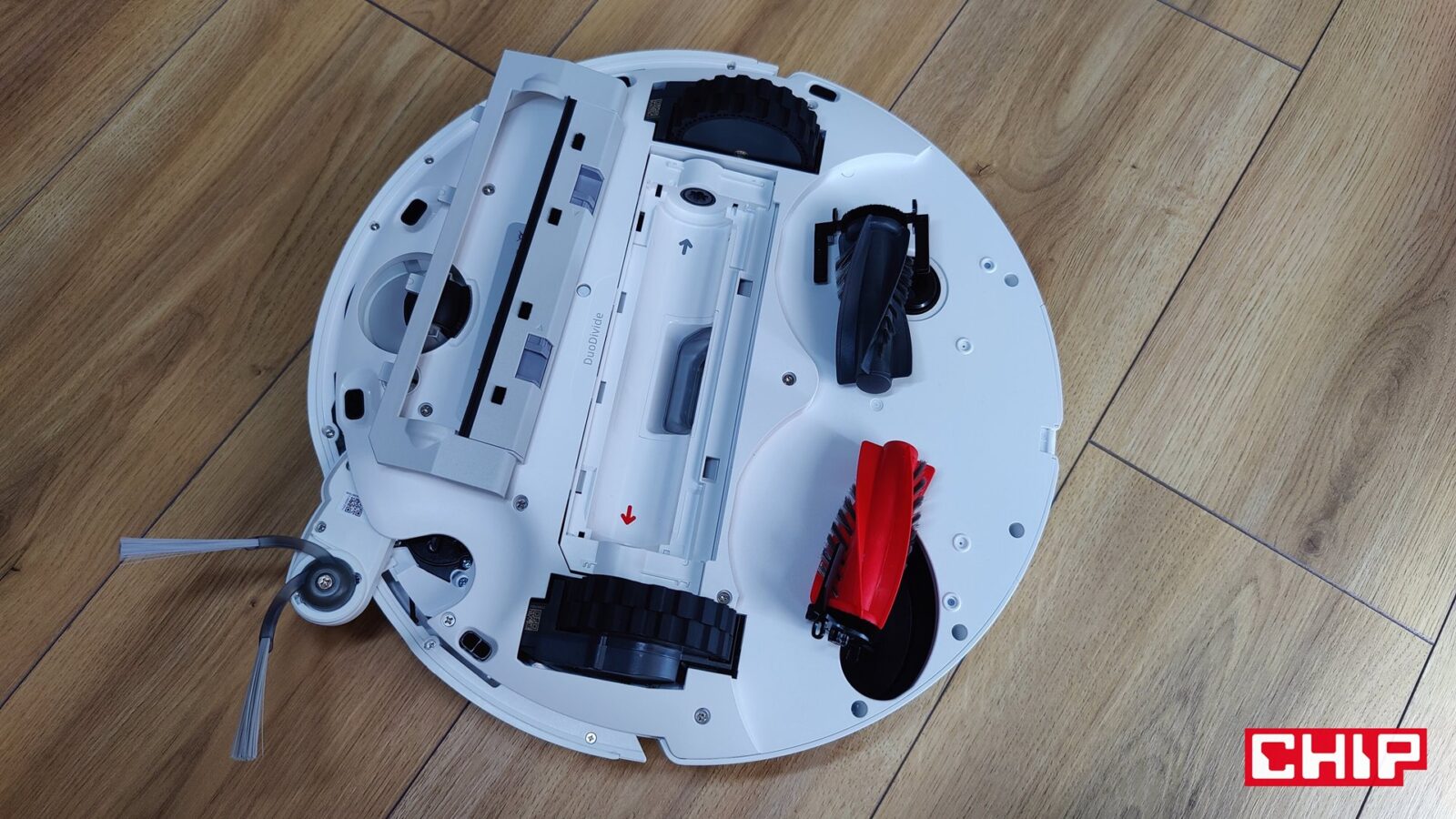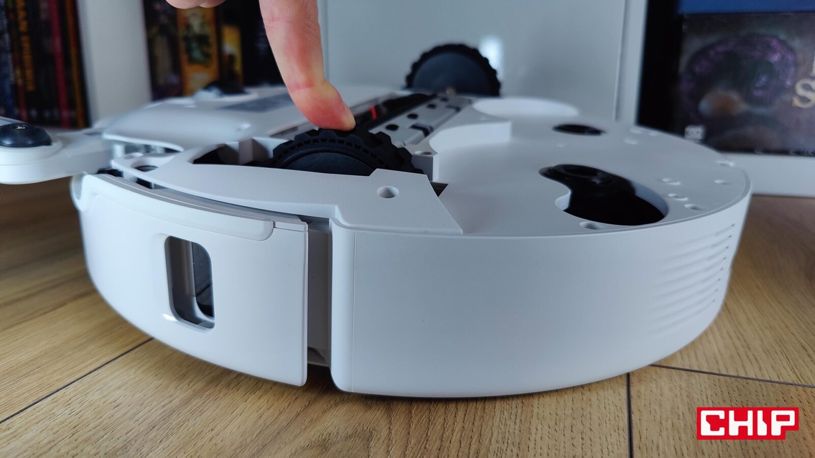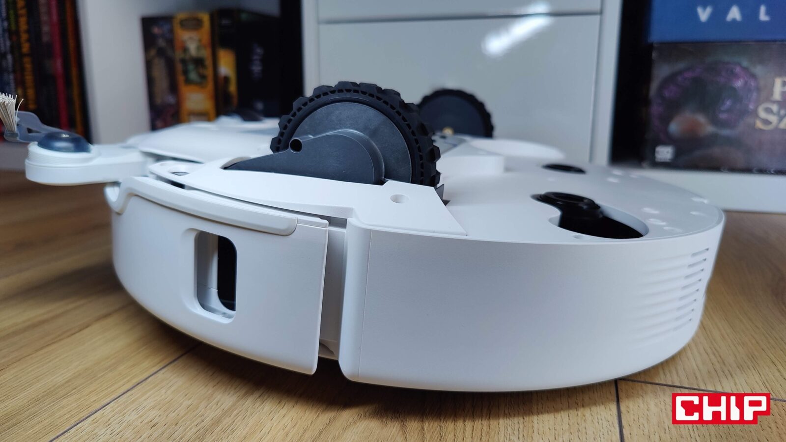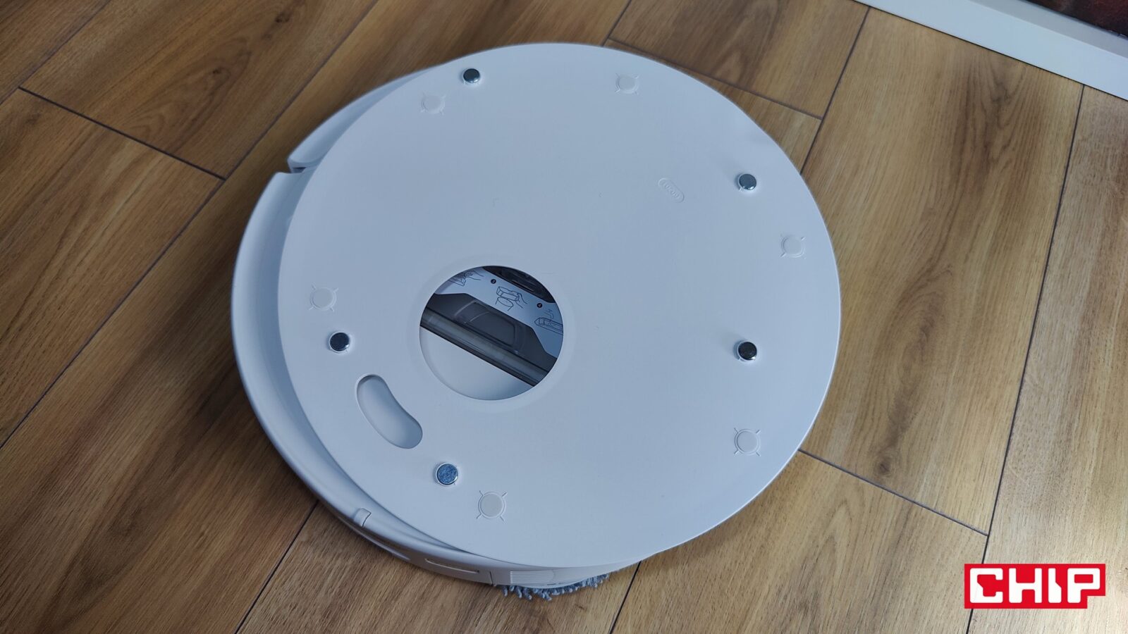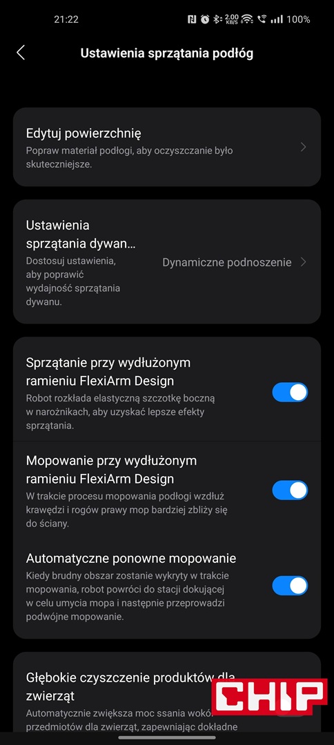 Od razu napomknę, że nie musicie się też martwić o doczyszczanie szczególnie trudnodostępnych miejsc, takich jak przestrzenie pod meblami czy rogi pomieszczeń. Tyczy się to nie tylko szczotki bocznej FlexiArm Arc ze specjalnym ramieniem, które wysuwa się w razie potrzeby, ale też jednej nakładki mopującej (FlexiArm Edge), która działa dokładnie w ten sam sposób. Widać to idealnie zwłaszcza wtedy, kiedy robot zaczyna proces czyszczenia wokół fotela biurowego i manewruje to szczotką, to mopem, aby doczyścić każdy fragment podłogi wokół kółek.