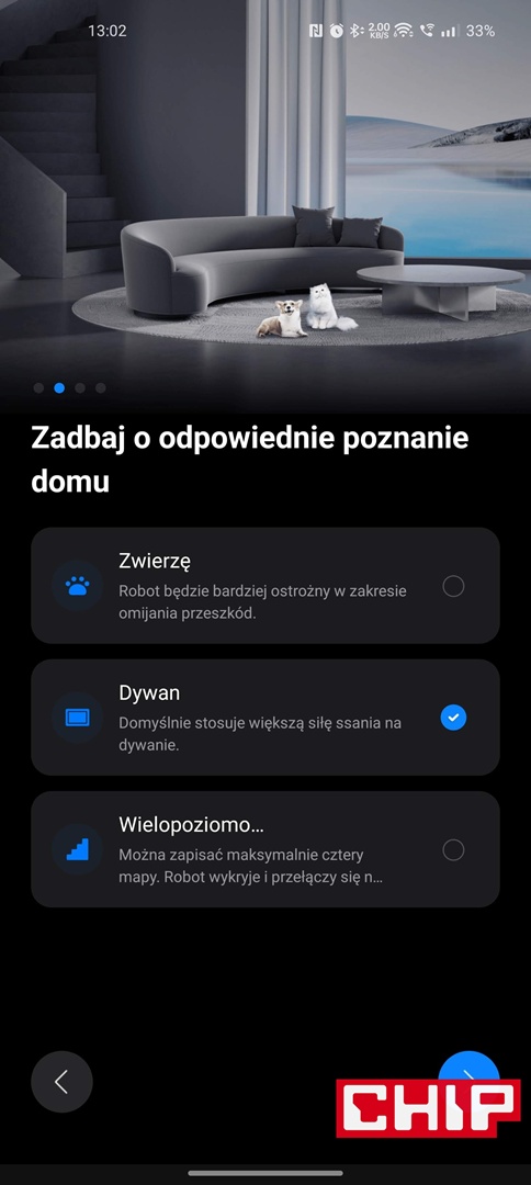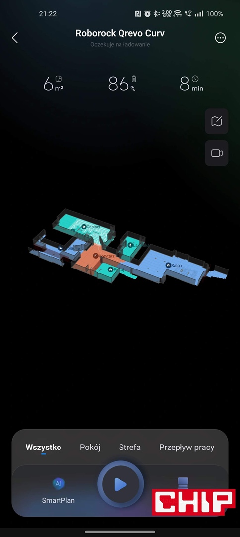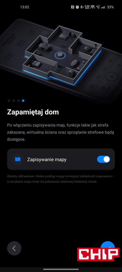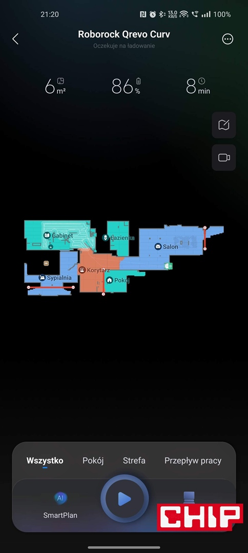 - dokładny podgląd na mapę i progres robota (w zakresie odkurzania i mopowania) podczas sprzątania, wliczając w to wykryte dywany, czy rozpoznane z pomocą sztucznej inteligencji przeszkody