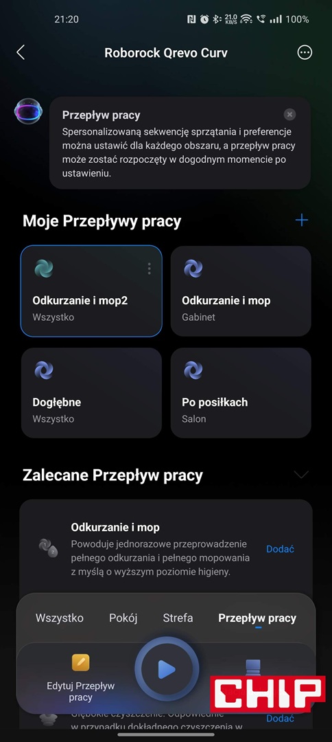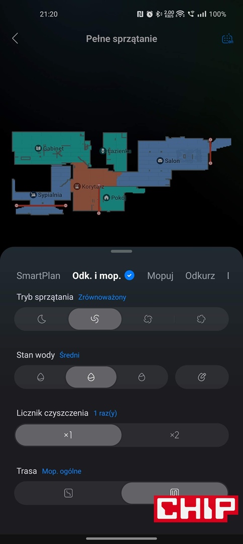 - możliwość dokładnego dostosowywania i konfigurowania trybów oraz całych sekwencji sprzątania, które można zapisać i mieć zawsze pod ręką na widgecie lub pierwszej stronie aplikacji