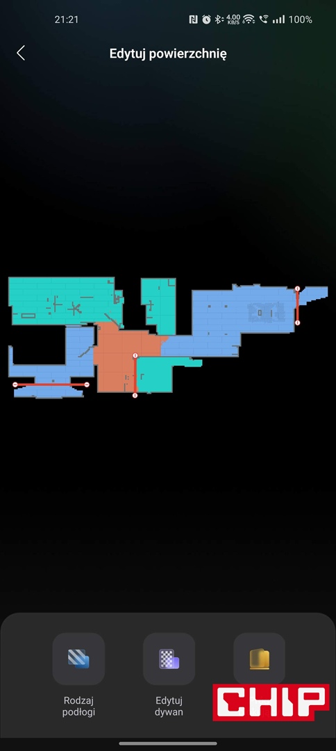 Drugim największym problemem Qrevo Curv było uznawanie luster za drugie pomieszczenia. Nie byłoby w tym nic złego, gdyby nie fakt, że robot starał się do nich wjechać, a to kończyło się spotkaniem z lustrzaną powierzchnią. Rozwiązanie tego jest jednak proste – wystarczy tylko ręcznie zmodyfikować mapę i wstawić w konkretne miejsca wirtualne ściany. Tego, czego z kolei nie unikniecie, tyczy się konieczności sprzątania m.in. przewodów z ziemi.
