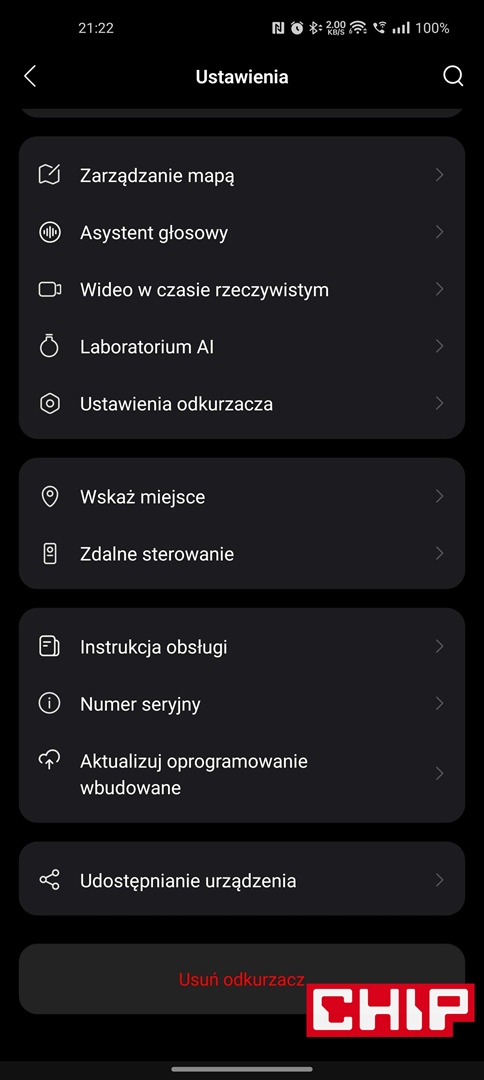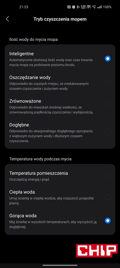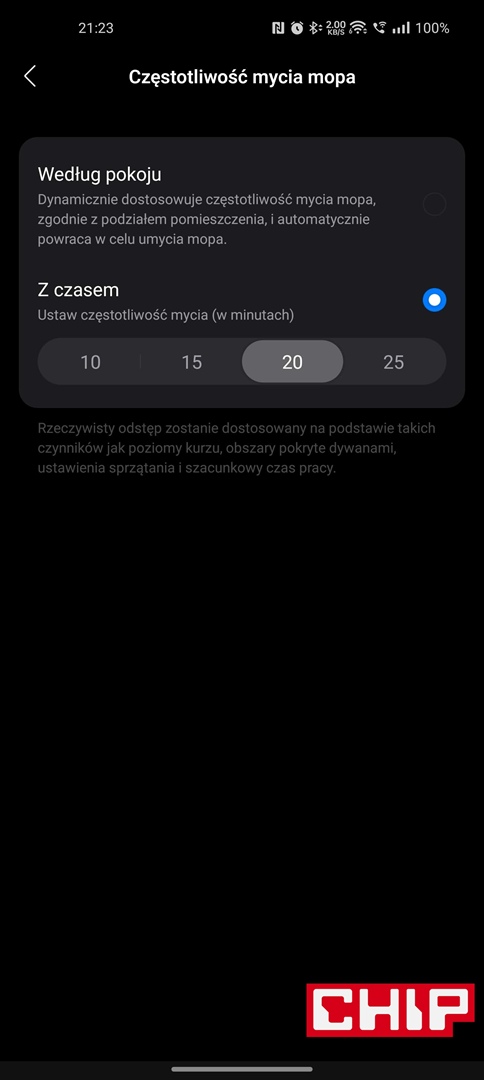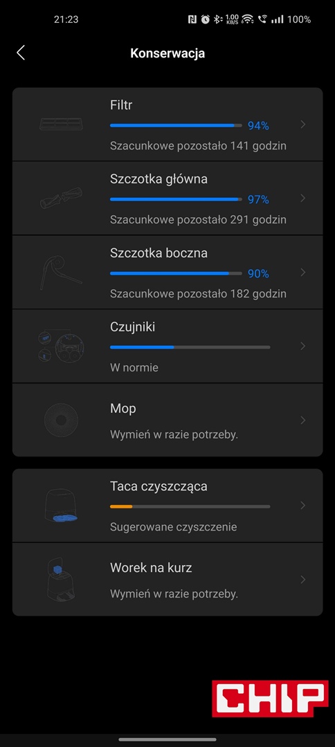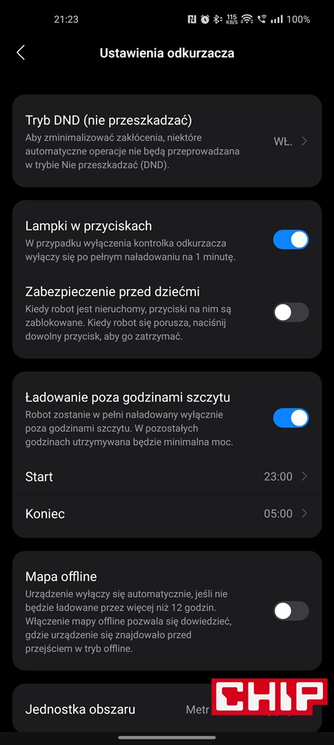 Producent postarał się też o opcję ładowania akumulatora robota w energetycznej strefie pozaszczytowej (niestety istnieje opcja wybrania tylko jednego przedziału), wskazywania zużycia filtra i szczotek czy poziomu zabrudzenia czujników oraz tacy czyszczącej, planowania sekwencji czyszczenia w konkretnych godzinach, rozbudowanych opcjach reaktywnego omijania przeszkód czy wreszcie ustawień samej stacji pod kątem prania mopów, ich suszenia czy opróżniania pojemnika na zanieczyszczenia w robocie.