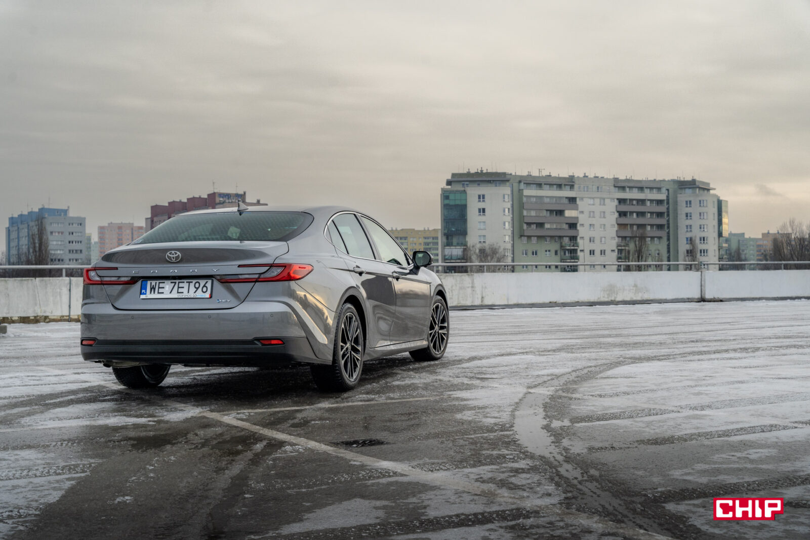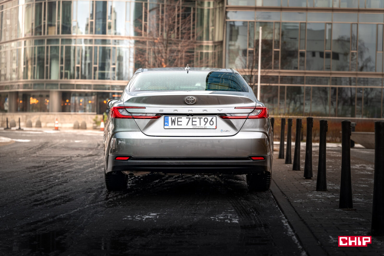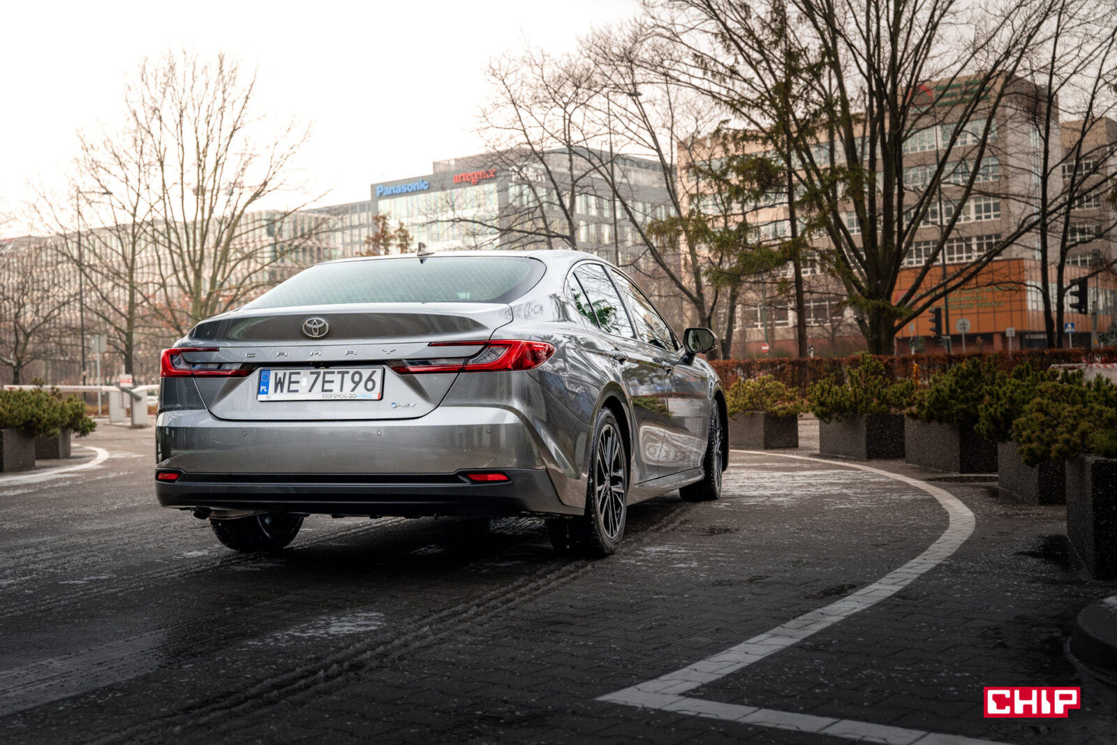 Wracając do samych kamer – w ciągu dnia na nie będziecie narzekać na jakość obrazu, jednak w nocy potrafi być ziarnisty. Czepiałabym się, gdyby Camry została wyceniona jak sedan segmentu premium, ale ponieważ producent nie próbuje oszukiwać klientów, nie ma co narzekać. Tym bardziej że jest tutaj jeden genialny element – spryskiwacz kamery cofania! Auto wie, kiedy jest zabrudzona i pyta kierowcę, czy ma ją wyczyścić. Wystarczy wciśnięcie odpowiedniego przycisku, a po chwili mamy czyściutką kamerę i dobrej jakości obraz! Sprawdzaliśmy to, kiedy w Warszawie pełno było brudnego, roztapiającego śniegu i uwierzcie – nie było najmniejszego problemu, spryskiwacz radził sobie z tym doskonale. Dodatkowym bonusem jest to, że ilość wody i kąt pod jakim kamera jest czyszczona sprawiają, że tył auta nie wygląda jakby zsikało się ono w majtki, w przeciwieństwie choćby do BMW iX. Jak widać, da się to zrobić dobrze. Funkcja jest dostępna tylko w najwyższej wersji wyposażenia, ale nie dziwię się, też bym kazała sobie za coś takiego dopłacać.