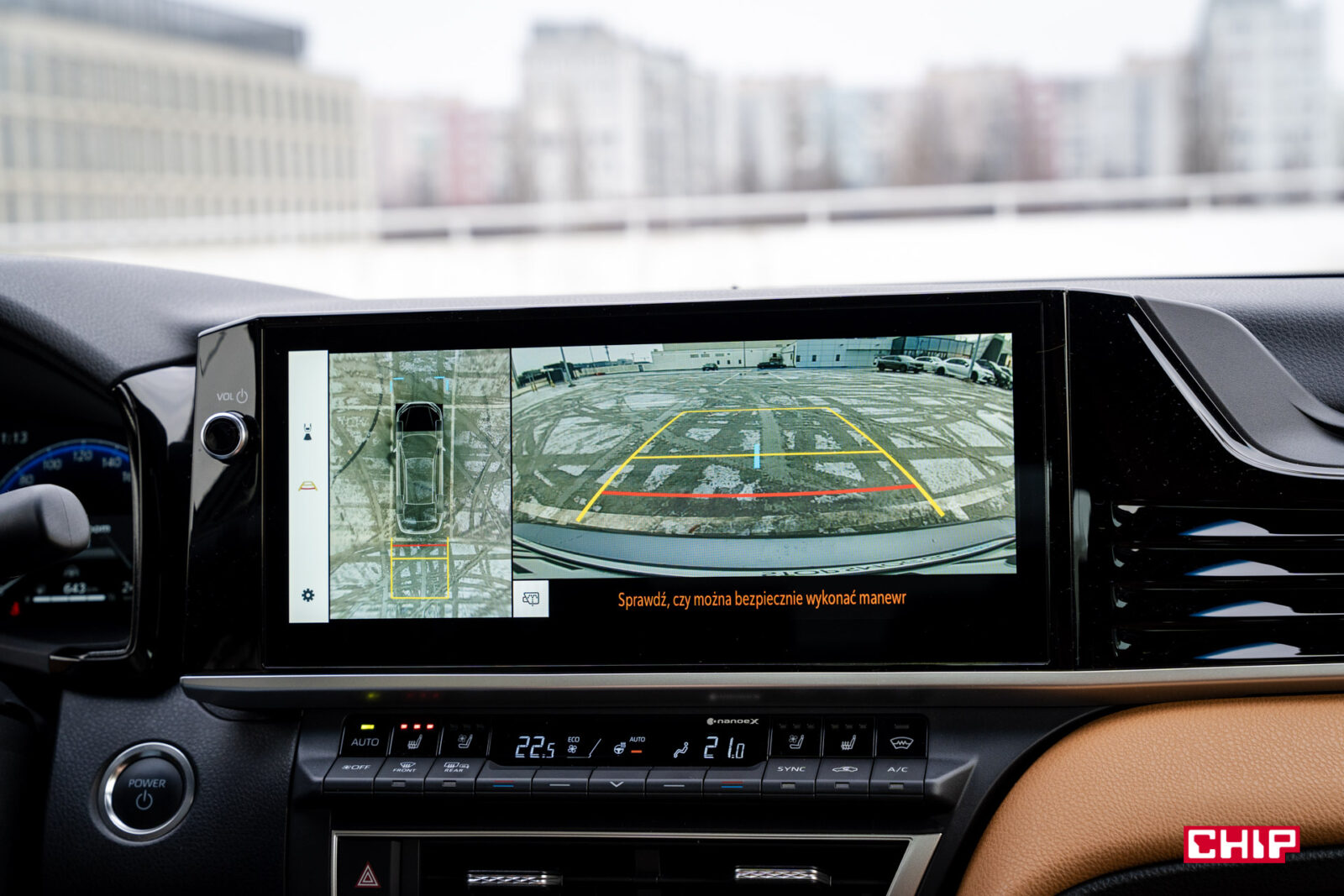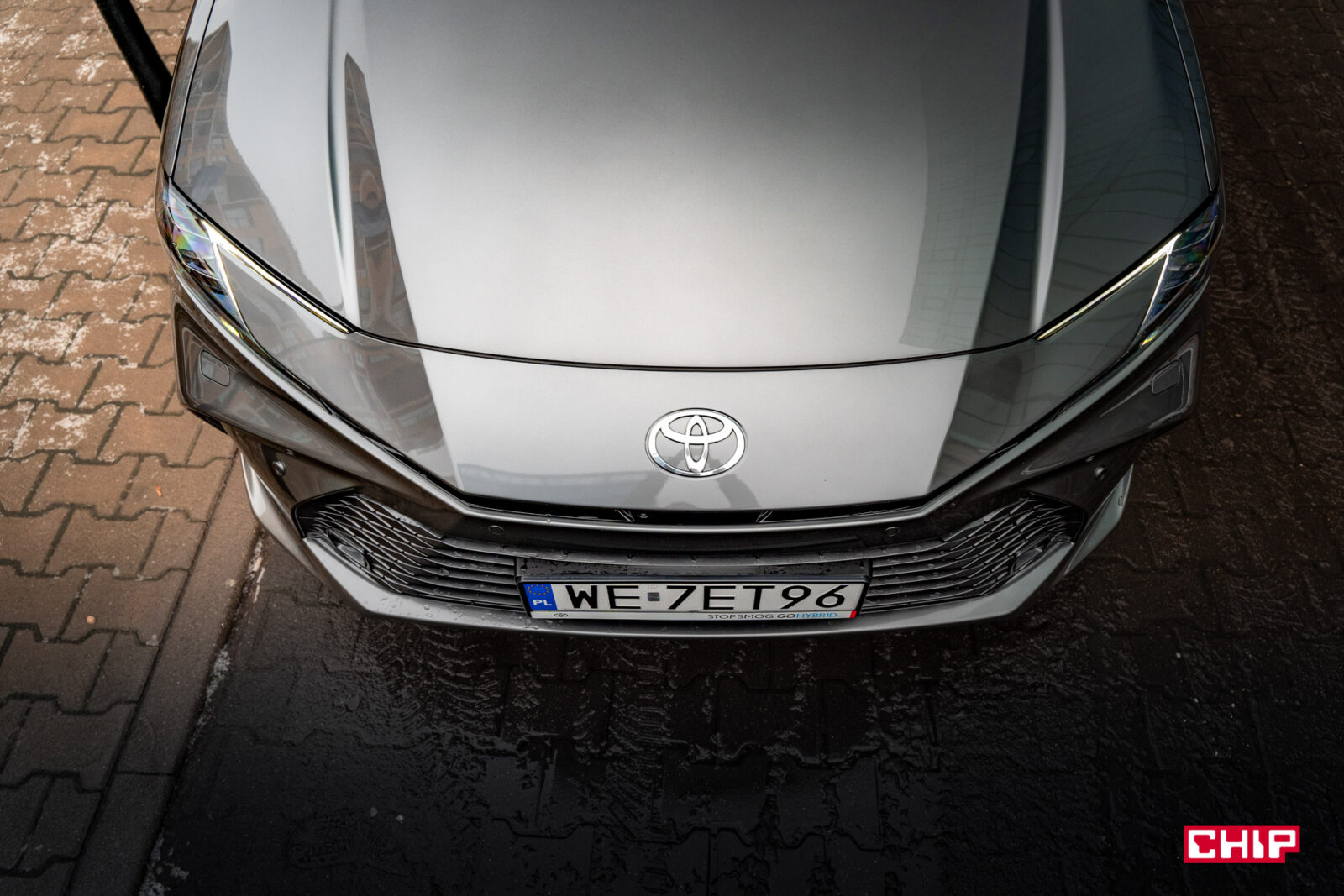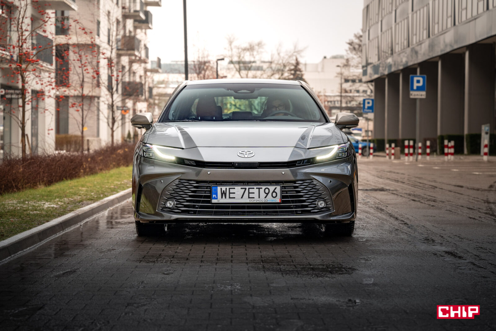 Wracając do samych kamer – w ciągu dnia na nie będziecie narzekać na jakość obrazu, jednak w nocy potrafi być ziarnisty. Czepiałabym się, gdyby Camry została wyceniona jak sedan segmentu premium, ale ponieważ producent nie próbuje oszukiwać klientów, nie ma co narzekać. Tym bardziej że jest tutaj jeden genialny element – spryskiwacz kamery cofania! Auto wie, kiedy jest zabrudzona i pyta kierowcę, czy ma ją wyczyścić. Wystarczy wciśnięcie odpowiedniego przycisku, a po chwili mamy czyściutką kamerę i dobrej jakości obraz! Sprawdzaliśmy to, kiedy w Warszawie pełno było brudnego, roztapiającego śniegu i uwierzcie – nie było najmniejszego problemu, spryskiwacz radził sobie z tym doskonale. Dodatkowym bonusem jest to, że ilość wody i kąt pod jakim kamera jest czyszczona sprawiają, że tył auta nie wygląda jakby zsikało się ono w majtki, w przeciwieństwie choćby do BMW iX. Jak widać, da się to zrobić dobrze. Funkcja jest dostępna tylko w najwyższej wersji wyposażenia, ale nie dziwię się, też bym kazała sobie za coś takiego dopłacać.
