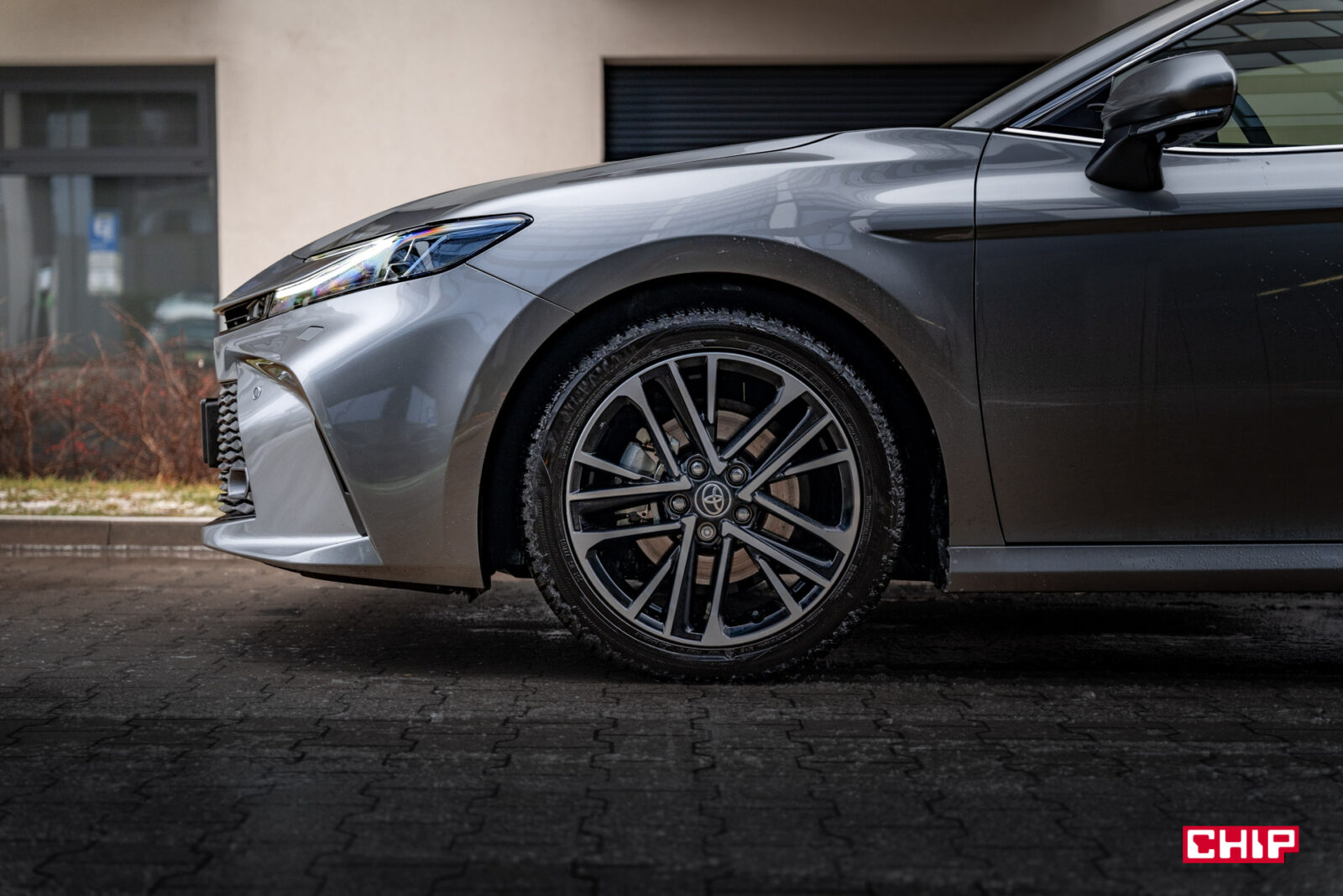Z boku widać, że mamy do czynienia z limuzynowymi wymiarami. Nowa Camry ma 4920 mm długości, 1445 mm wysokości i nie jest przesadnie szeroka, bo z lusterkami jest to 1840 mm. Auto stoi na nieprzesadzonych, ładnie dopasowanych 17 lub 18-calowych felgach.