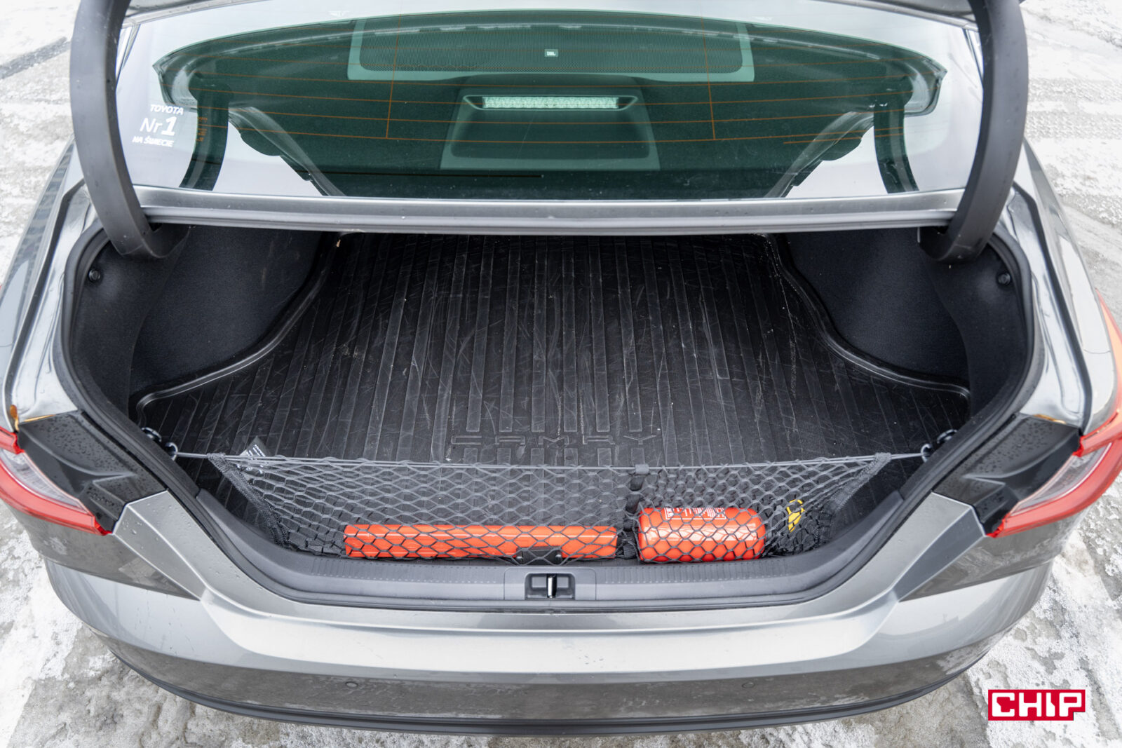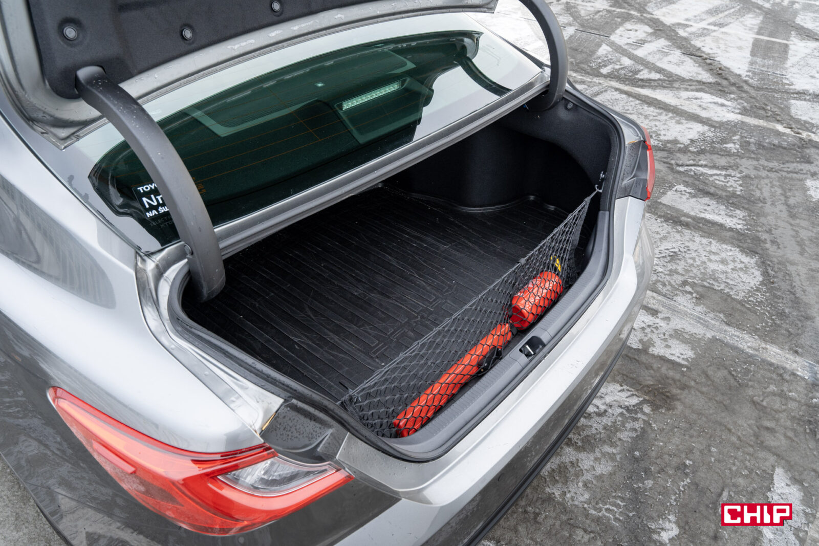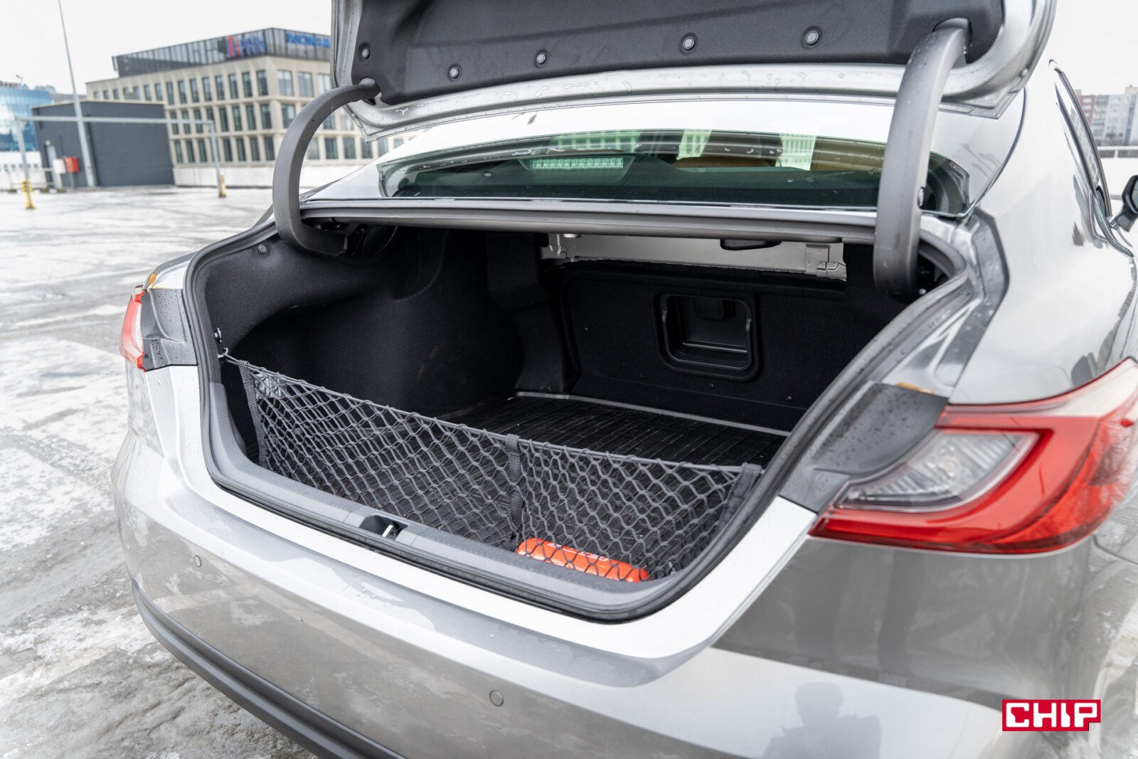 Bagażnik ma pojemność 493 litrów i jak przystało na dużego sedana – jest duży, ale niski. Więc spakujemy tu dużo, ale raczej niewielkich rzeczy. Ogromny plus należy się za siatkę, która wzorowo trzyma wrzuconej do niej rzeczy. To część pakietu cargo, obok gumowej maty w bagażniku, kosztujący 700 zł. W obecnym cenniku jest on dostępny za darmo, więc grzech byłoby nie skorzystać.