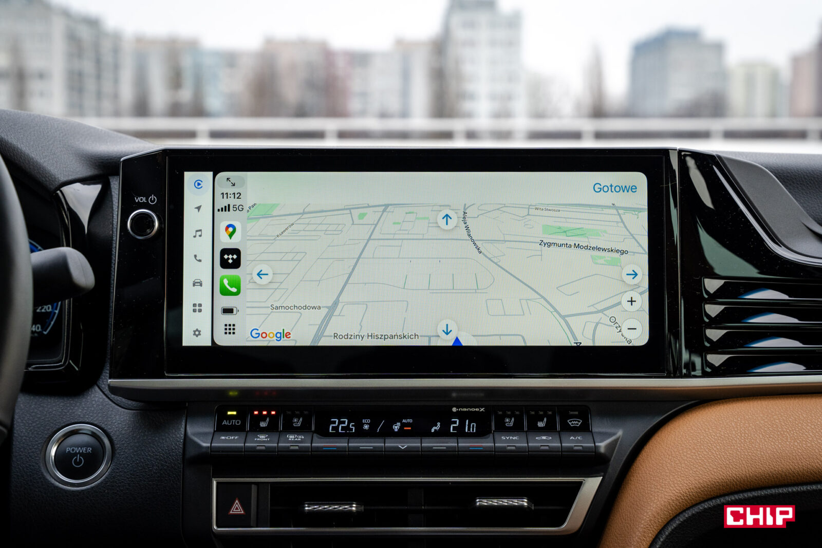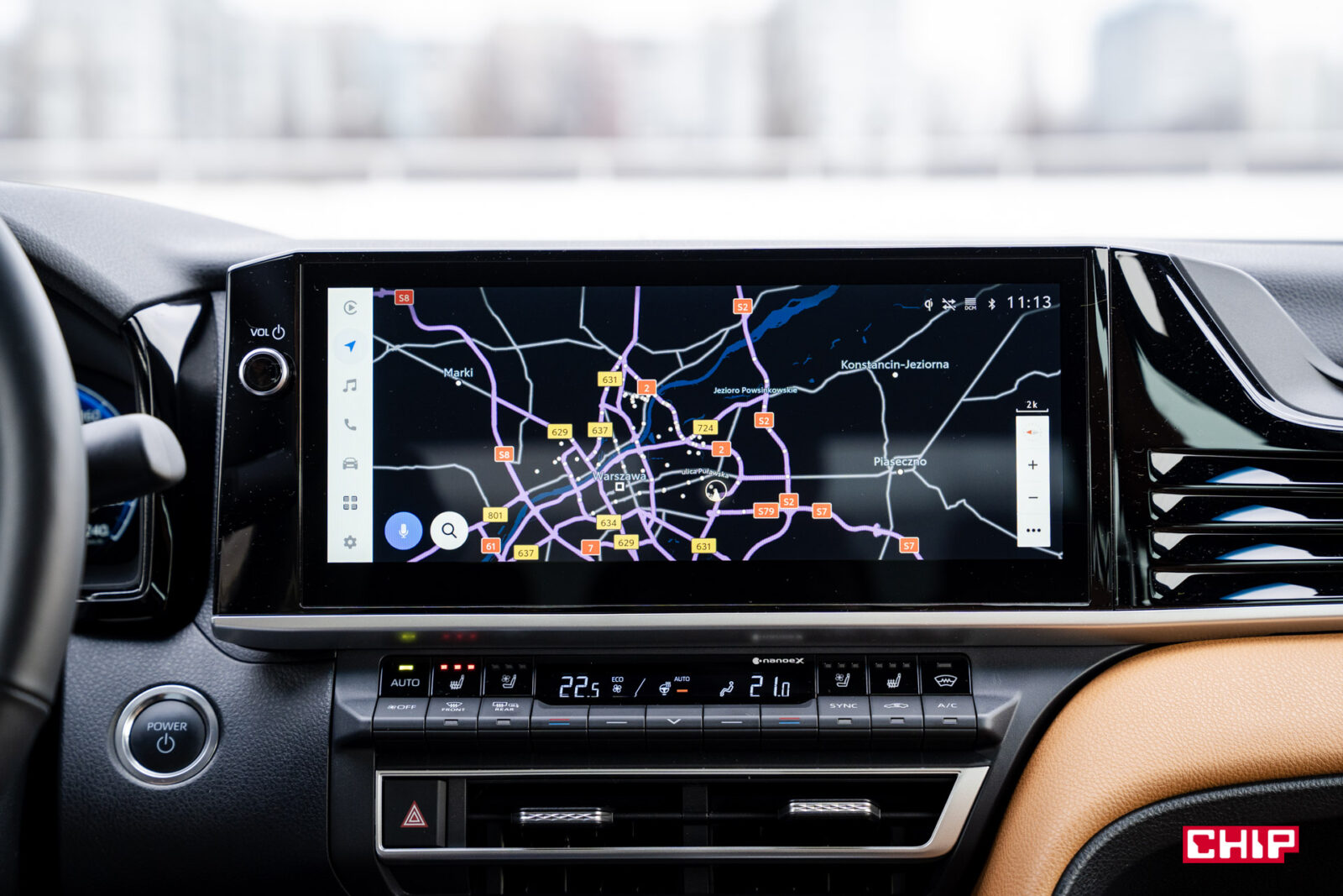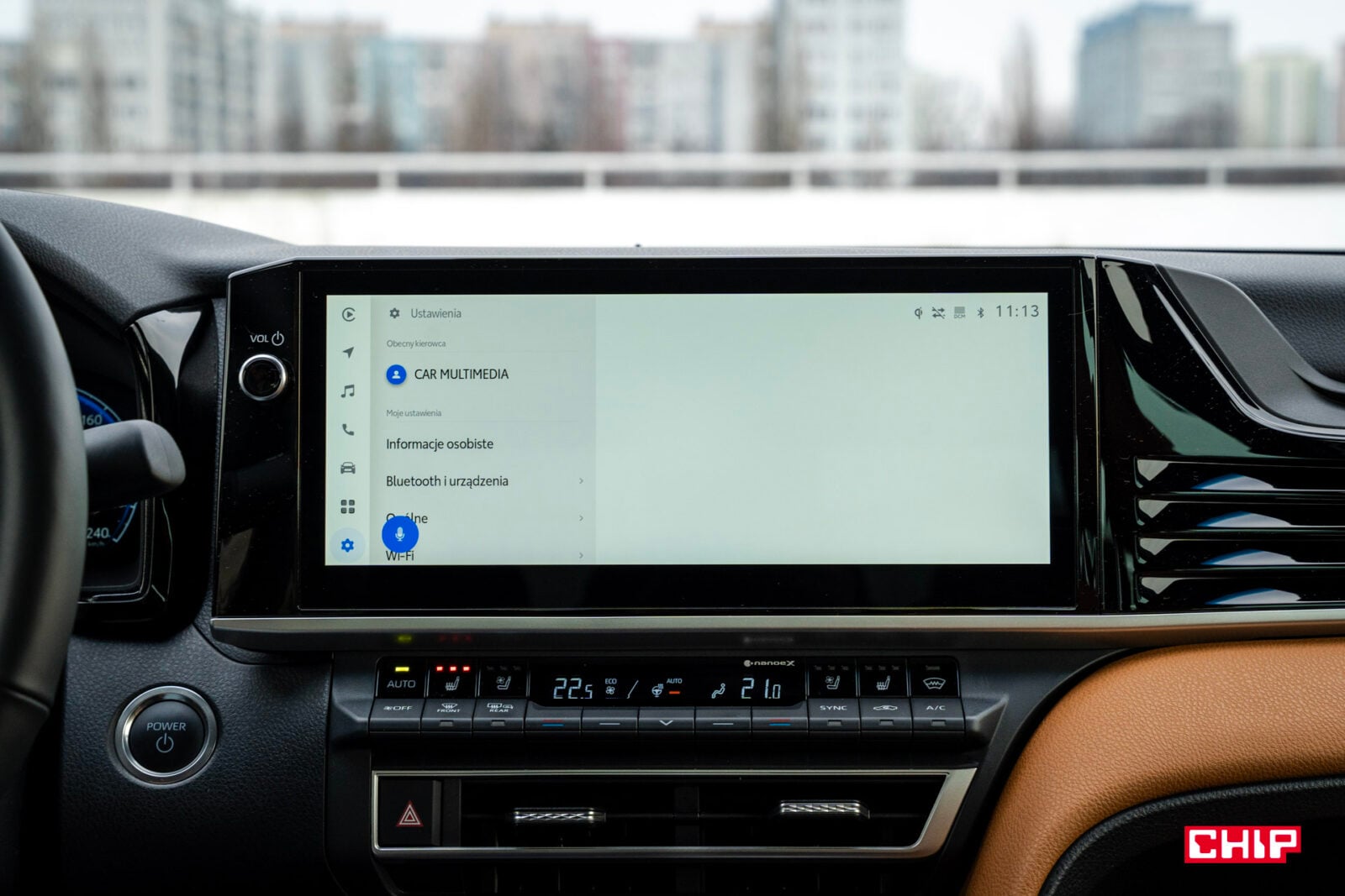Jak w każdej nowej Toyocie, ekran główny służy w zasadzie tylko do obsługi multimediów, nawigacji i łączności ze smartfonem (bezprzewodowy CarPlay i Android Auto). Możemy tu wprowadzić bardzo podstawowe zmiany w ustawieniach np. dźwięku czy klimatyzacji i to tyle. Ekran jest duży, jasny i dobrej jakości.
