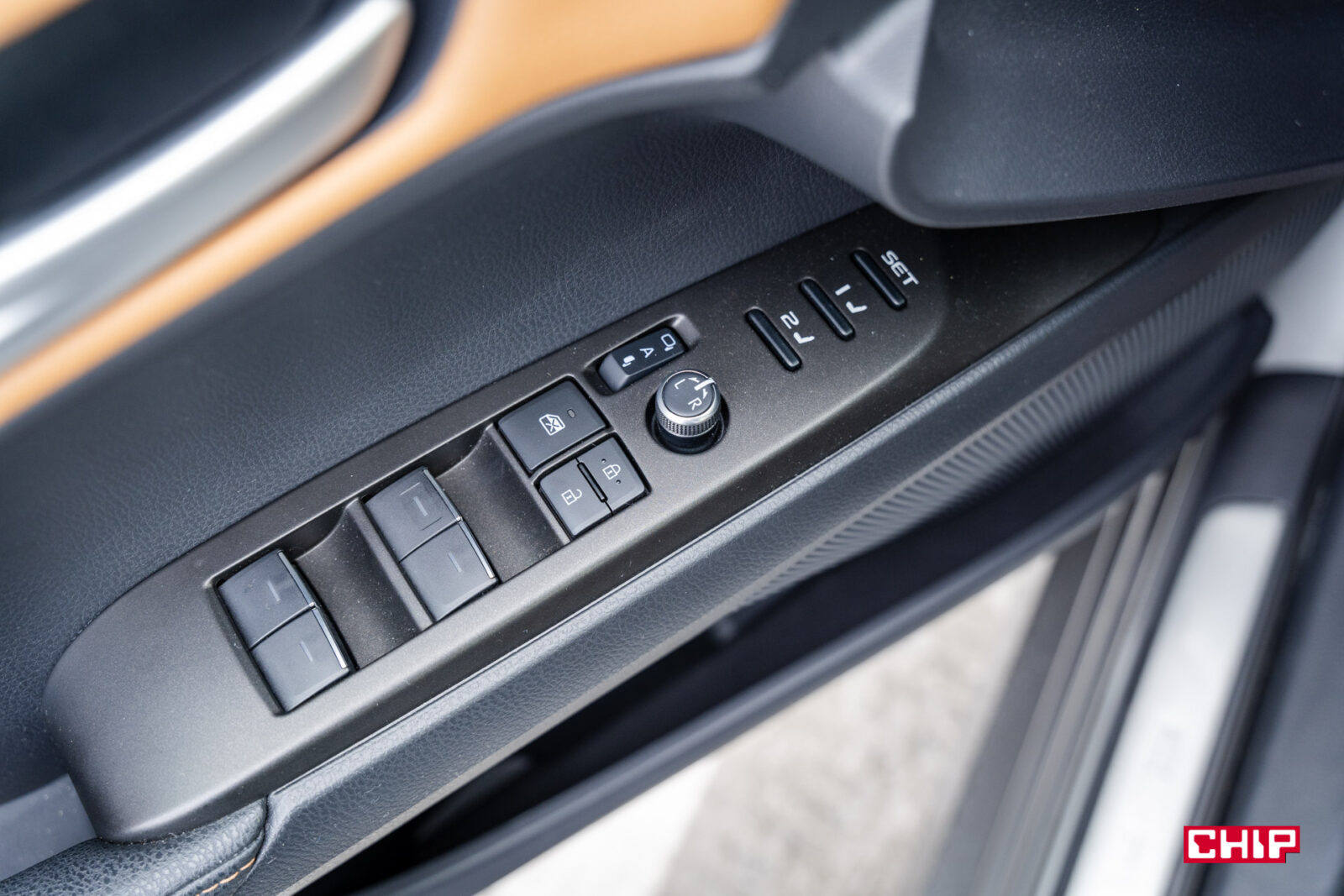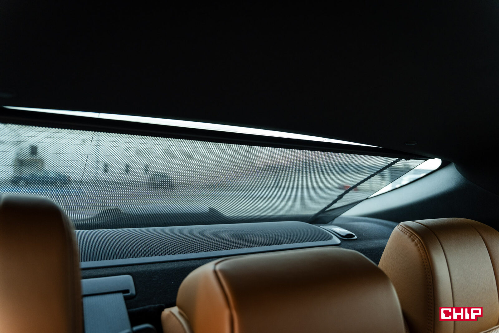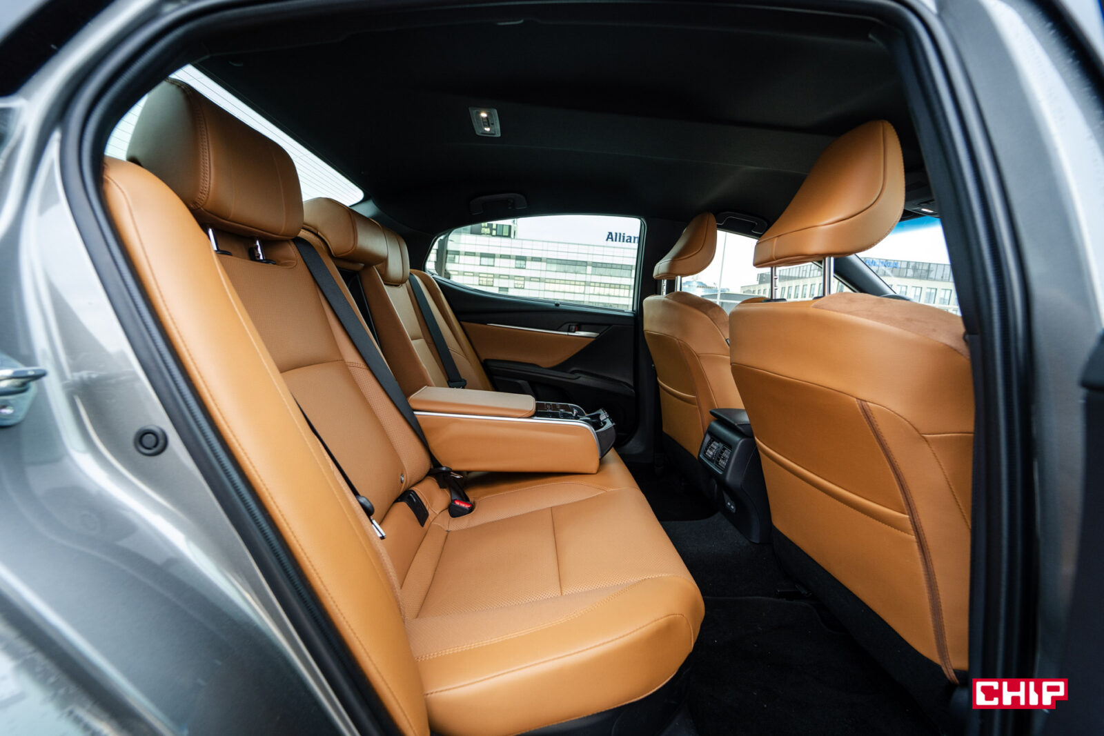 Zaskakująco dużo dzieje się na tylnej kanapie. Miejsca nie brakuje i dwie osoby mogą tu podróżować w wyjątkowo komfortowych warunkach. Opcjonalnie mamy tu grzanie foteli oraz rolety w drzwiach, ale niespodzianka kryje się w podłokietniku. Widzieliśmy to już w Toyocie Mirai i jest to prosta konsola do sterowania multimediami, klimatyzacją oraz pozycją foteli. Ich oparcia są regulowane elektrycznie, a prawdziwą wisienką na torcie jest elektryczna roleta na tylnej szybie, również sterowana z pozycji konsoli w podłokietniku i co ciekawe, nie da się jej rozsunąć lub zasunąć w żaden inny sposób.