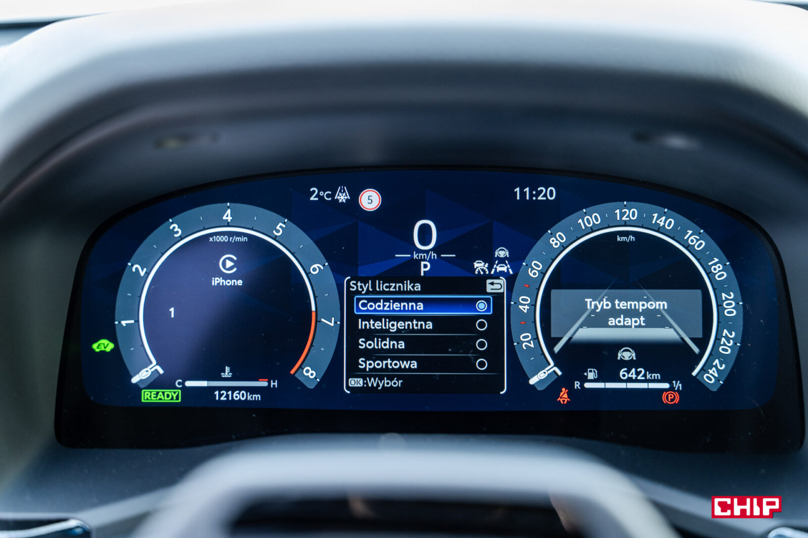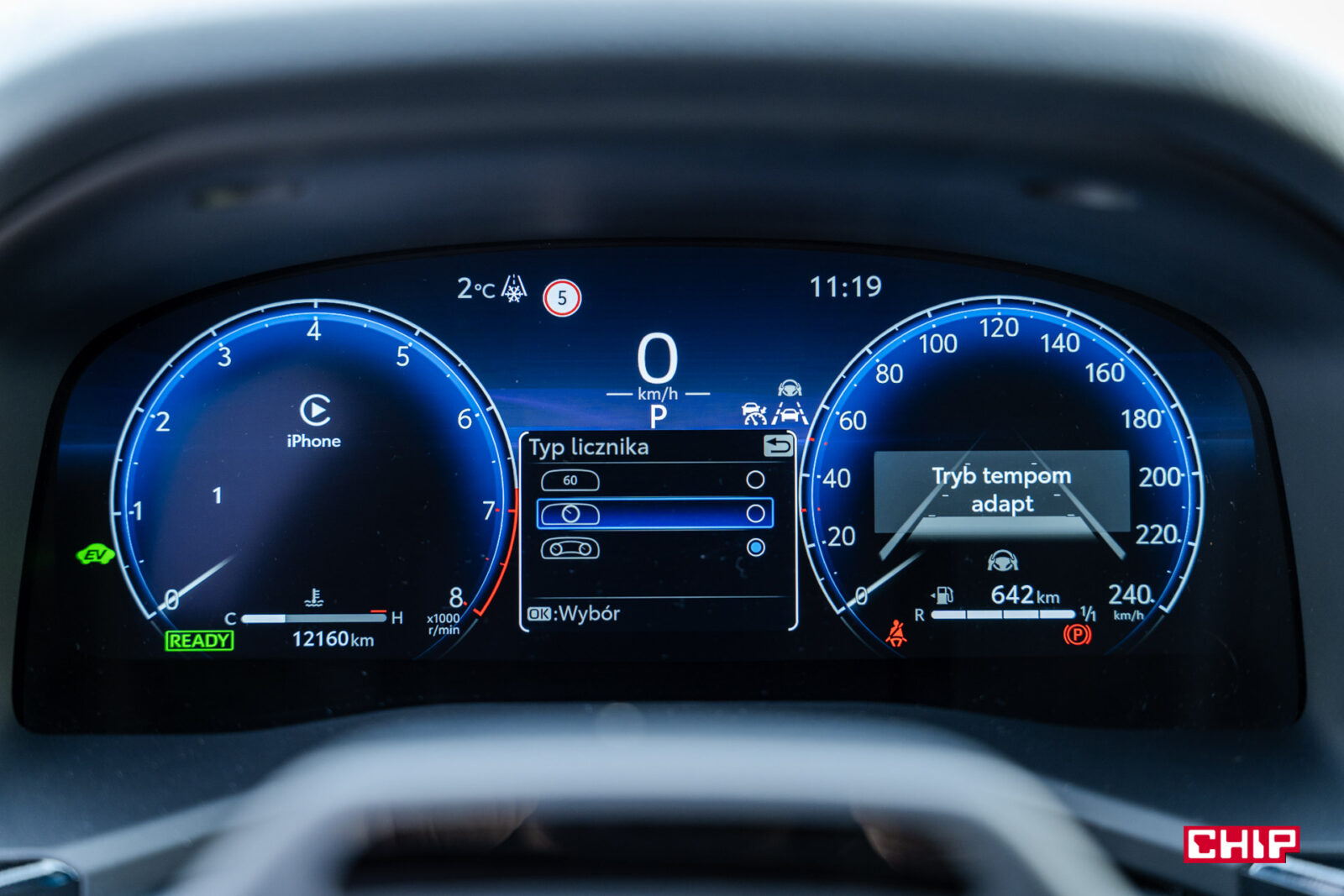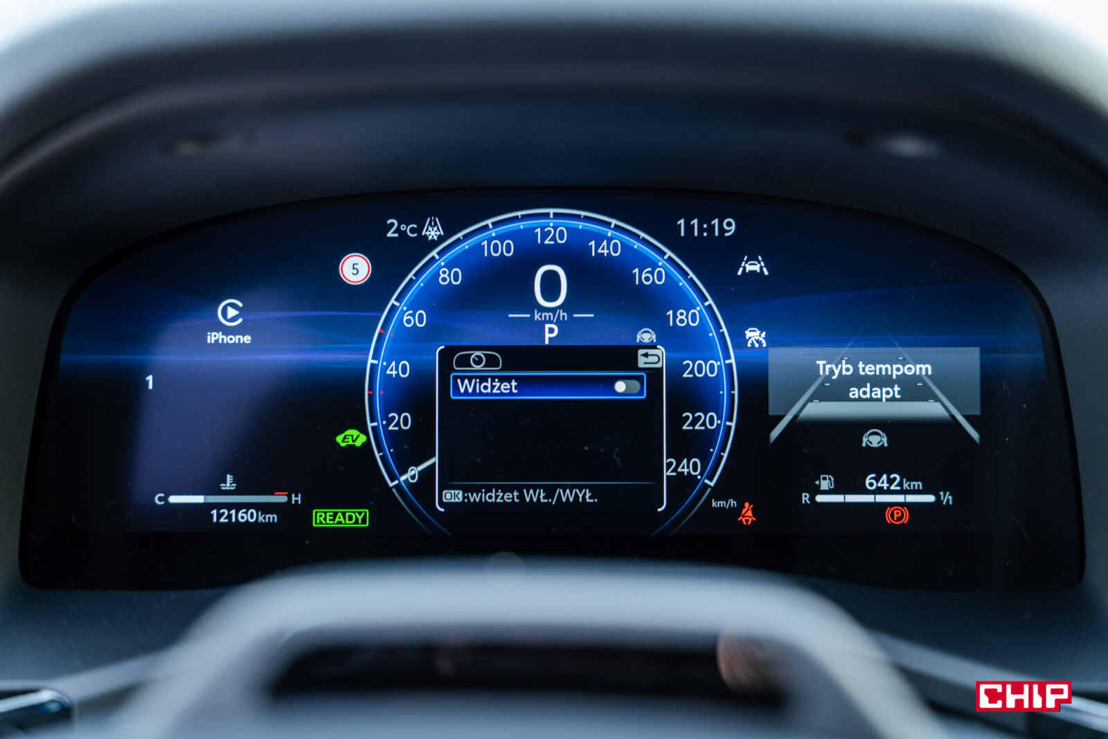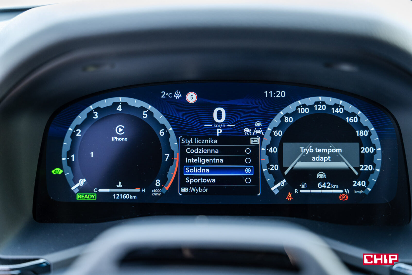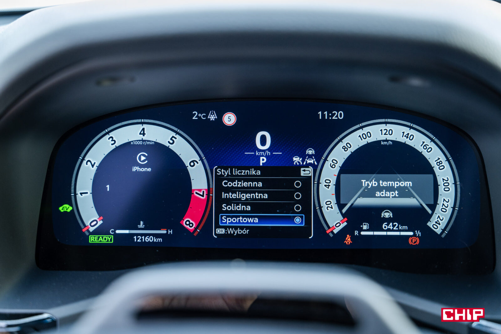 Cyfrowy ekran kierowcy w najtańszej wersji wyposażenia Comfort ma przekątną 7 cali, w pozostałych 12,3 cala, więc zajmuje cała dostępną powierzchnię. Do dyspozycji mamy kilka różnych wariantów zegarów i spory zakres personalizacji. To również tutaj wprowadzamy wszystkie ustawienia dotyczące asystentów i działania auta. Po Menu poruszamy się za pomocą przycisków na kierownicy i początkowo dostanie się do ustawień bywa średnio intuicyjne, bo raz trzeba kliknąć guzik, raz go przytrzymać… Koniec końców szybko można to opanować, bo to również w tym miejscu wyłączamy asystenta prędkości (ISA), który raczy nas piskiem za każdym razem, kiedy auto uzna, że ją przekraczamy.