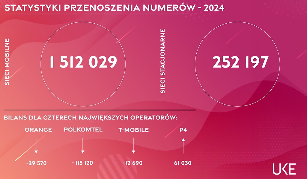 Według danych UKE, w całym 2023 roku w Polsce przeniesiono 1 464 262 numery w sieciach mobilnych. Ostatnie 12 miesięcy zamknęło się z wynikiem 1 512 029 numerów, a zatem mamy do czynienia ze wzrostem i to sporym, bo o niemal 48 tys. Najgorzej w bilansie zysków i strat zdecydowanie wypadł Polkomtel, czyli operator sieci Plus, tracąc łącznie aż 115 120 numerów. Drugim w kolejności skali strat okazał się Orange Polska – stracił w 2024 roku 39 570 numerów. Niechlubne podium zamyka T-Mobile, z którego bazy wyparowało w minionym roku 12 690 numerów. Jedynym zwycięzcą okazał się P4 (operator sieci Play, dane bez b. UPC Polska) zyskując w 2024 roku 61 030 użytkowników kart SIM.