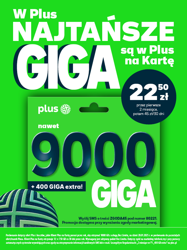 Plus wchodzi w nowy rok z przytupem, wprowadzając dwie nowości dla klientów opcji Na Kartę – pakiet 100 GB (użytkownik otrzymuje 85 GB w ramach pakietu oraz 15 GB z doładowania za 45zł) oraz dodatkowy bonus w postaci aż 9000 GB. Nowi klienci przez pierwsze dwa miesiące będą mogli skorzystać z promocji na pakiet 100 GB za połowę ceny – 22,50 zł. Oprócz tego oczywiście dostaną dostęp do darmowych rozmów i SMS-ów bez limitu. To naprawdę świetna opcja dla wszystkich, którym zależy na dużym pakiecie danych, do wykorzystania na rozrywkę, pracę czy naukę.