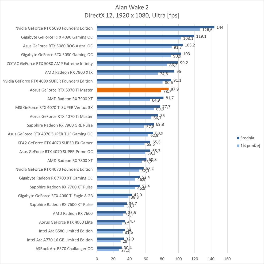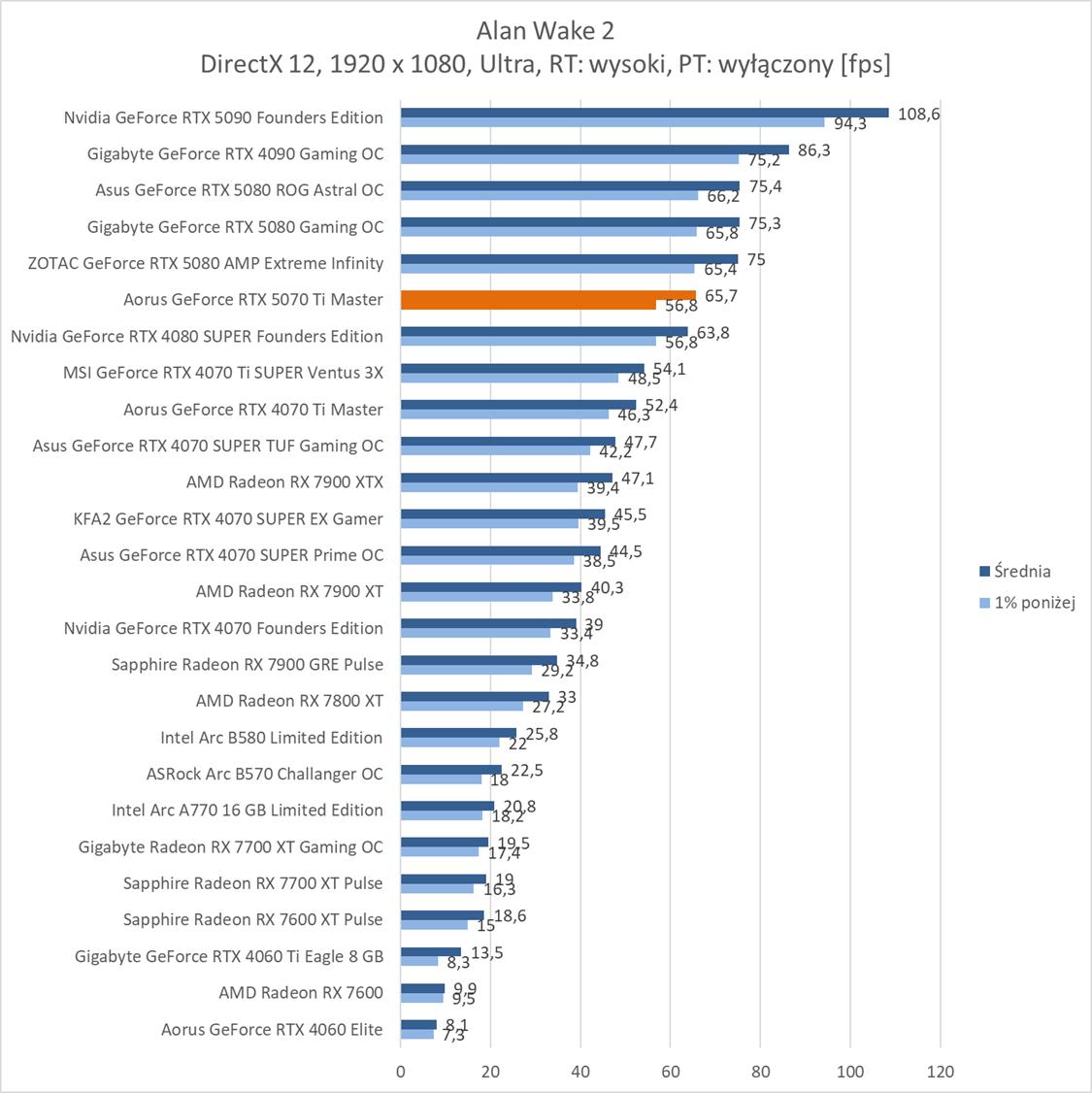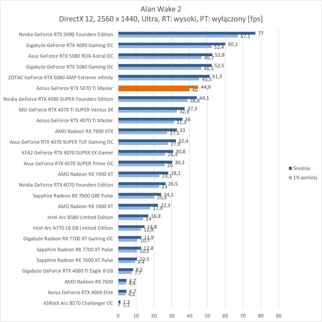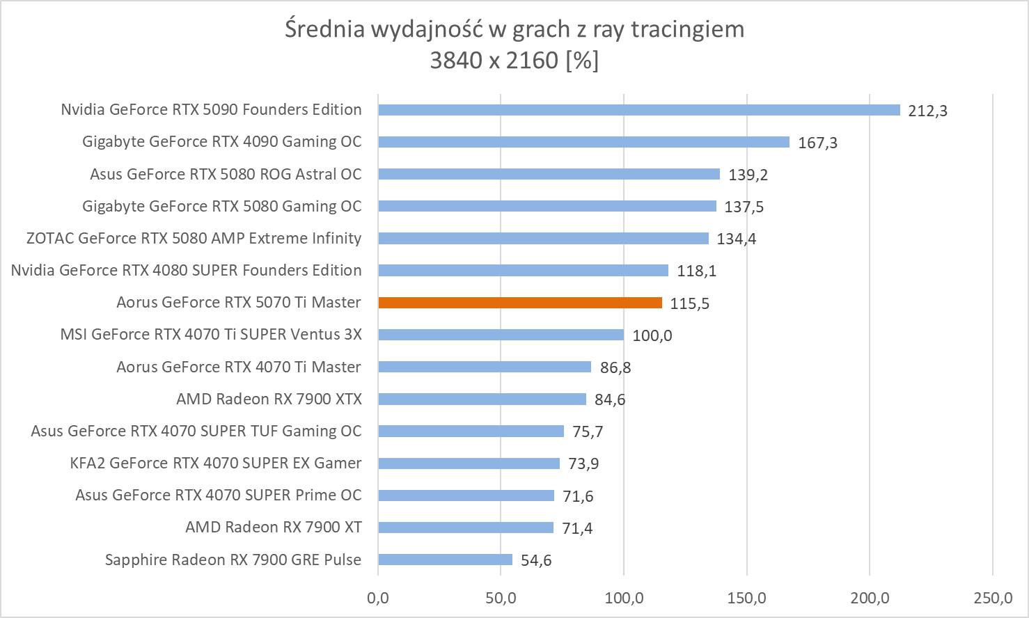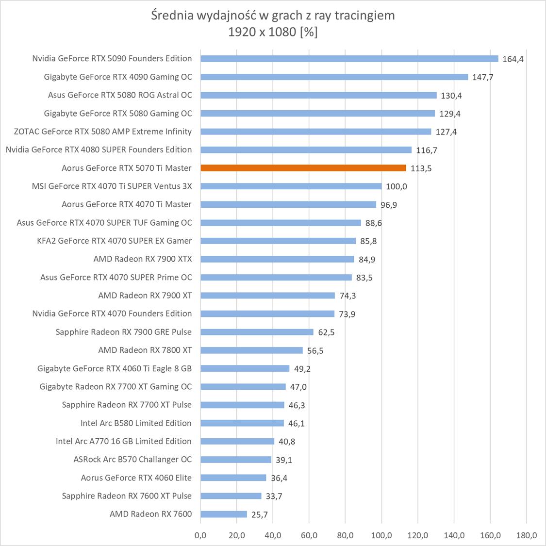 W grach z RT jest dosyć podobnie. Strata do RTX 5080 to kolejno ok. 12,2%, 14% oraz 16,4%. Z kolei przewaga nad RTX 4070 Ti SUPER wynosi 13,5%, 14,3% i 15,5%. Karta plasuje się więc pomiędzy tymi modelami. W porównaniu do RTX 4070 Ti mamy większe wyniki o średnio ok. 17,1%, 20,1% i 33,1%. Warto też zauważyć, że mamy naprawdę sporą przewagę nad 7900 XTX, która wynosi ok. 33,7%, 33,4% oraz 36,5%.
