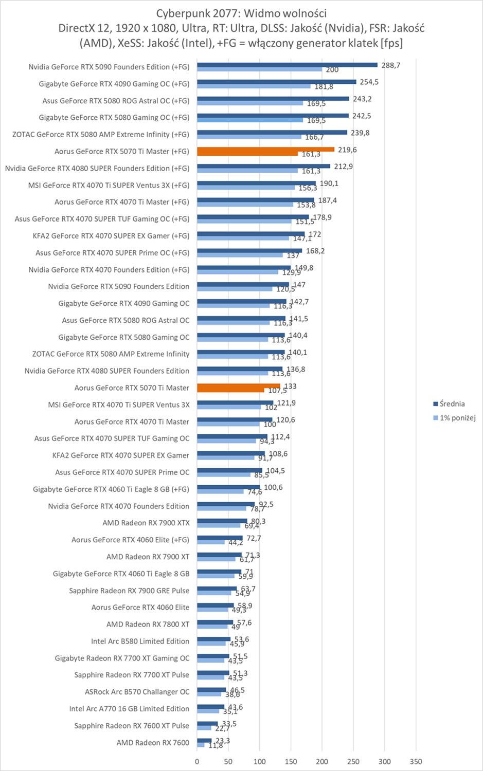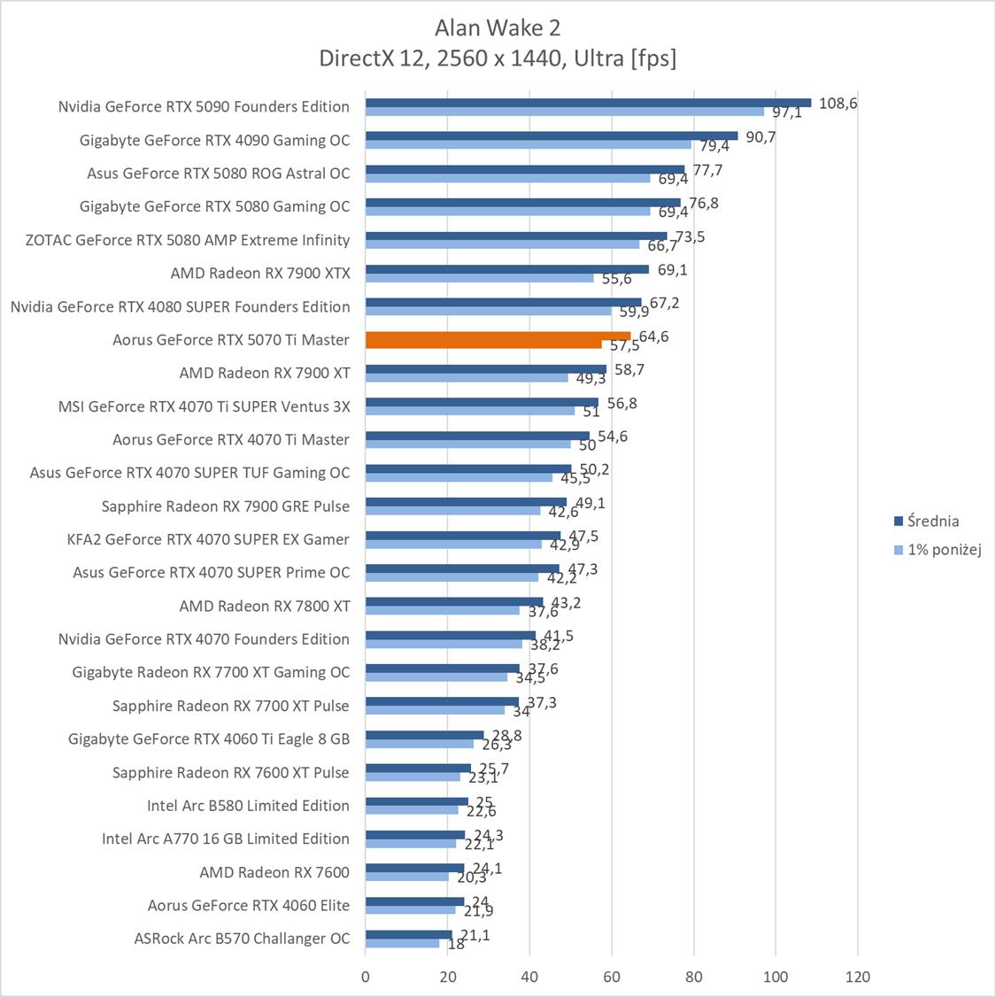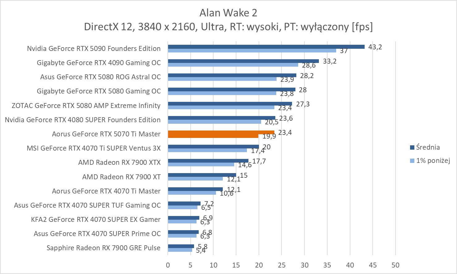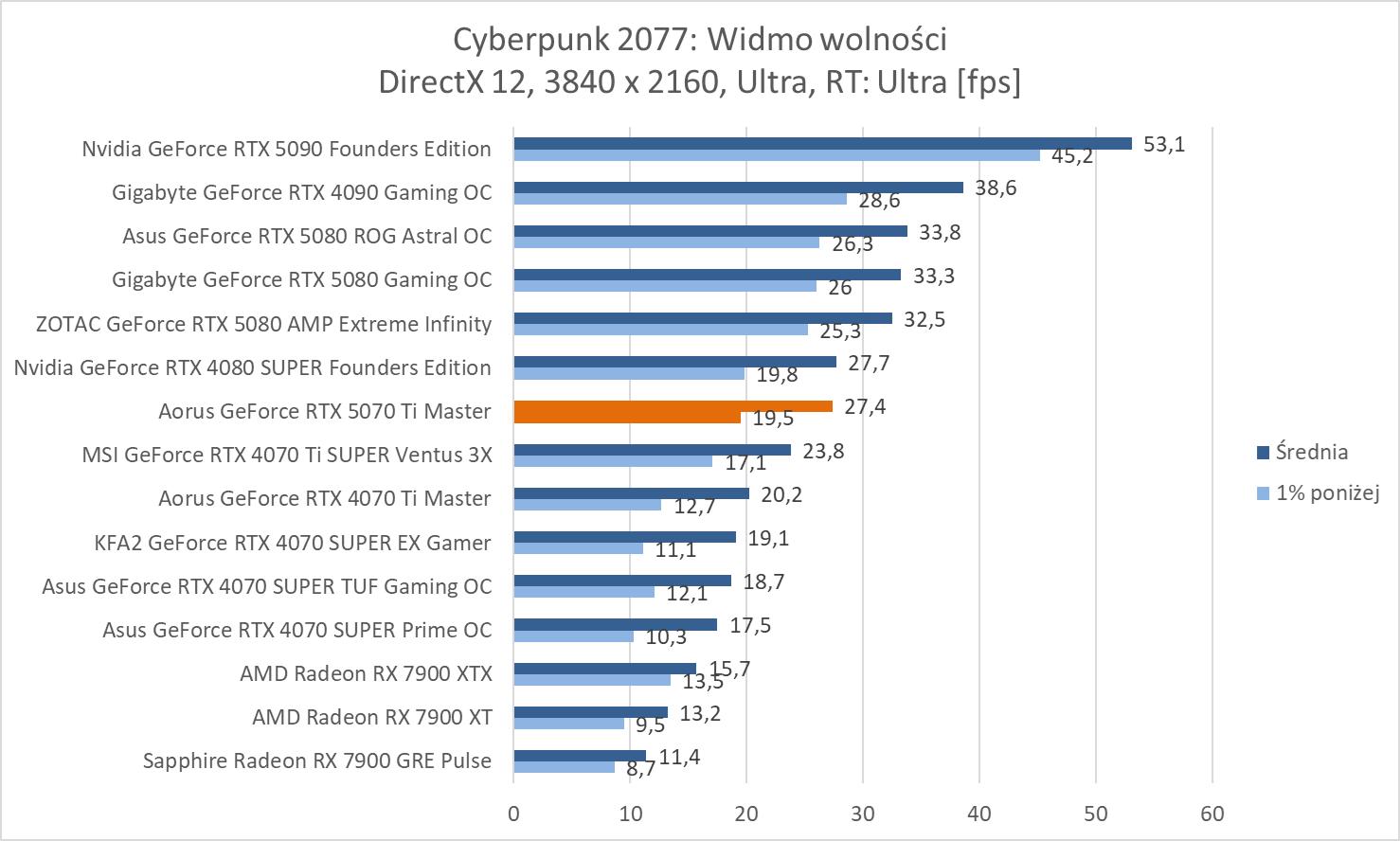 W grach z RT jest dosyć podobnie. Strata do RTX 5080 to kolejno ok. 12,2%, 14% oraz 16,4%. Z kolei przewaga nad RTX 4070 Ti SUPER wynosi 13,5%, 14,3% i 15,5%. Karta plasuje się więc pomiędzy tymi modelami. W porównaniu do RTX 4070 Ti mamy większe wyniki o średnio ok. 17,1%, 20,1% i 33,1%. Warto też zauważyć, że mamy naprawdę sporą przewagę nad 7900 XTX, która wynosi ok. 33,7%, 33,4% oraz 36,5%.