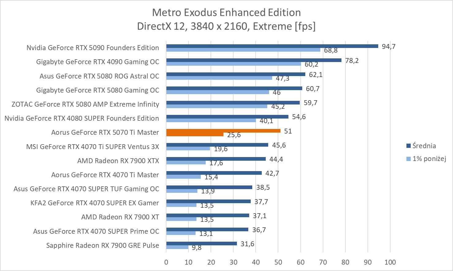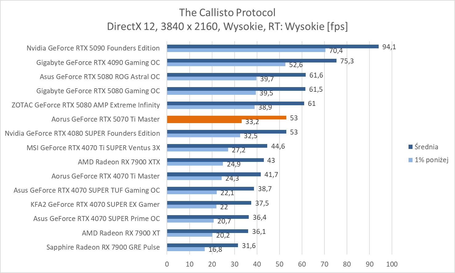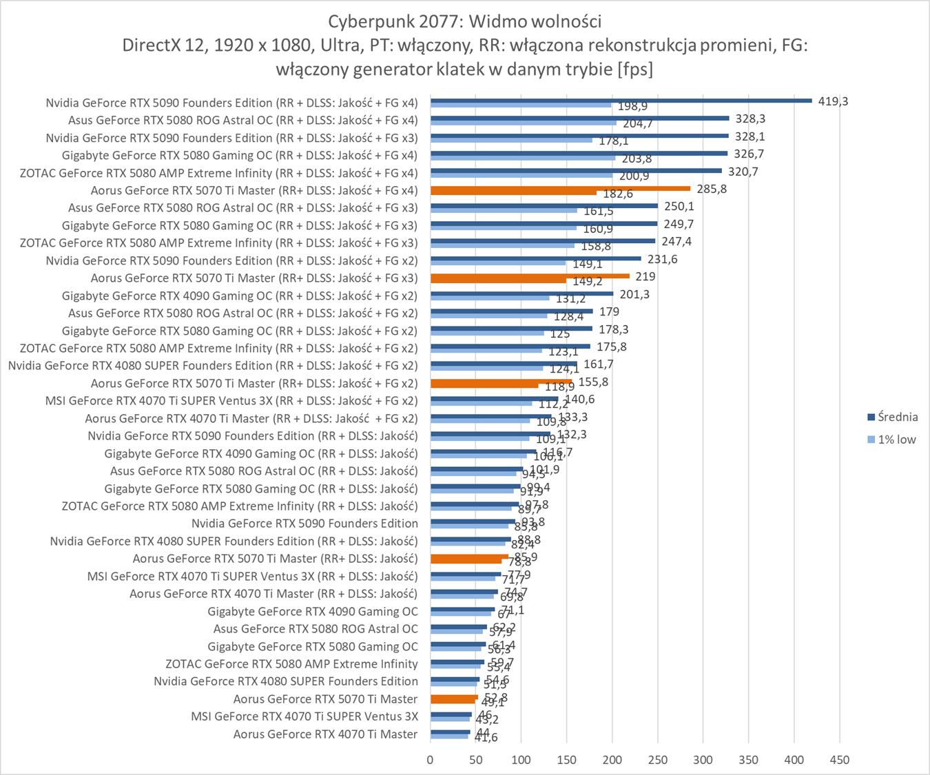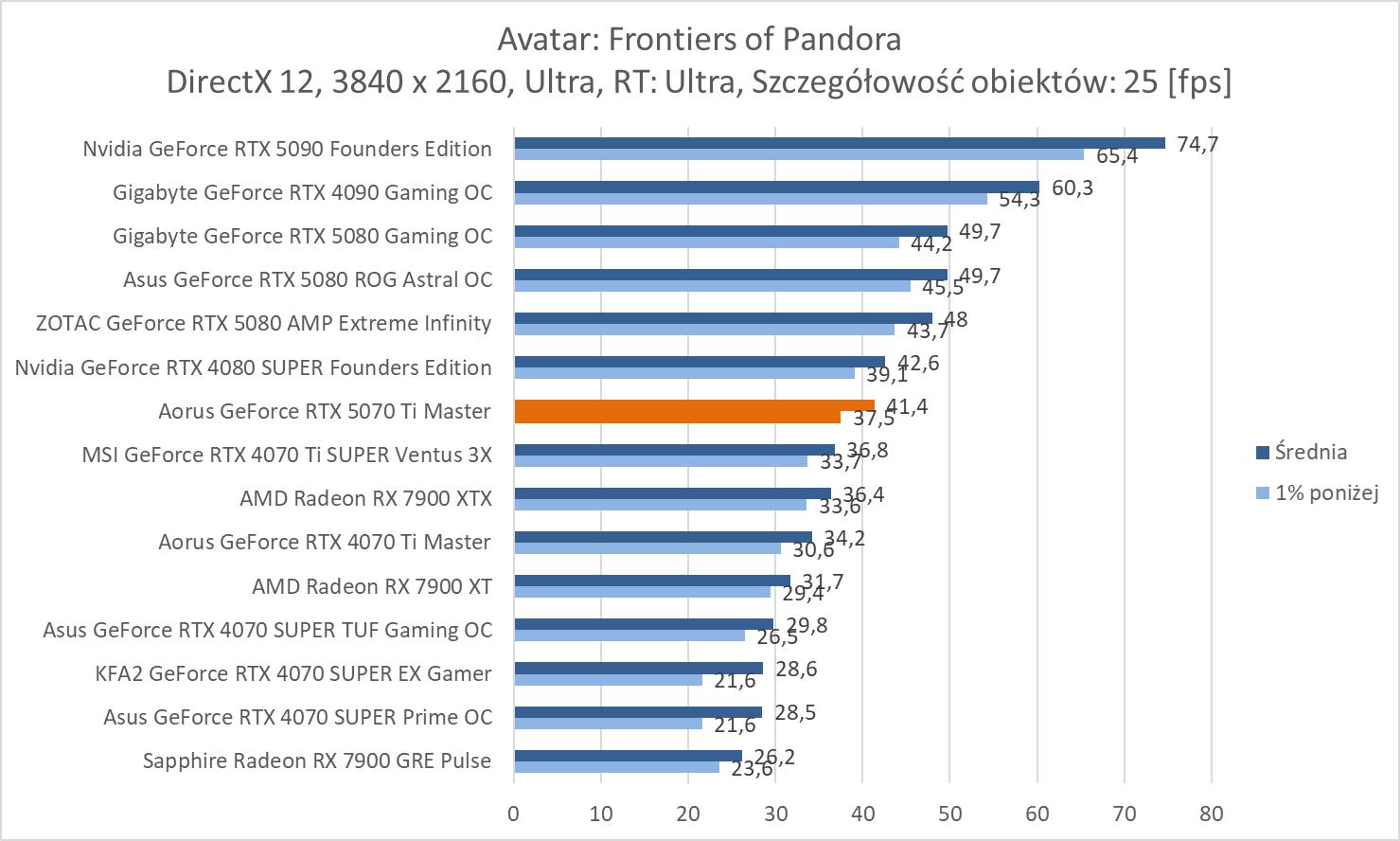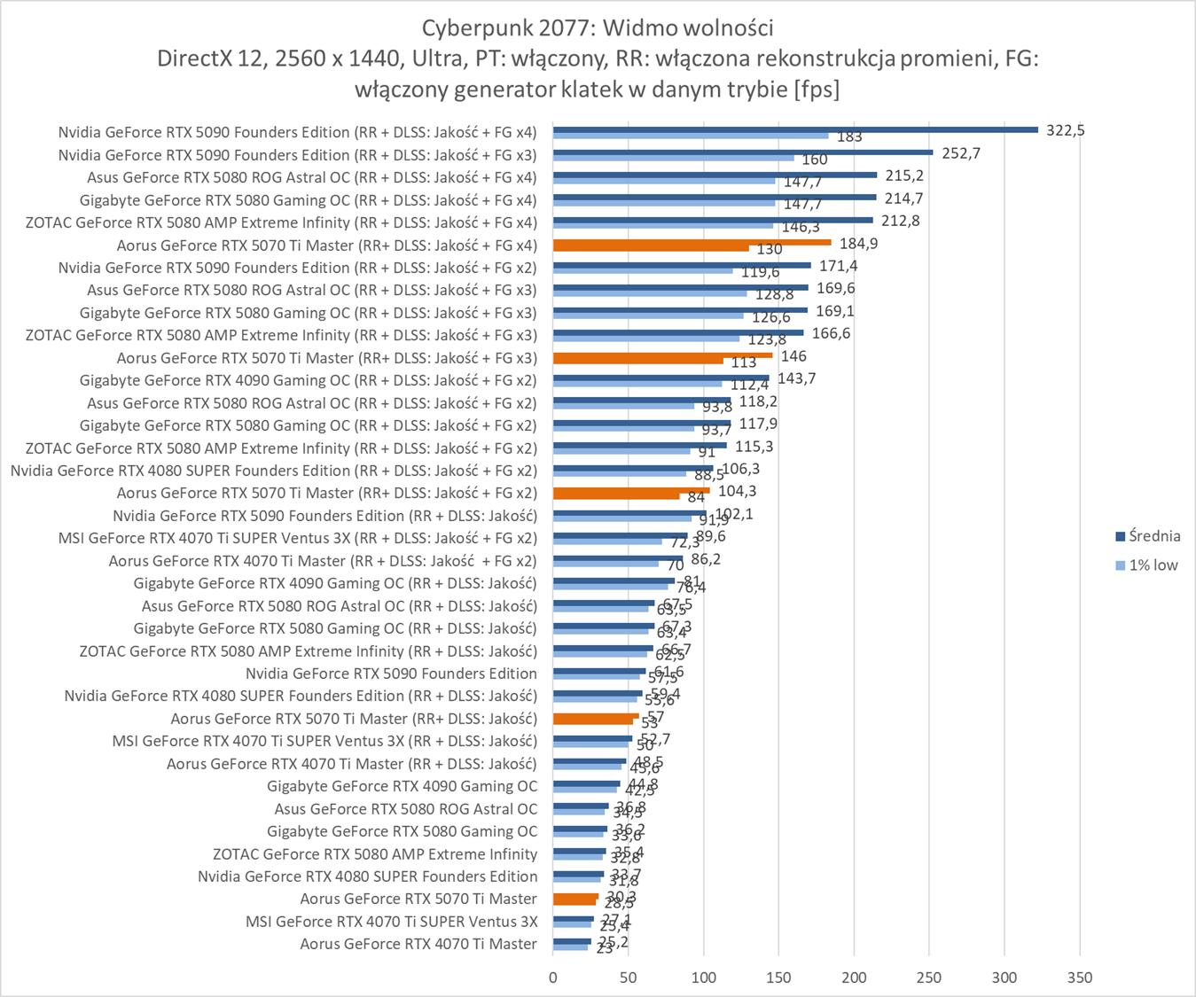 W grach z RT jest dosyć podobnie. Strata do RTX 5080 to kolejno ok. 12,2%, 14% oraz 16,4%. Z kolei przewaga nad RTX 4070 Ti SUPER wynosi 13,5%, 14,3% i 15,5%. Karta plasuje się więc pomiędzy tymi modelami. W porównaniu do RTX 4070 Ti mamy większe wyniki o średnio ok. 17,1%, 20,1% i 33,1%. Warto też zauważyć, że mamy naprawdę sporą przewagę nad 7900 XTX, która wynosi ok. 33,7%, 33,4% oraz 36,5%.