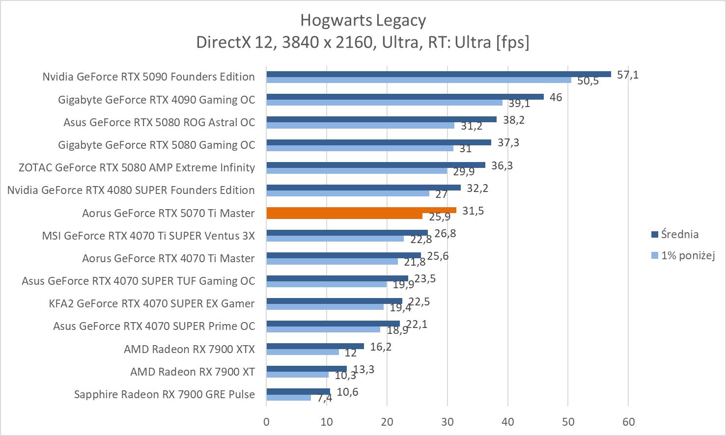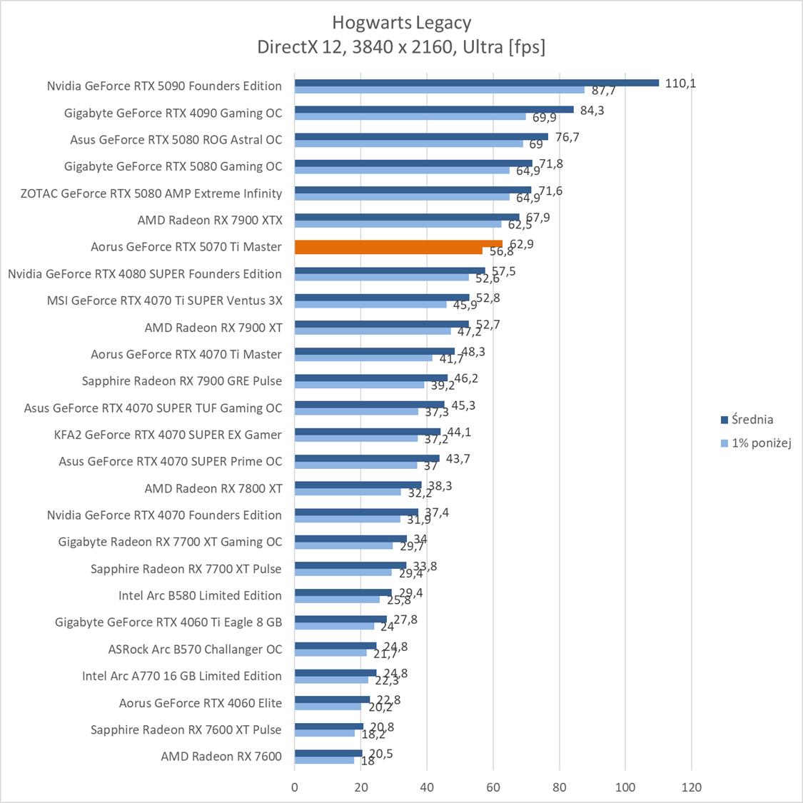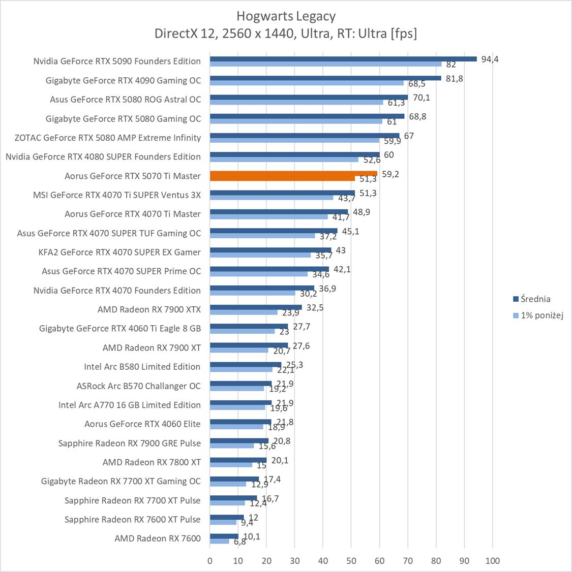 W kolejnej w 3 grach jest poniżej 60 fps, ale w takim Hogwarts Legacy mamy 59,2 fps – tylko minimalnie poniżej. Widać więc, że karta też dobrze tutaj sobie radzi.