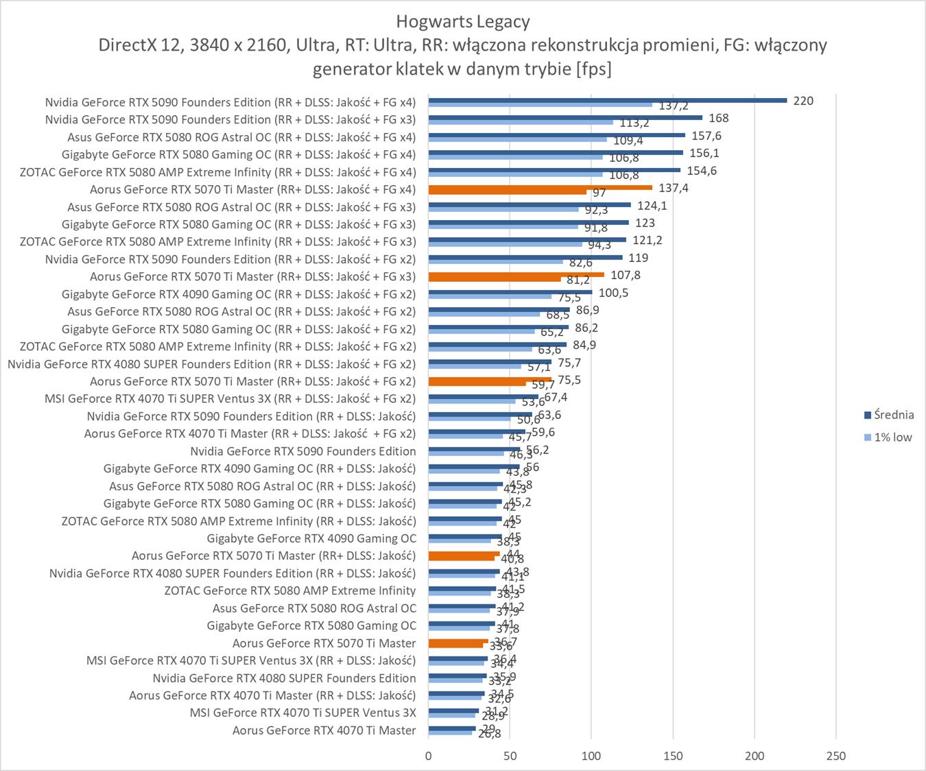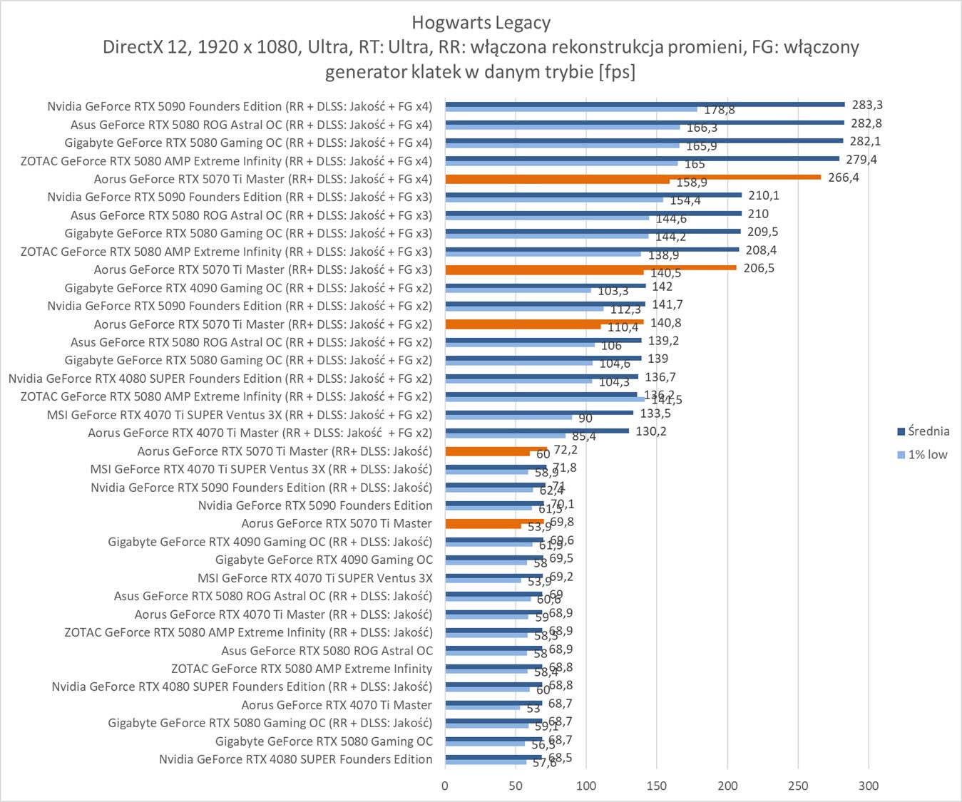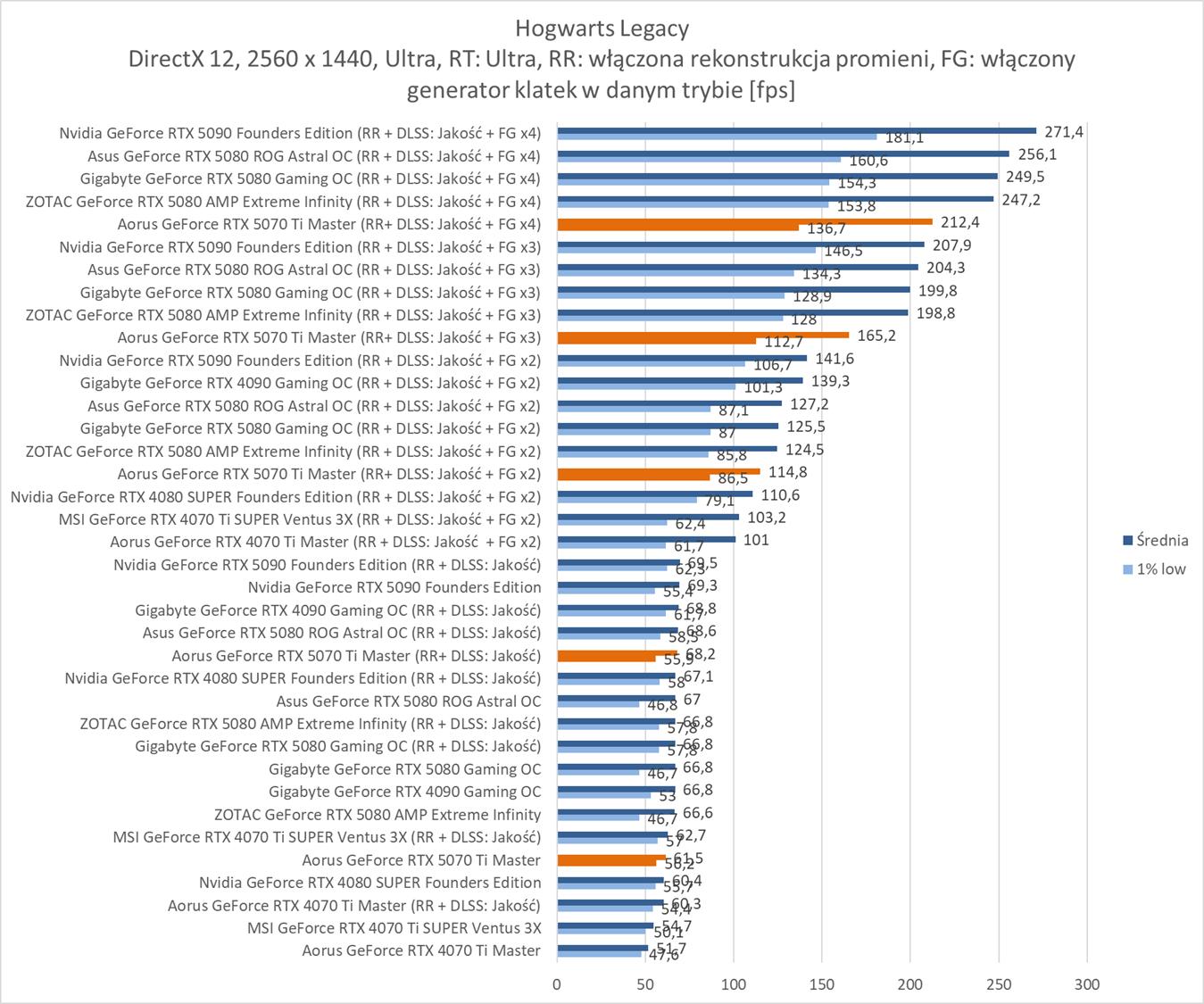 W kolejnej w 3 grach jest poniżej 60 fps, ale w takim Hogwarts Legacy mamy 59,2 fps – tylko minimalnie poniżej. Widać więc, że karta też dobrze tutaj sobie radzi.