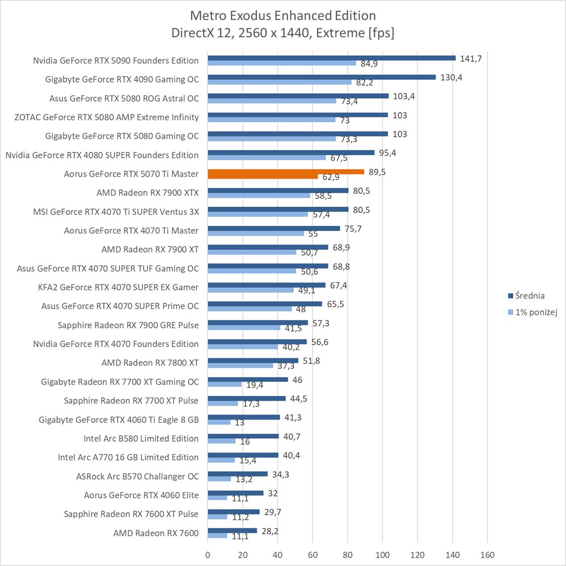Aorus GeForce RTX 5070 Ti Master ma podwójny BIOS z fizycznym przełącznikiem umieszczonym z boku. Taktowanie boost jest takie samo na obu i wynosi 2670 MHz. Mamy więc naprawdę spore OC względem zwykłych wersji. Natomiast w benchmarku Metro Exodus Enhanced Edition 2560 × 1440 px (ustawienia Extreme) zanotowaliśmy średnio 2863 MHz. Jak zawsze przypominamy o obecności DLSS 4, z generatorem wielu klatek. Jego działanie również sprawdzimy w testach.