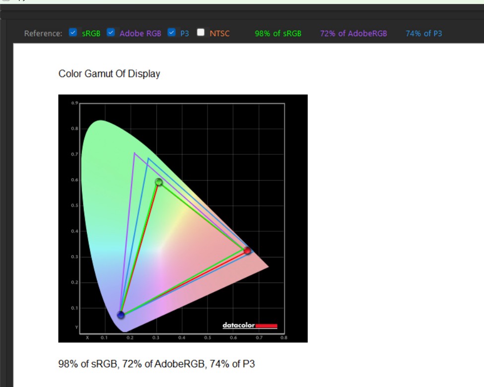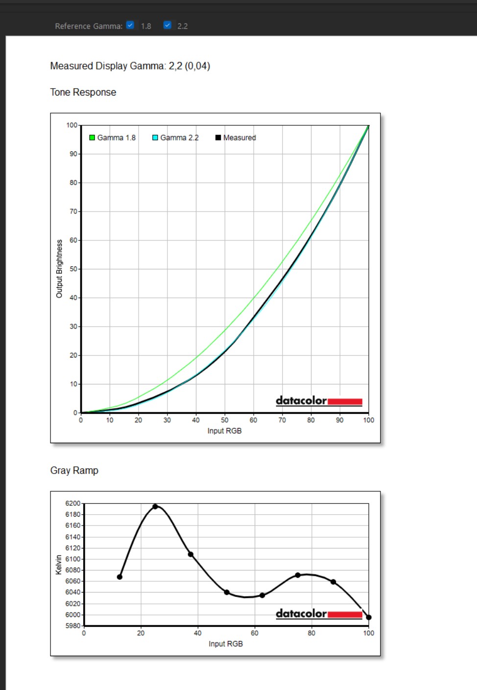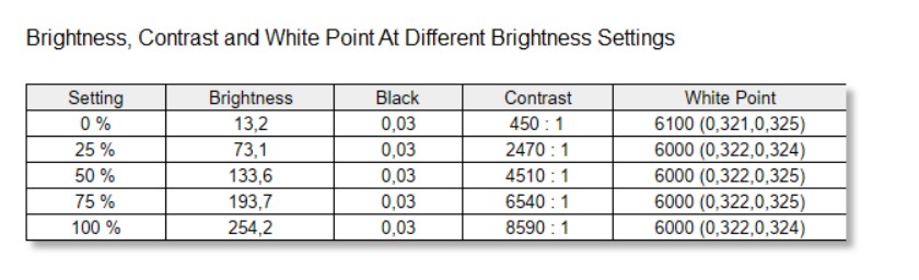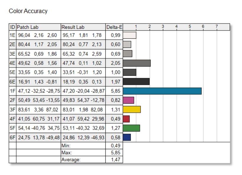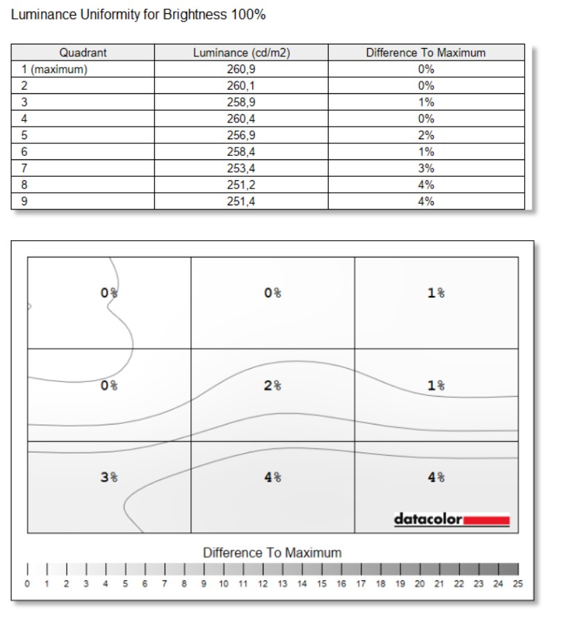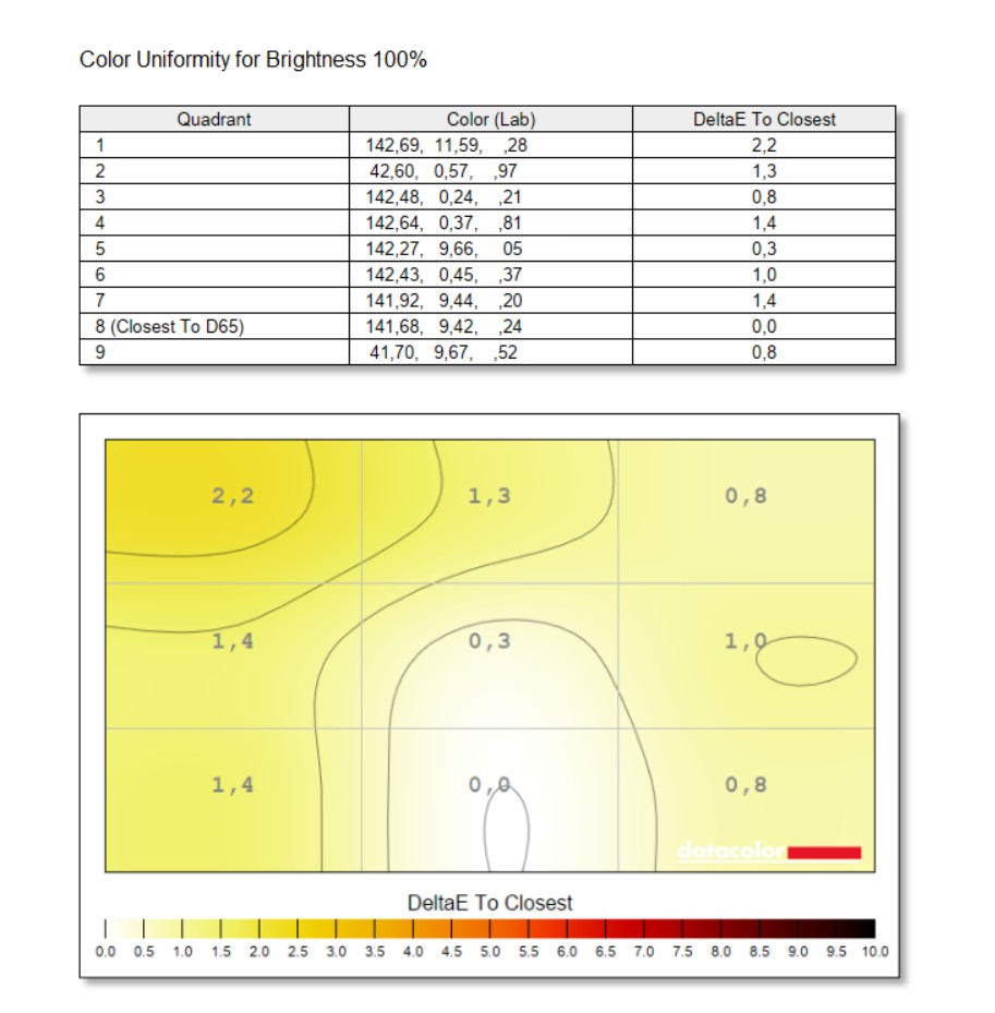 Powyżej możecie rzucić okiem na odchylenia DeltaE dla jednolitości kolorów, które to wahają się w zakresie 0.8 – 2.2, co oznacza niewielkie odchylenia. Jako że odchylenia DeltaE poniżej 3 są akceptowalne dla większości zastosowań, choć mogą być zauważalne w profesjonalnej pracy graficznej, nie musimy się nimi martwić. Sprawa ma się podobnie z jasnością ekranu, bo wynosi ona maksymalnie 4% różnicy zależnie od partii ekranu, co samo w sobie jest świetnym wynikiem. Z kolei poniżej możecie podejrzeć dokładność odwzorowania kolorów, która maksymalnie wynosi 5,85 ochylenia, ale średnio już “tylko” 1,47, co oznacza dobrą dokładność kolorów i to do półprofesjonalnych zastosowań graficznych.