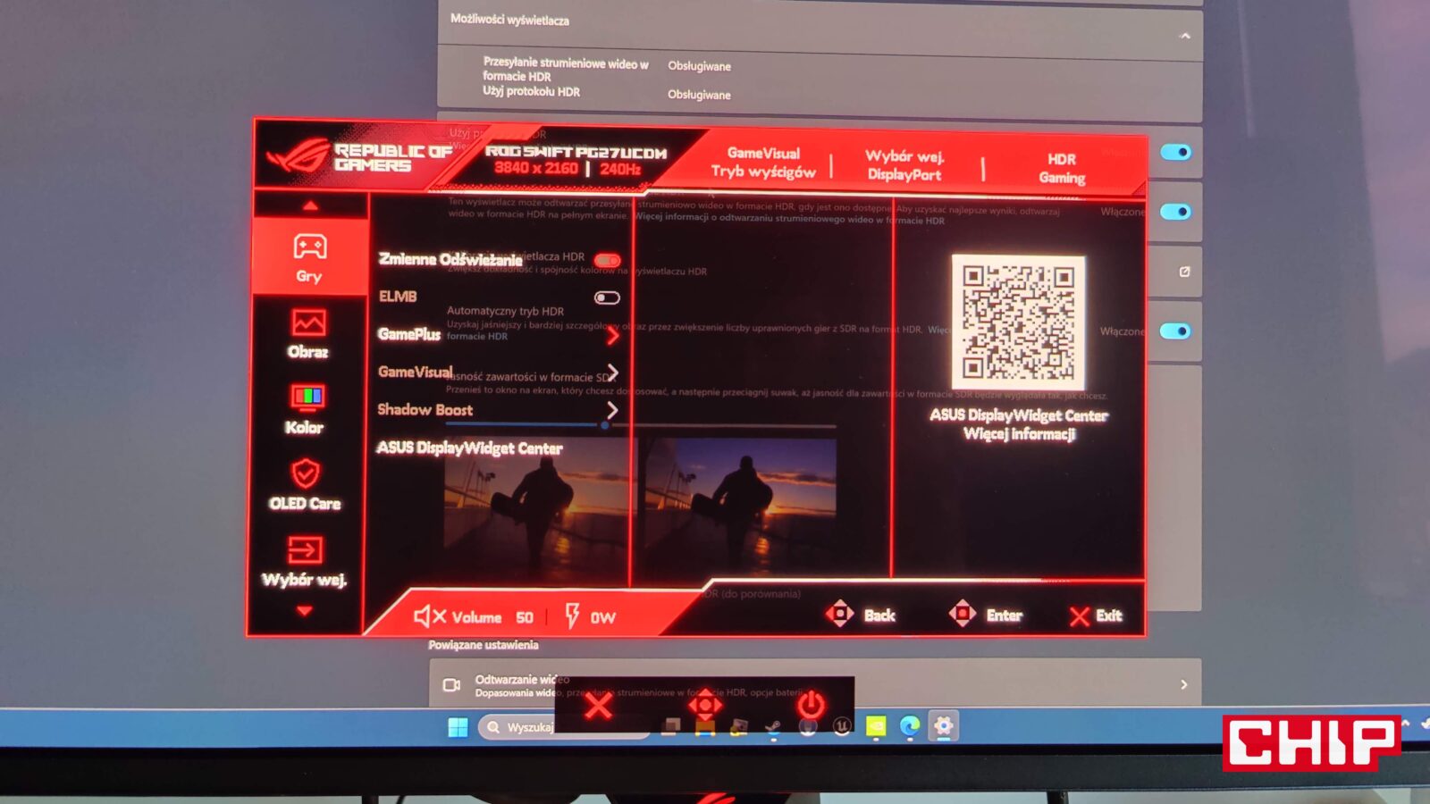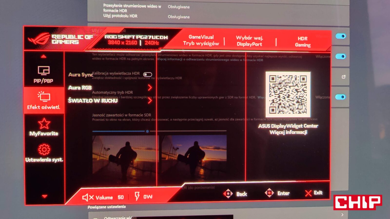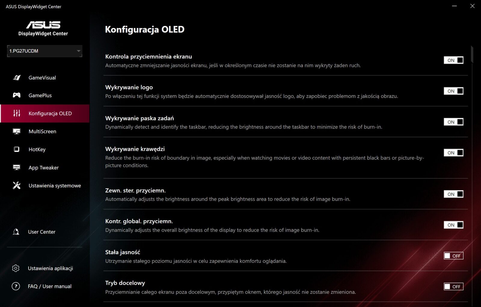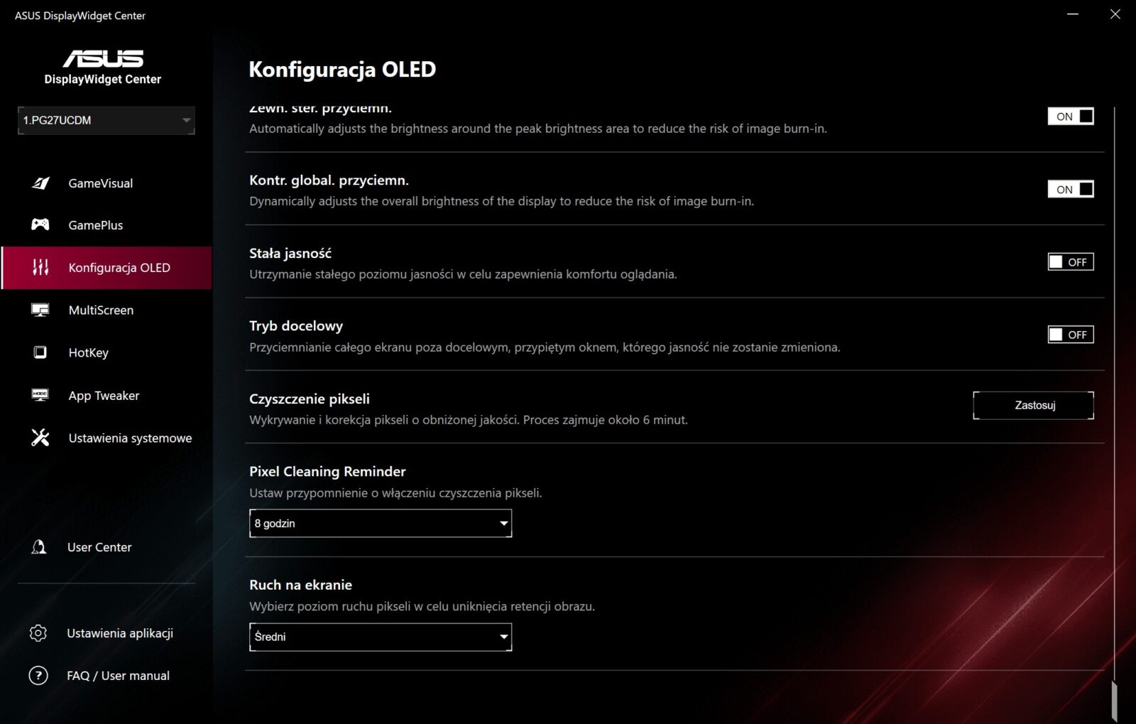 Możliwości ustawień jest zresztą w ROG Swift OLED PG27UCDM od groma, bo monitor oferuje wiele przydatnych funkcji dla graczy (standardowe wyświetlanie celownika, czy podbijanie cieni), wspiera KVM (możliwość zarządzania dwoma komputerami jednym zestawem myszki i klawiatury), tryb PIP/PBP (jednoczesne wyświetlanie sygnału z dwóch maszyn) czy samo oświetlenie z podziałem na logo na pleckach (wspiera Aura Sync) oraz wyłącznie czerwone podświetlenie podstawki (o ile z niej korzystacie). Poradzicie sobie nawet przy kompletnej nieznajomości angielskiego, bo choć zwykle tłumaczenia na język polski w tego typu OSD czy aplikacjach są na tyle mierne, że wręcz zmuszają nas do angielskiego, tak ASUS podszedł do spolszczenia na poważnie i rzeczywiście wszystkie funkcje da się zrozumieć.