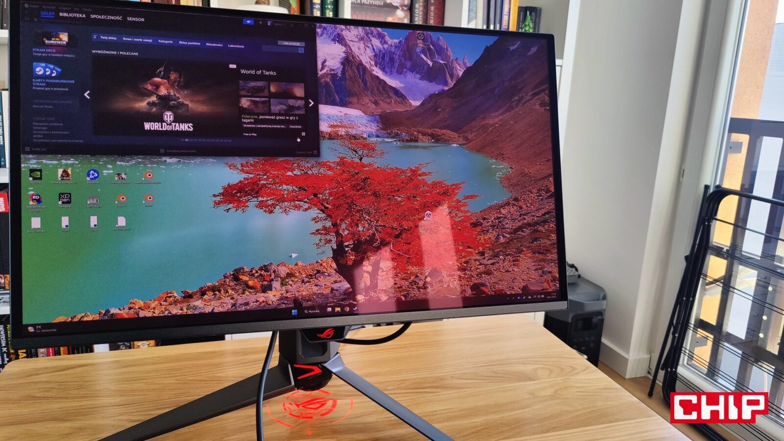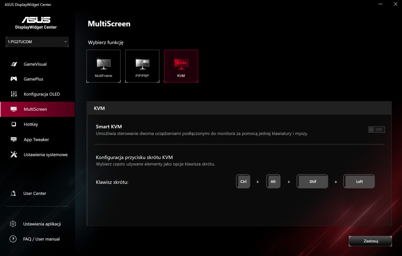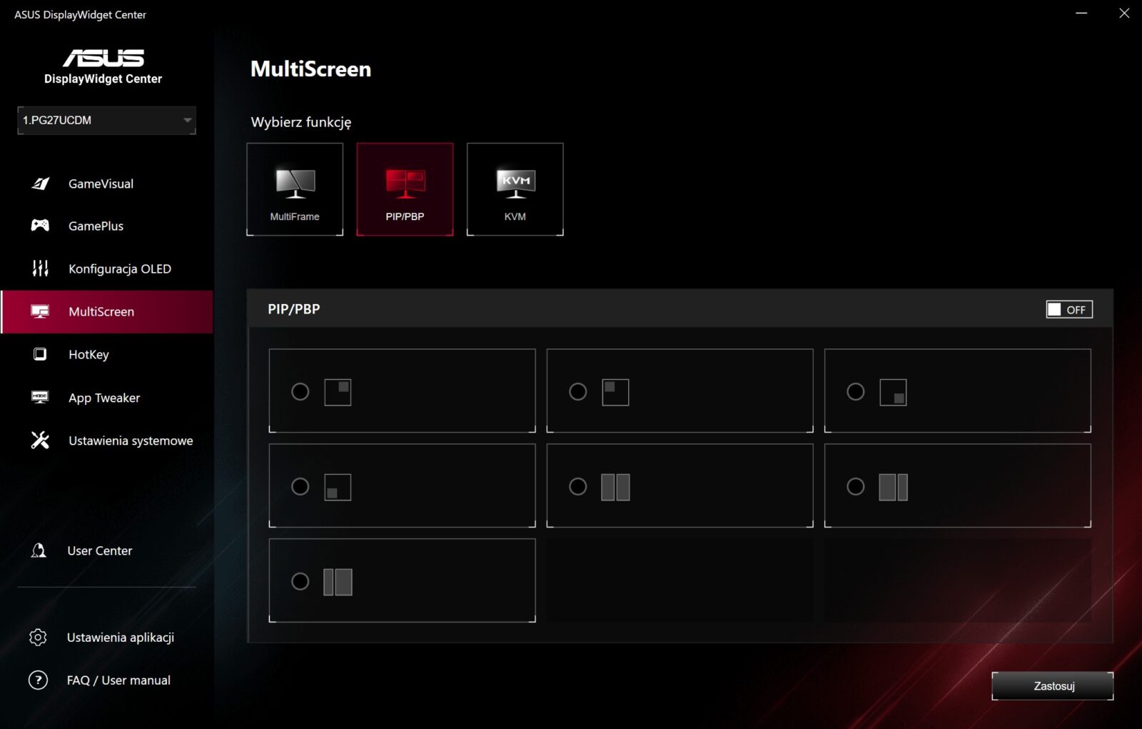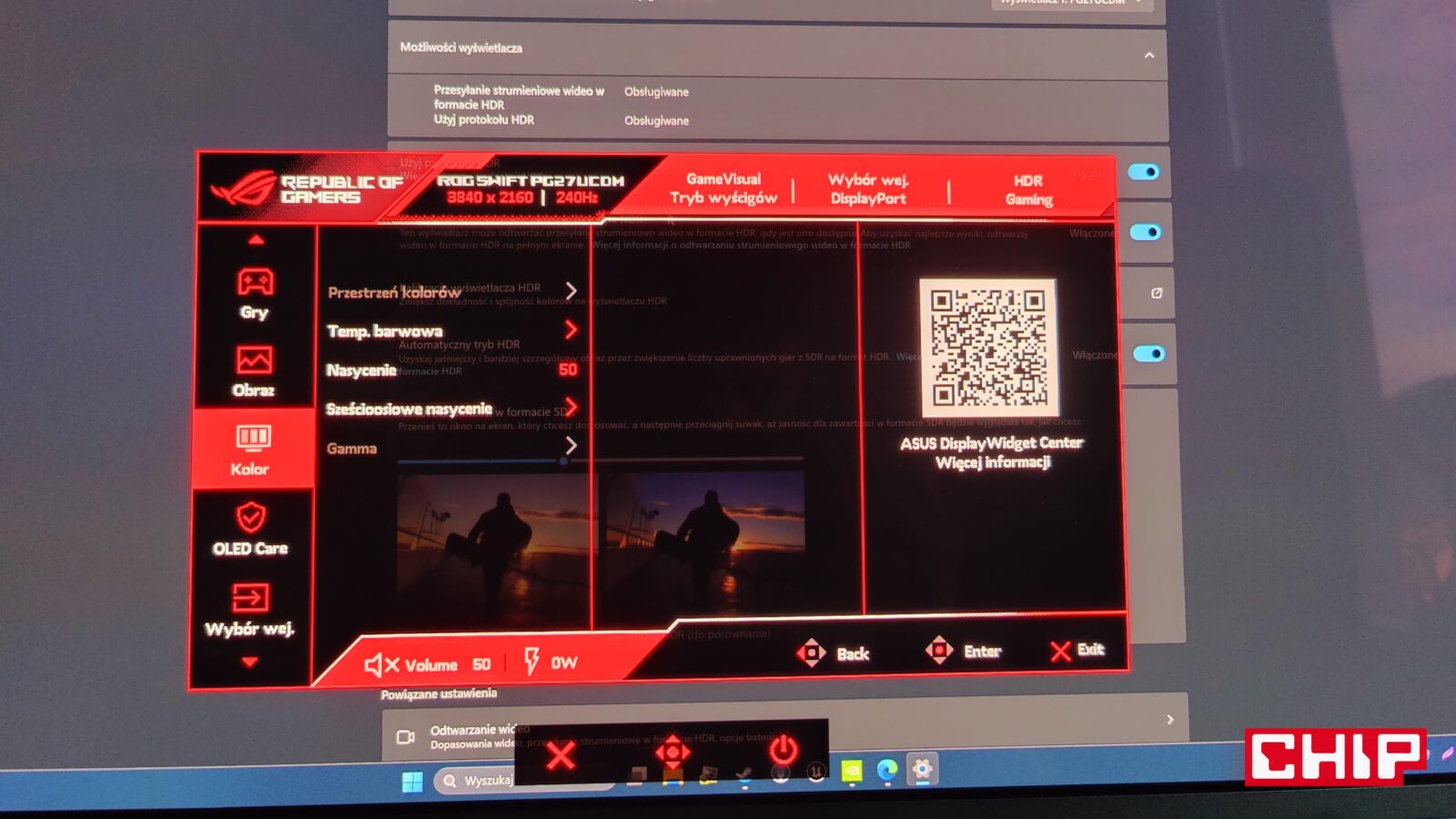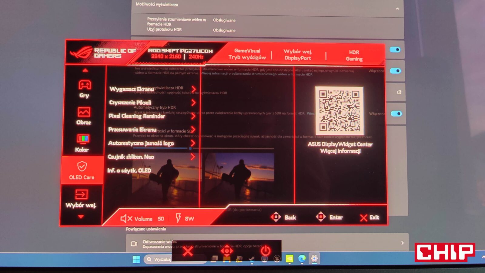 Możliwości ustawień jest zresztą w ROG Swift OLED PG27UCDM od groma, bo monitor oferuje wiele przydatnych funkcji dla graczy (standardowe wyświetlanie celownika, czy podbijanie cieni), wspiera KVM (możliwość zarządzania dwoma komputerami jednym zestawem myszki i klawiatury), tryb PIP/PBP (jednoczesne wyświetlanie sygnału z dwóch maszyn) czy samo oświetlenie z podziałem na logo na pleckach (wspiera Aura Sync) oraz wyłącznie czerwone podświetlenie podstawki (o ile z niej korzystacie). Poradzicie sobie nawet przy kompletnej nieznajomości angielskiego, bo choć zwykle tłumaczenia na język polski w tego typu OSD czy aplikacjach są na tyle mierne, że wręcz zmuszają nas do angielskiego, tak ASUS podszedł do spolszczenia na poważnie i rzeczywiście wszystkie funkcje da się zrozumieć.