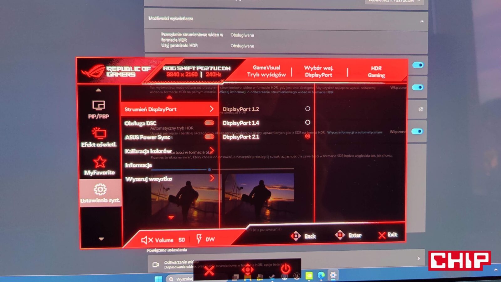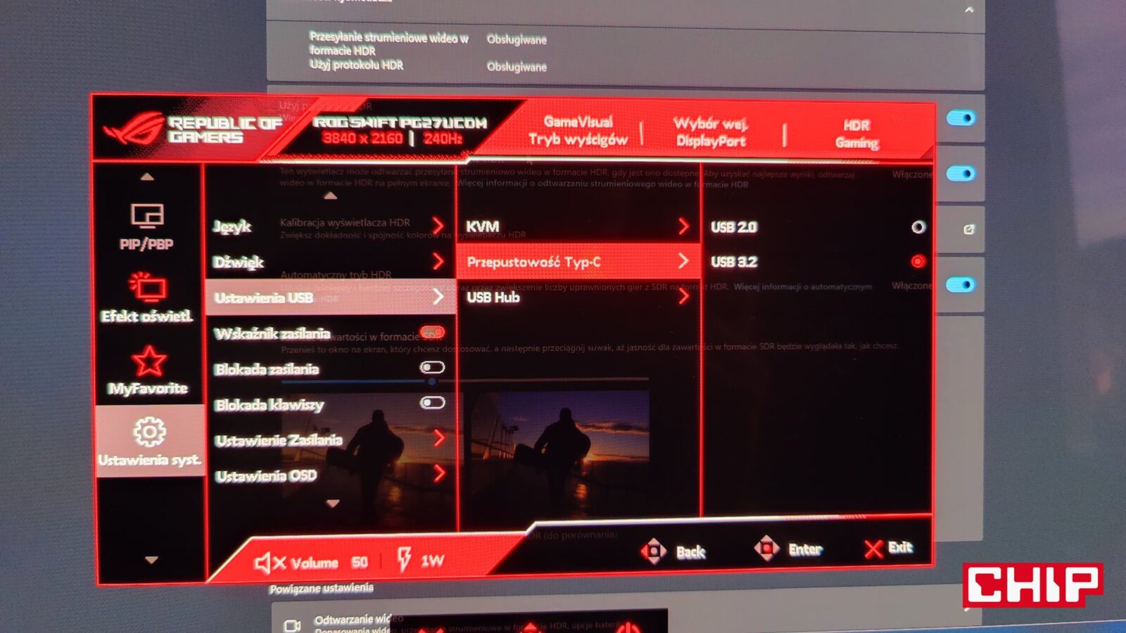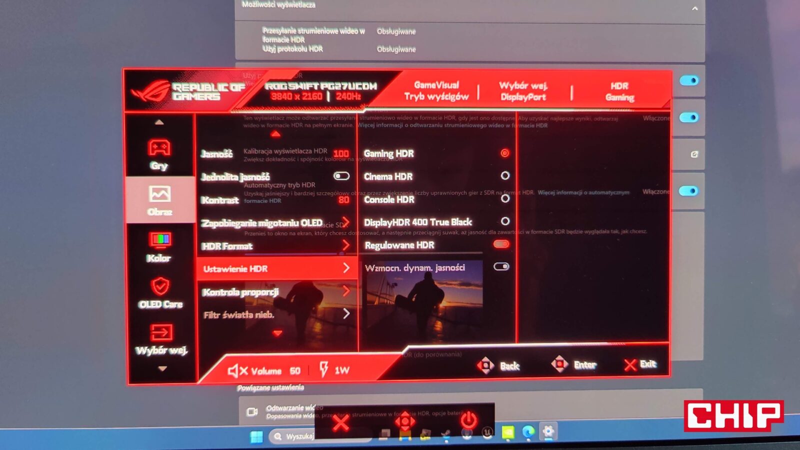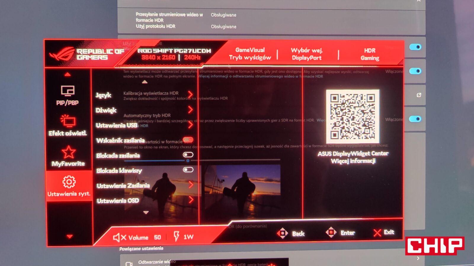 Możliwości ustawień jest zresztą w ROG Swift OLED PG27UCDM od groma, bo monitor oferuje wiele przydatnych funkcji dla graczy (standardowe wyświetlanie celownika, czy podbijanie cieni), wspiera KVM (możliwość zarządzania dwoma komputerami jednym zestawem myszki i klawiatury), tryb PIP/PBP (jednoczesne wyświetlanie sygnału z dwóch maszyn) czy samo oświetlenie z podziałem na logo na pleckach (wspiera Aura Sync) oraz wyłącznie czerwone podświetlenie podstawki (o ile z niej korzystacie). Poradzicie sobie nawet przy kompletnej nieznajomości angielskiego, bo choć zwykle tłumaczenia na język polski w tego typu OSD czy aplikacjach są na tyle mierne, że wręcz zmuszają nas do angielskiego, tak ASUS podszedł do spolszczenia na poważnie i rzeczywiście wszystkie funkcje da się zrozumieć.