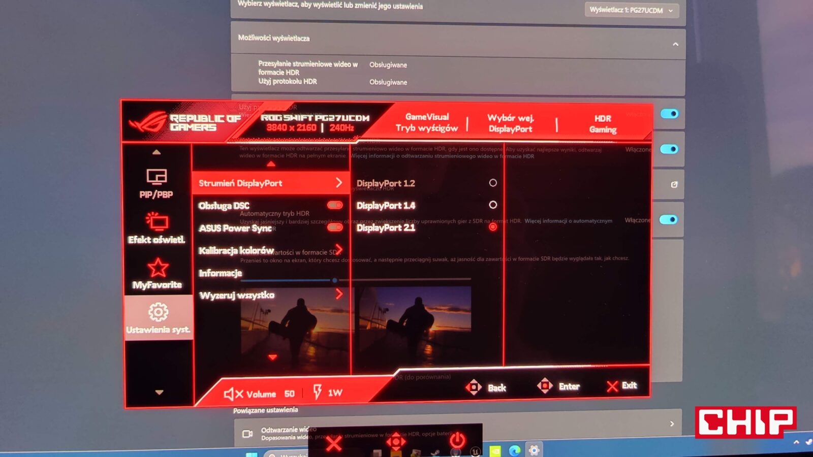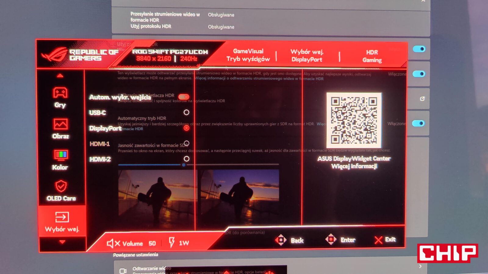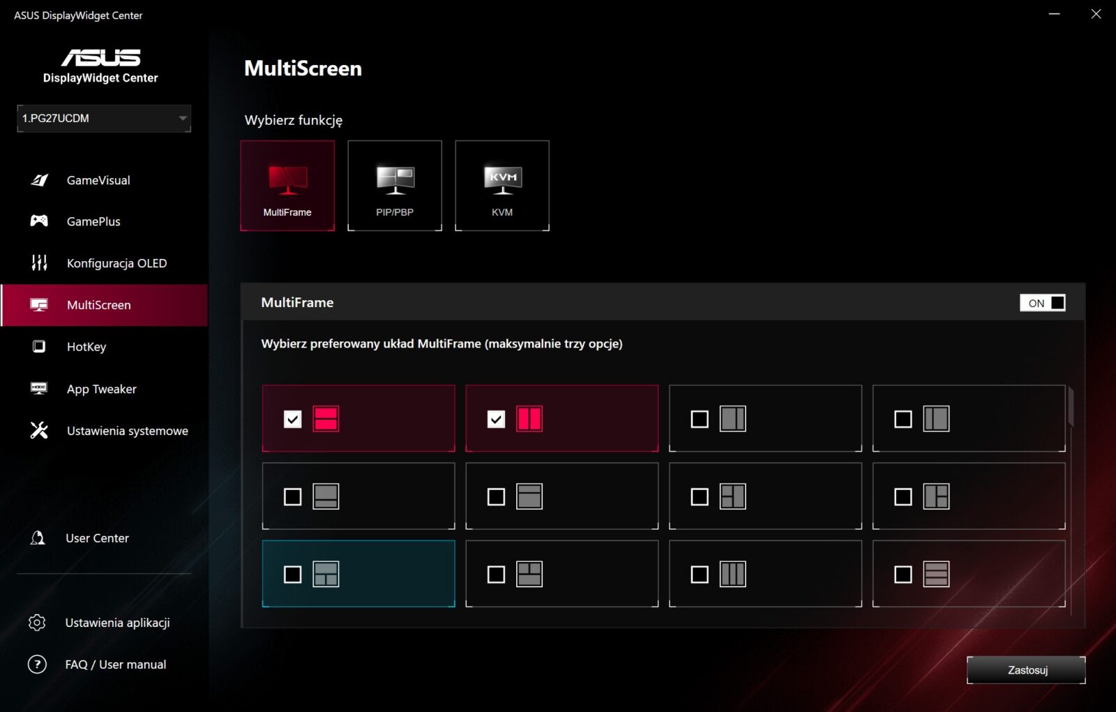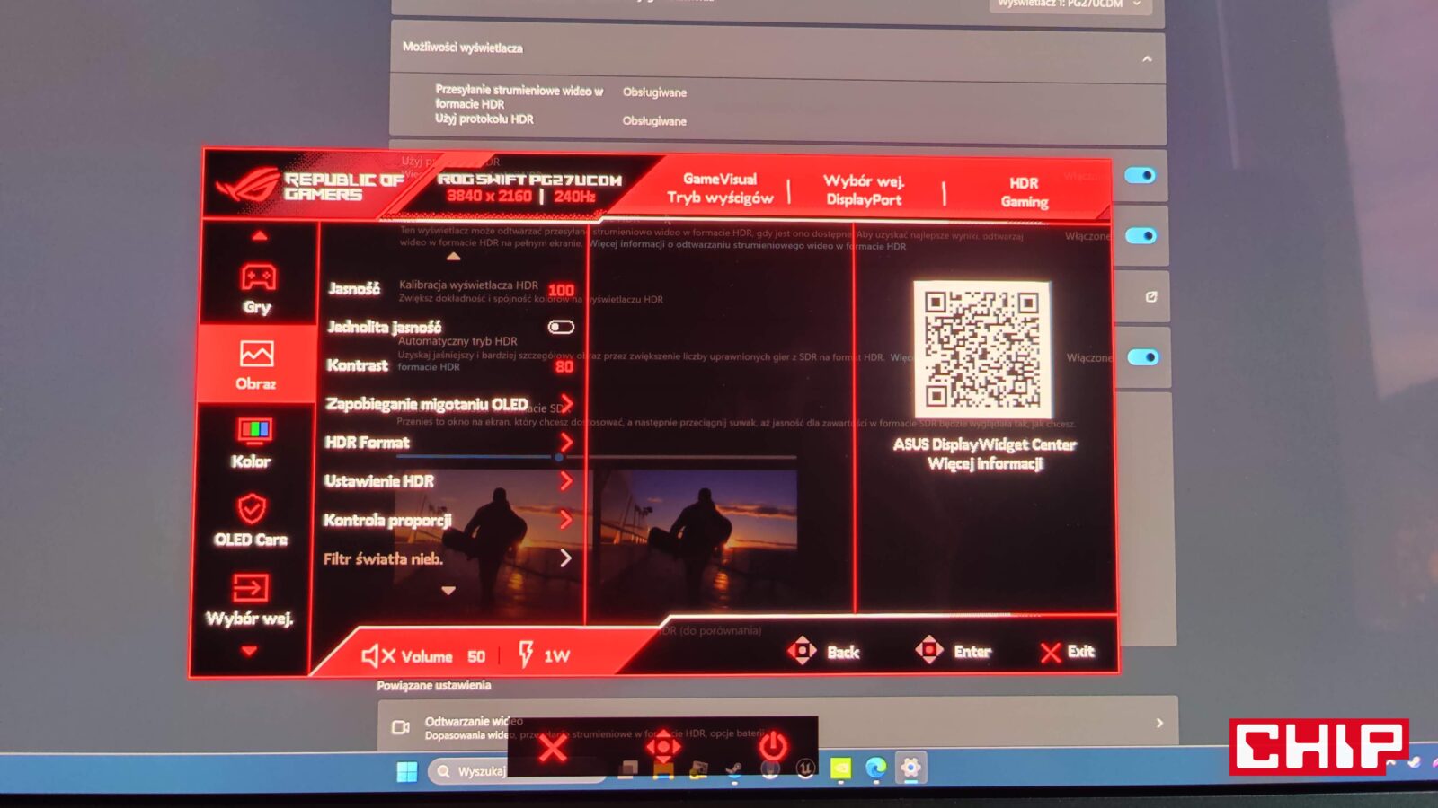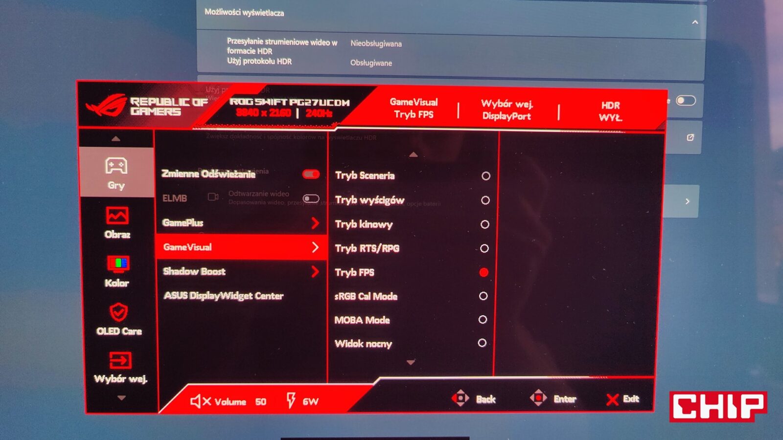 Możliwości ustawień jest zresztą w ROG Swift OLED PG27UCDM od groma, bo monitor oferuje wiele przydatnych funkcji dla graczy (standardowe wyświetlanie celownika, czy podbijanie cieni), wspiera KVM (możliwość zarządzania dwoma komputerami jednym zestawem myszki i klawiatury), tryb PIP/PBP (jednoczesne wyświetlanie sygnału z dwóch maszyn) czy samo oświetlenie z podziałem na logo na pleckach (wspiera Aura Sync) oraz wyłącznie czerwone podświetlenie podstawki (o ile z niej korzystacie). Poradzicie sobie nawet przy kompletnej nieznajomości angielskiego, bo choć zwykle tłumaczenia na język polski w tego typu OSD czy aplikacjach są na tyle mierne, że wręcz zmuszają nas do angielskiego, tak ASUS podszedł do spolszczenia na poważnie i rzeczywiście wszystkie funkcje da się zrozumieć.