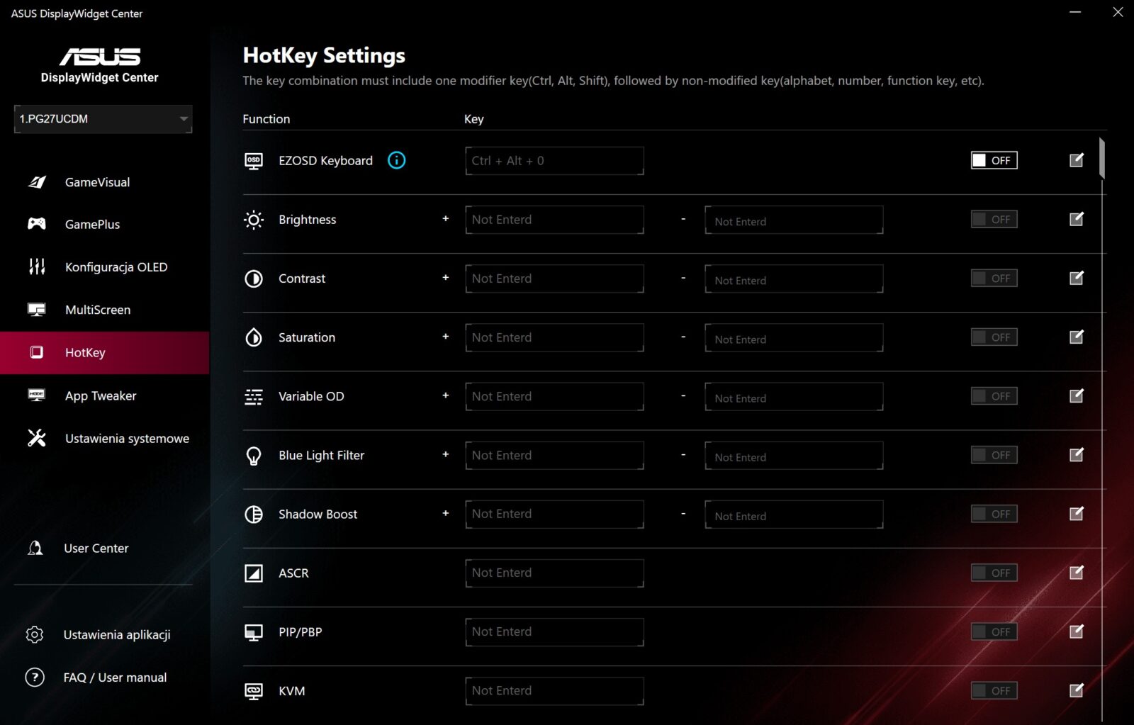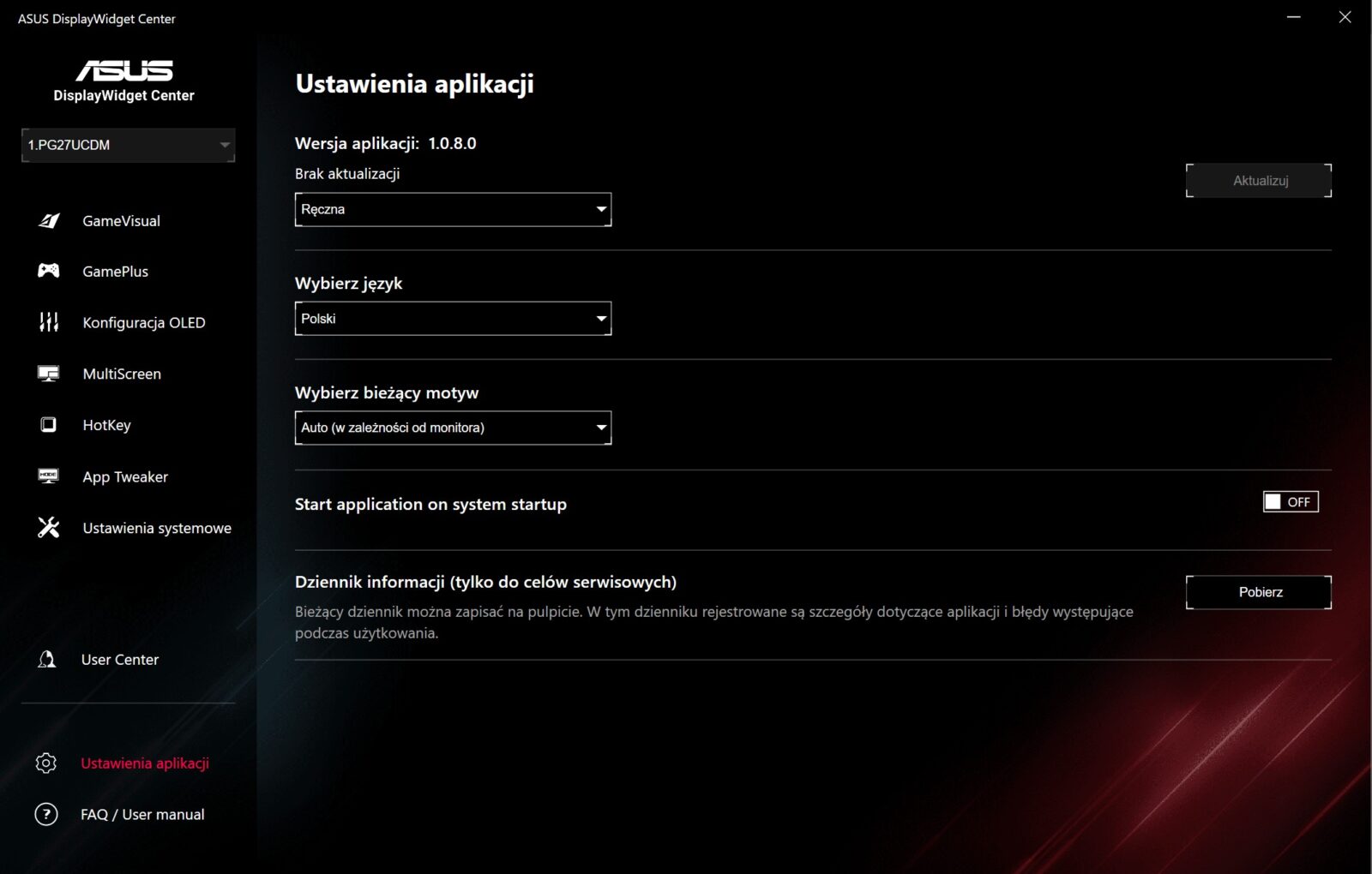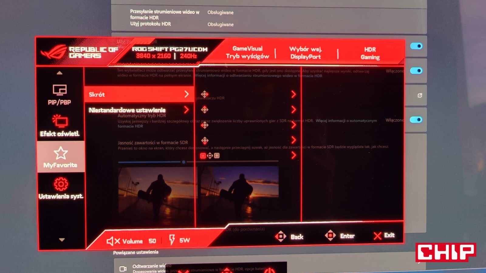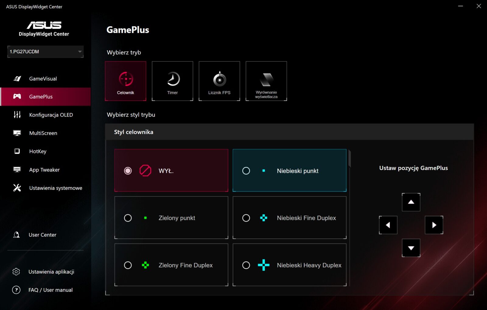 Możliwości ustawień jest zresztą w ROG Swift OLED PG27UCDM od groma, bo monitor oferuje wiele przydatnych funkcji dla graczy (standardowe wyświetlanie celownika, czy podbijanie cieni), wspiera KVM (możliwość zarządzania dwoma komputerami jednym zestawem myszki i klawiatury), tryb PIP/PBP (jednoczesne wyświetlanie sygnału z dwóch maszyn) czy samo oświetlenie z podziałem na logo na pleckach (wspiera Aura Sync) oraz wyłącznie czerwone podświetlenie podstawki (o ile z niej korzystacie). Poradzicie sobie nawet przy kompletnej nieznajomości angielskiego, bo choć zwykle tłumaczenia na język polski w tego typu OSD czy aplikacjach są na tyle mierne, że wręcz zmuszają nas do angielskiego, tak ASUS podszedł do spolszczenia na poważnie i rzeczywiście wszystkie funkcje da się zrozumieć.