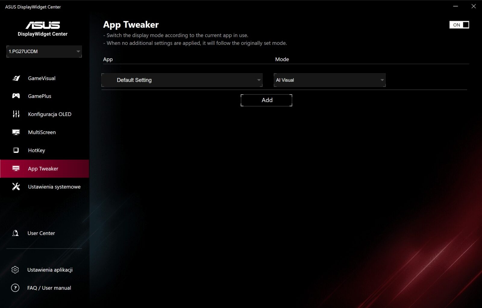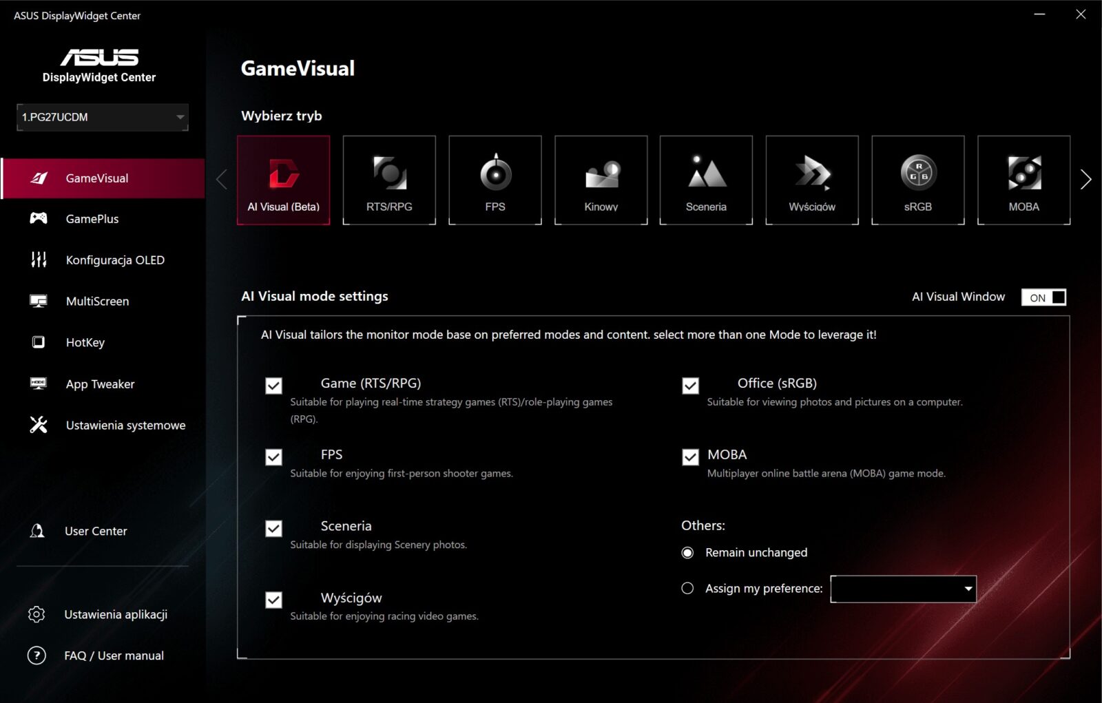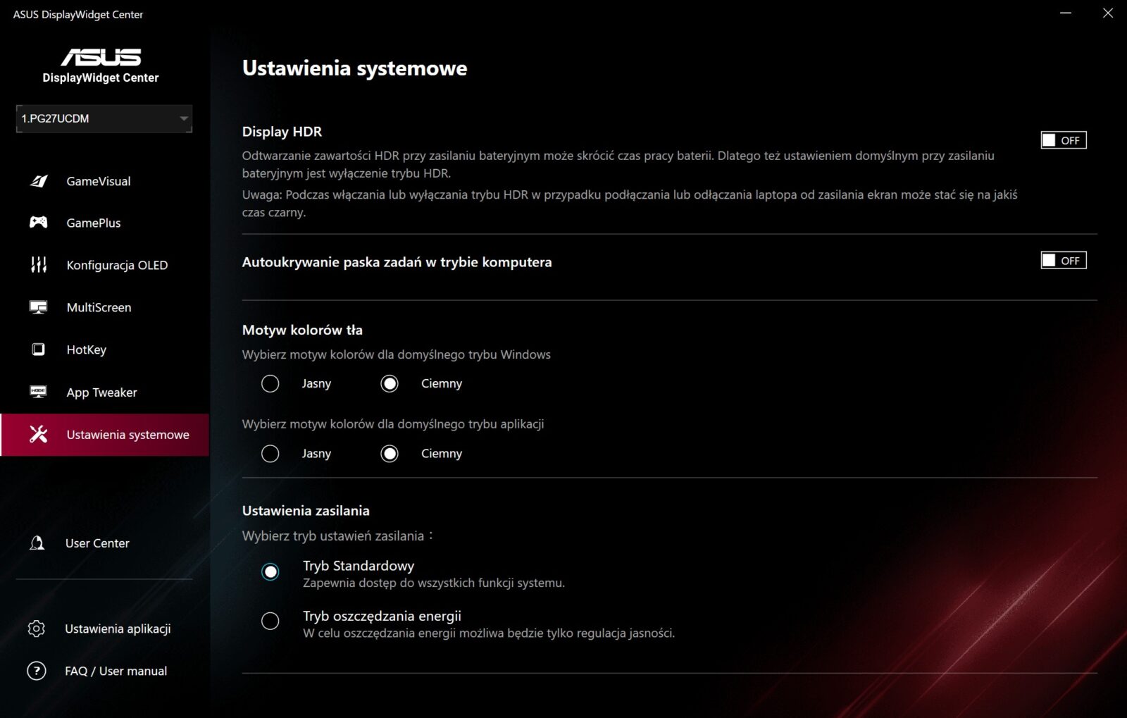 Dzięki temu macie spać spokojnie co do trwałości matrycy w tym monitorze (3-letnia gwarancja zresztą to podkreśla), a jeśli jakakolwiek z funkcji zacznie sprawiać problemy, to dostosujecie lub wyłączycie ją zarówno z monitorowego OSD, jak i aplikacji DisplayWidget Center, którą możecie pobrać na swoje komputery, aby ułatwić proces dostosowywania najważniejszych ustawień. W apce nie znajdziecie jednak wszystkich opcji przeniesionych z poziomu OSD (głównie tych “niskopoziomowych”), choć z drugiej strony tylko z jej poziomu będziecie mogli aktywować automatyczne dobieranie trybu zależnie od wyświetlanej treści (opcja AI Visual w fazie beta), przypisać wiele ustawień do konkretnych kombinacji klawiszy czy dostosować motyw kolorów tła dla systemu Windows oraz innego oprogramowania, a aplikacja ASUSa automatycznie wybierze tryb jasny lub ciemny w ich ustawieniach.