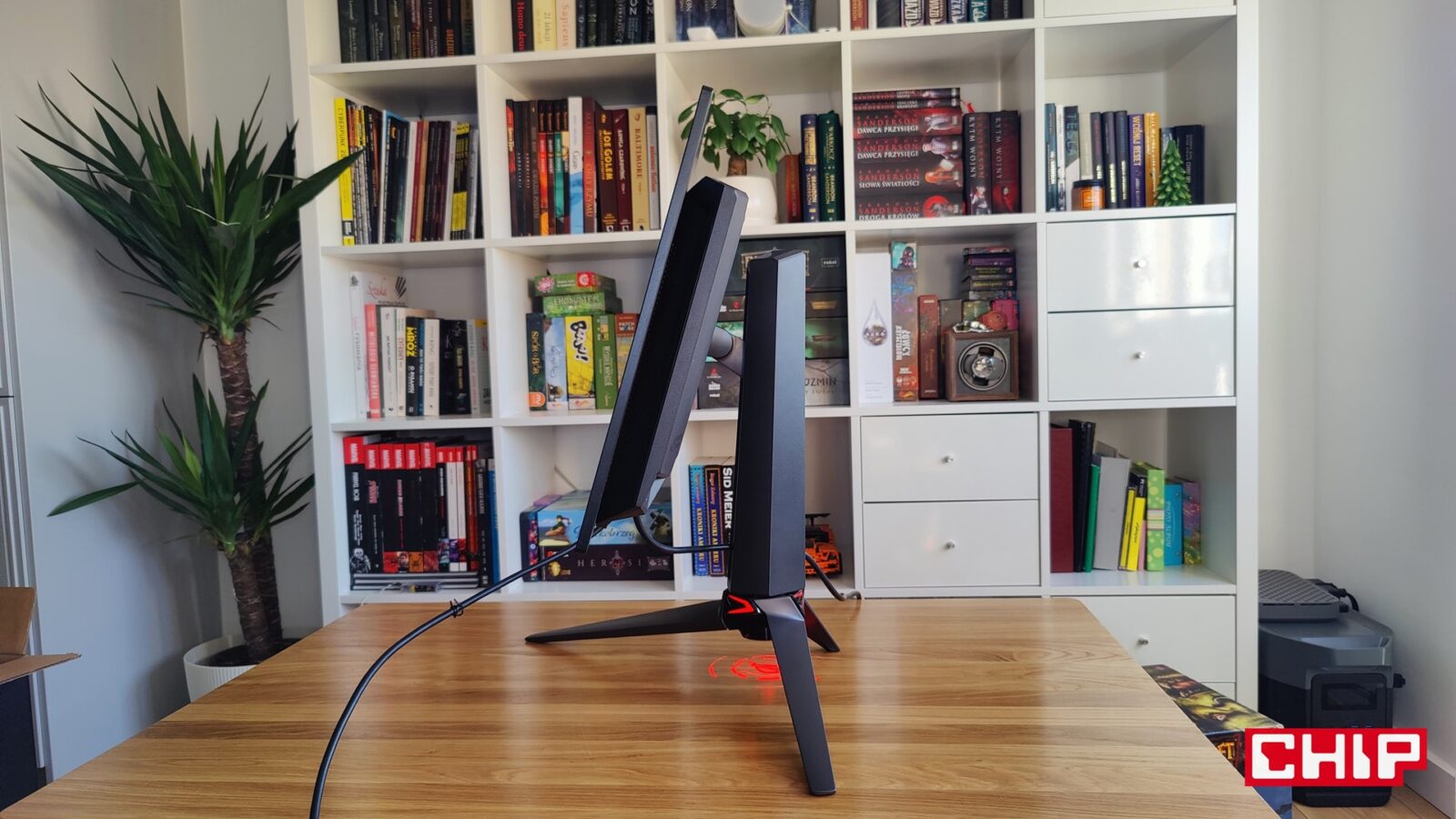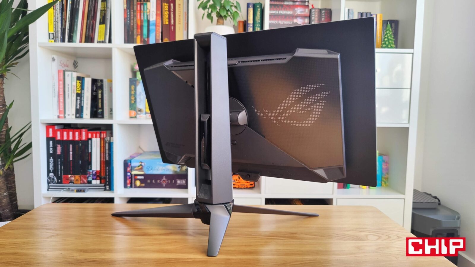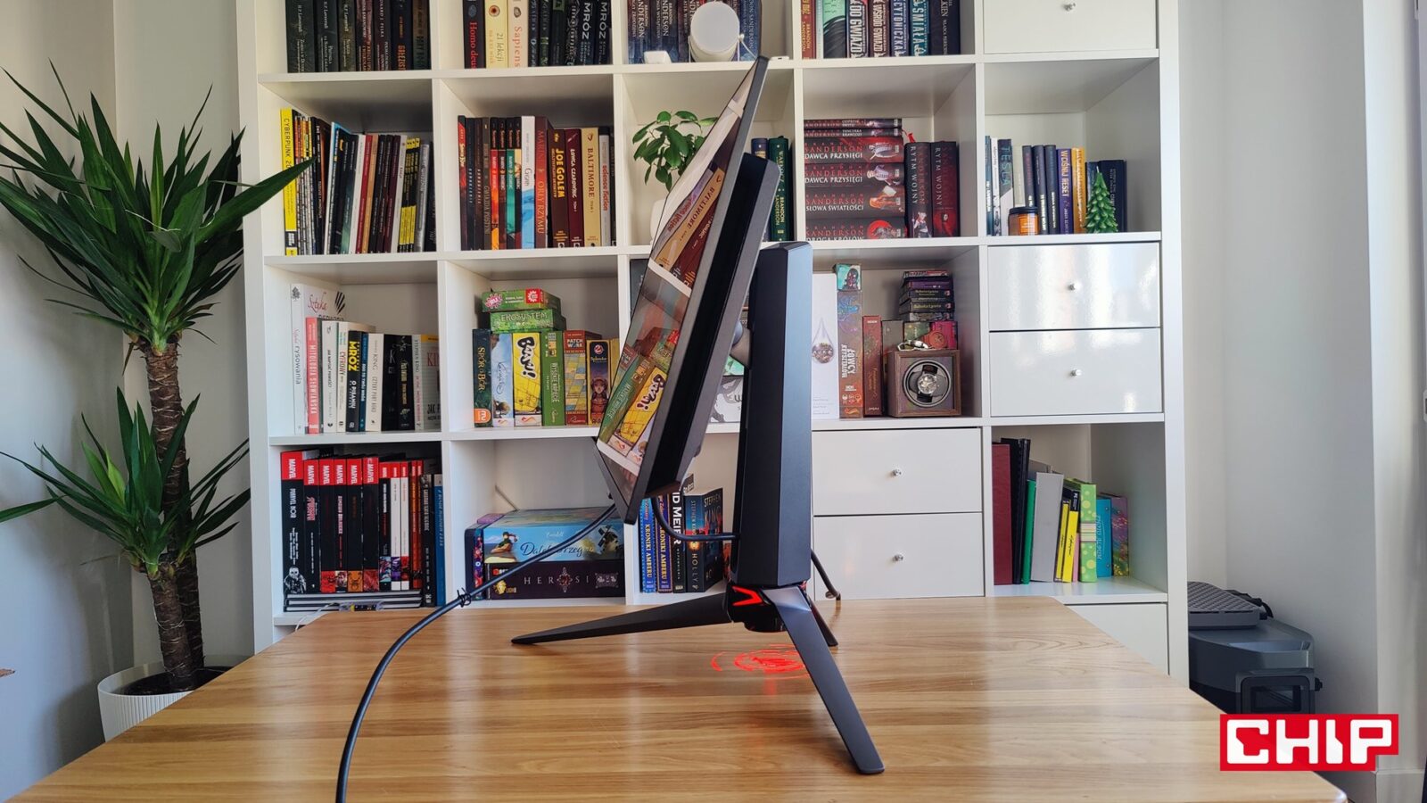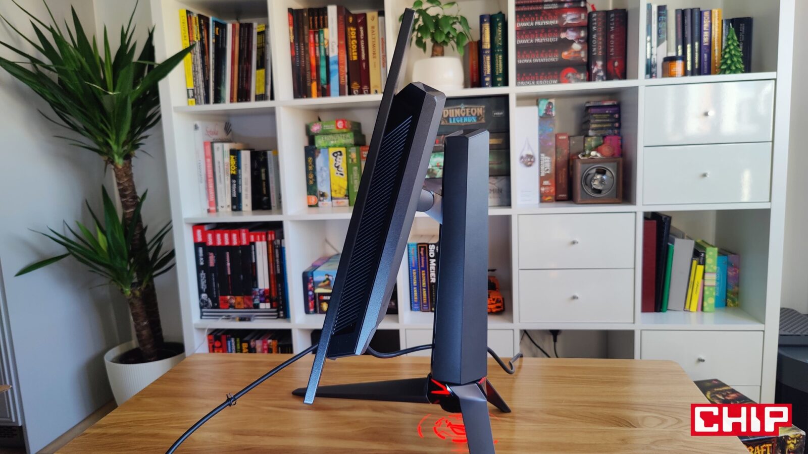 Sam monitor nie jest z kolei najcieńszym modelem, którego mogliście zobaczyć w swoim życiu – od tyłu wygląda, jak połączenie cieniutkiego panelu z wielką, bo grubą na ponad dwa centymetry obudową na całą elektronikę. Trudno jednak się temu dziwić, bo jest napakowany pod kurek w zaawansowaną technologię, a tym samym wymaga odpowiednio wydajnego chłodzenia, co przejawia się m.in. w licznych otworach wentylacyjnych. Nie jest to jednak wada, bo w gruncie rzeczy jest to jeden z najlepiej prezentujących się monitorów “od tyłu”, z jakimi miałem do czynienia, a wielkie podświetlane logo producenta (zbudowane z małych kwadracików i obsługujące Aura Sync) tylko dodaje temu modelowi odpowiedniego charakteru.