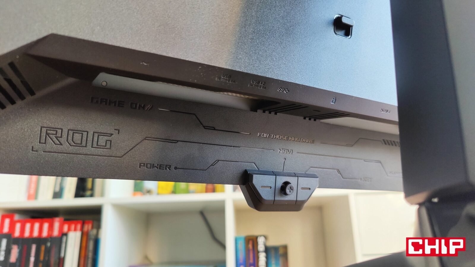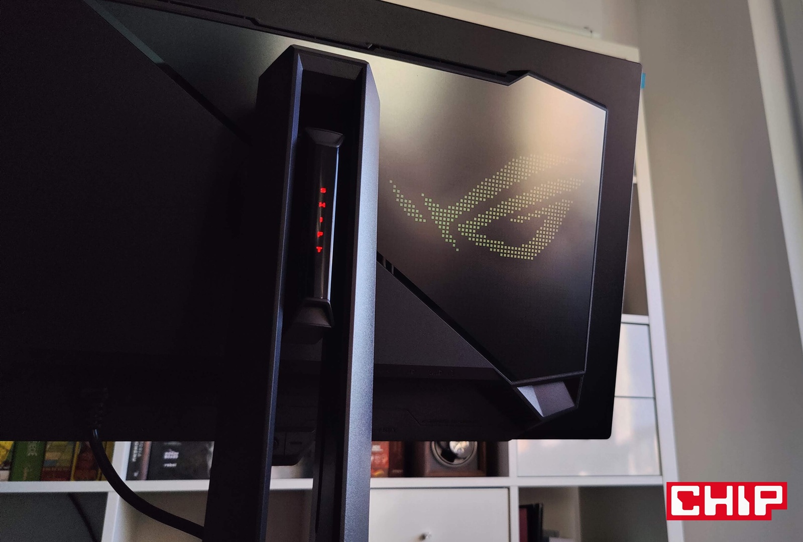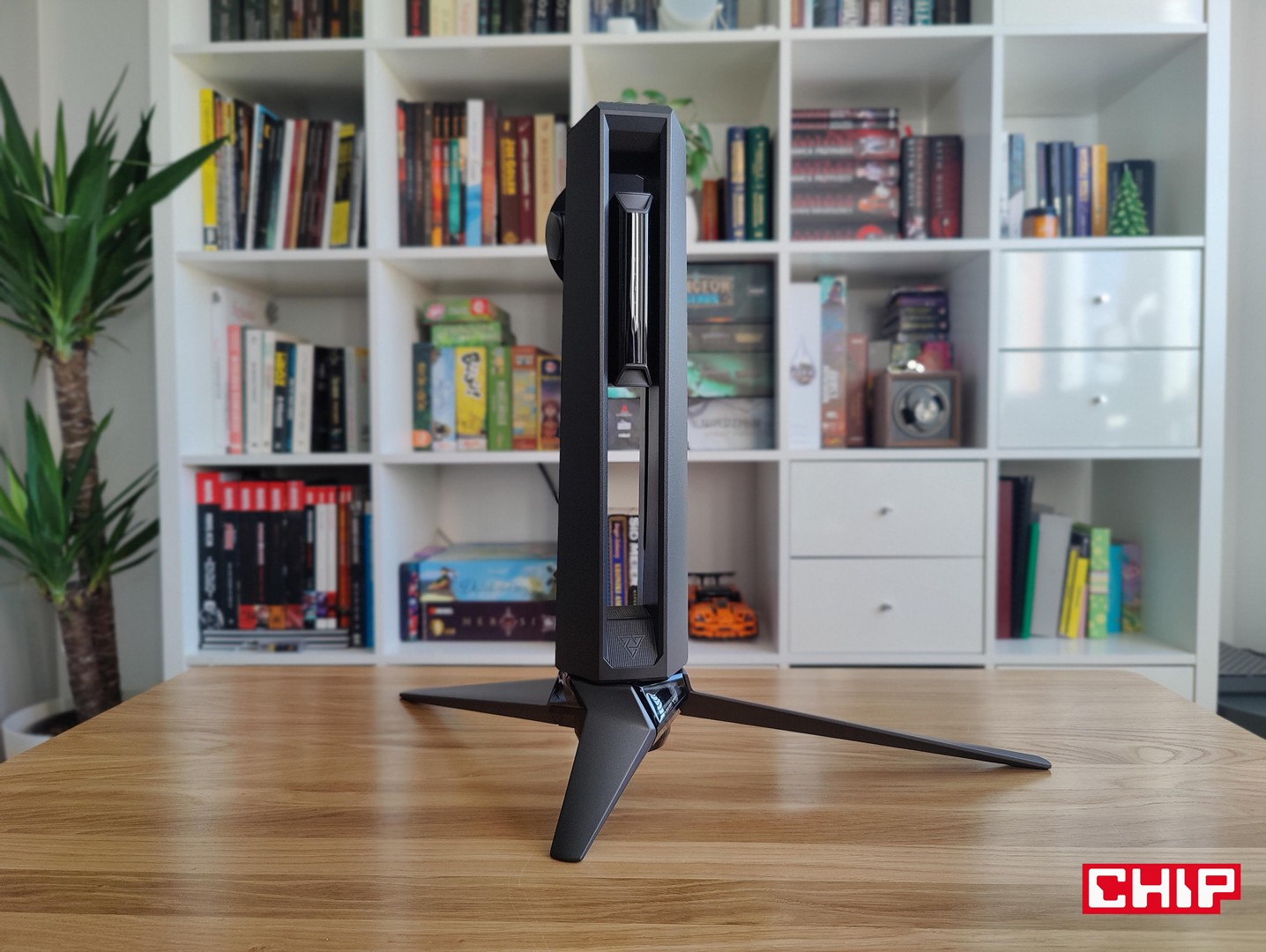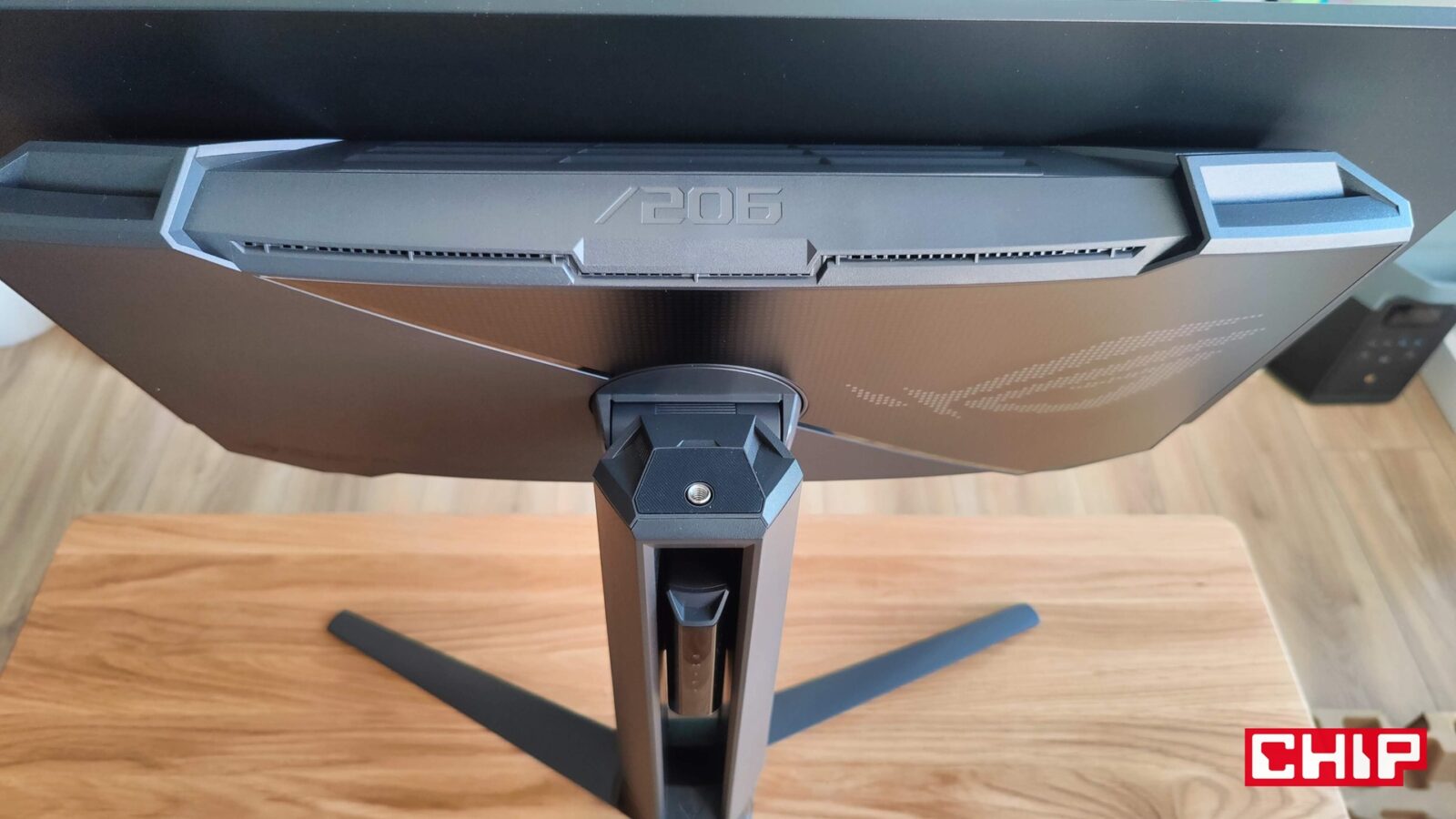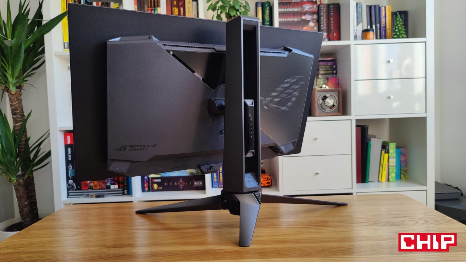Sam monitor nie jest z kolei najcieńszym modelem, którego mogliście zobaczyć w swoim życiu – od tyłu wygląda, jak połączenie cieniutkiego panelu z wielką, bo grubą na ponad dwa centymetry obudową na całą elektronikę. Trudno jednak się temu dziwić, bo jest napakowany pod kurek w zaawansowaną technologię, a tym samym wymaga odpowiednio wydajnego chłodzenia, co przejawia się m.in. w licznych otworach wentylacyjnych. Nie jest to jednak wada, bo w gruncie rzeczy jest to jeden z najlepiej prezentujących się monitorów “od tyłu”, z jakimi miałem do czynienia, a wielkie podświetlane logo producenta (zbudowane z małych kwadracików i obsługujące Aura Sync) tylko dodaje temu modelowi odpowiedniego charakteru.